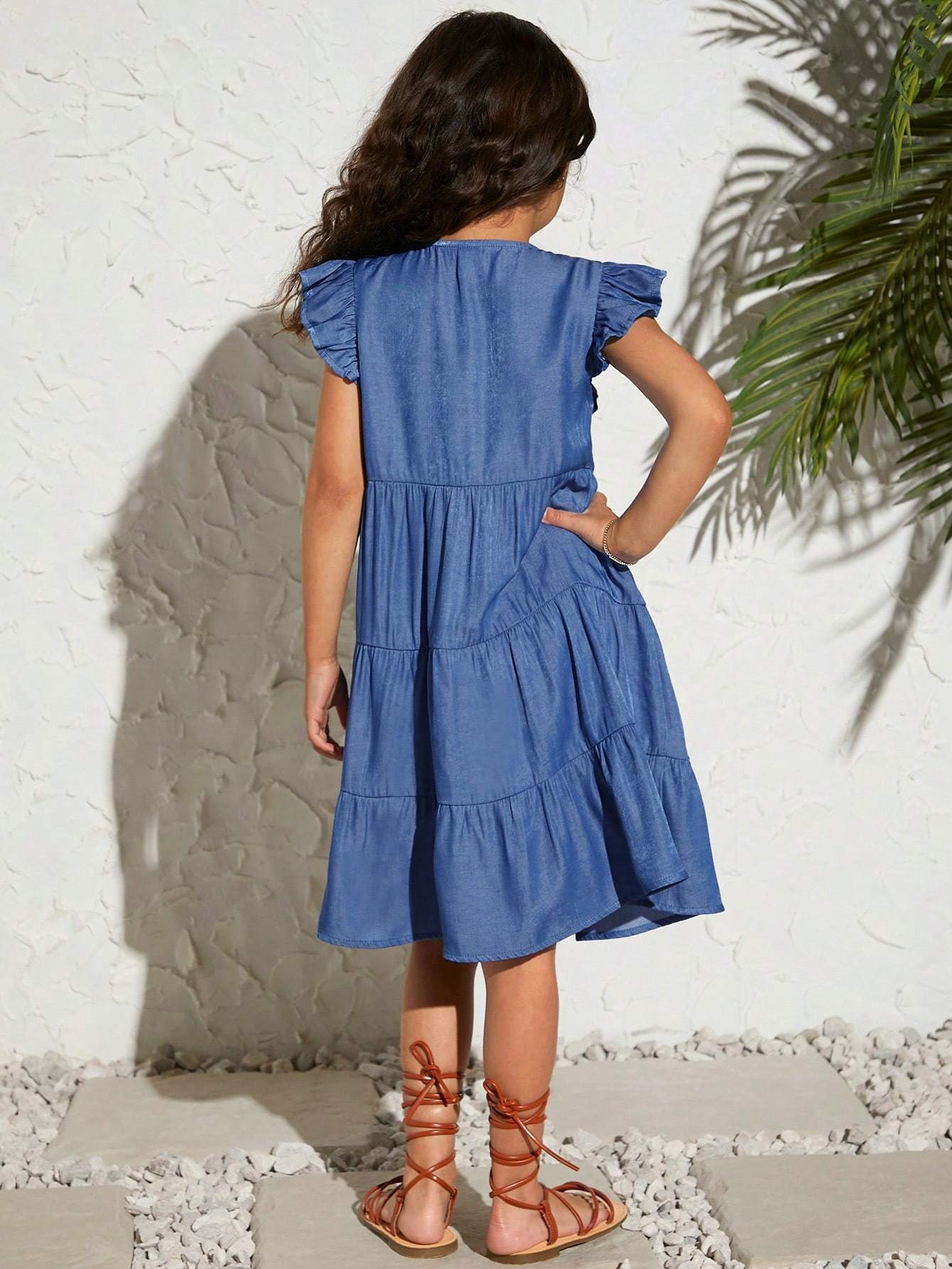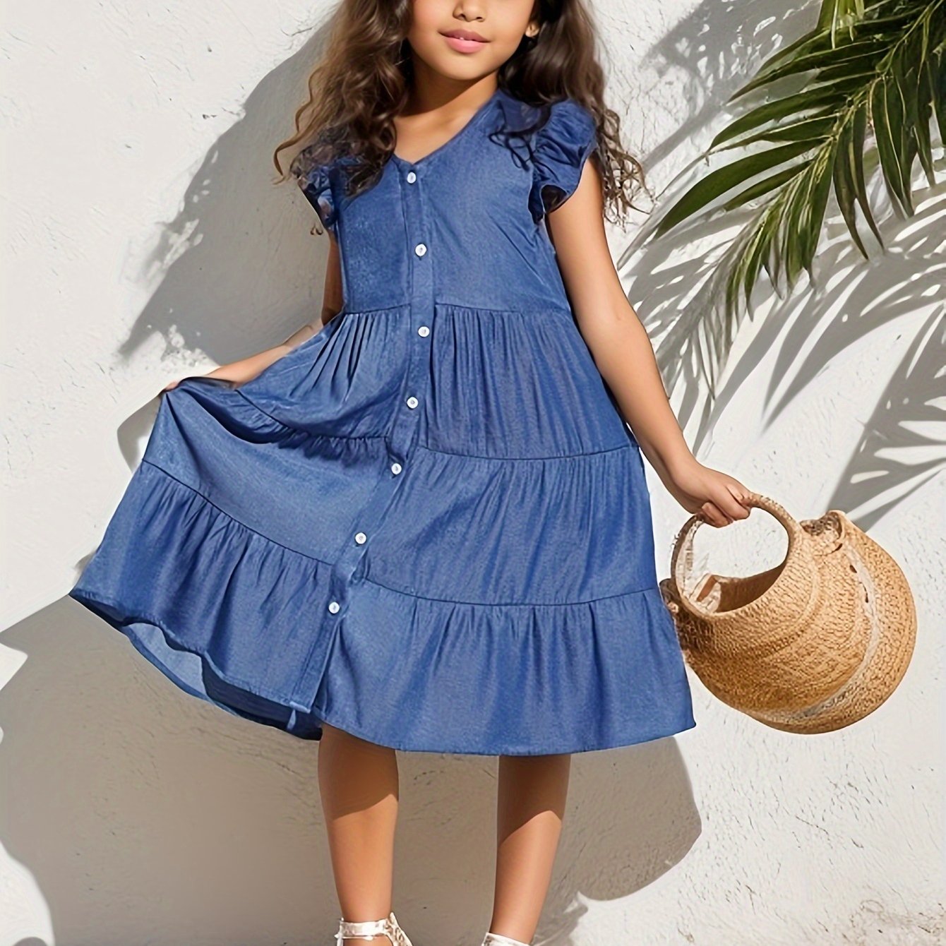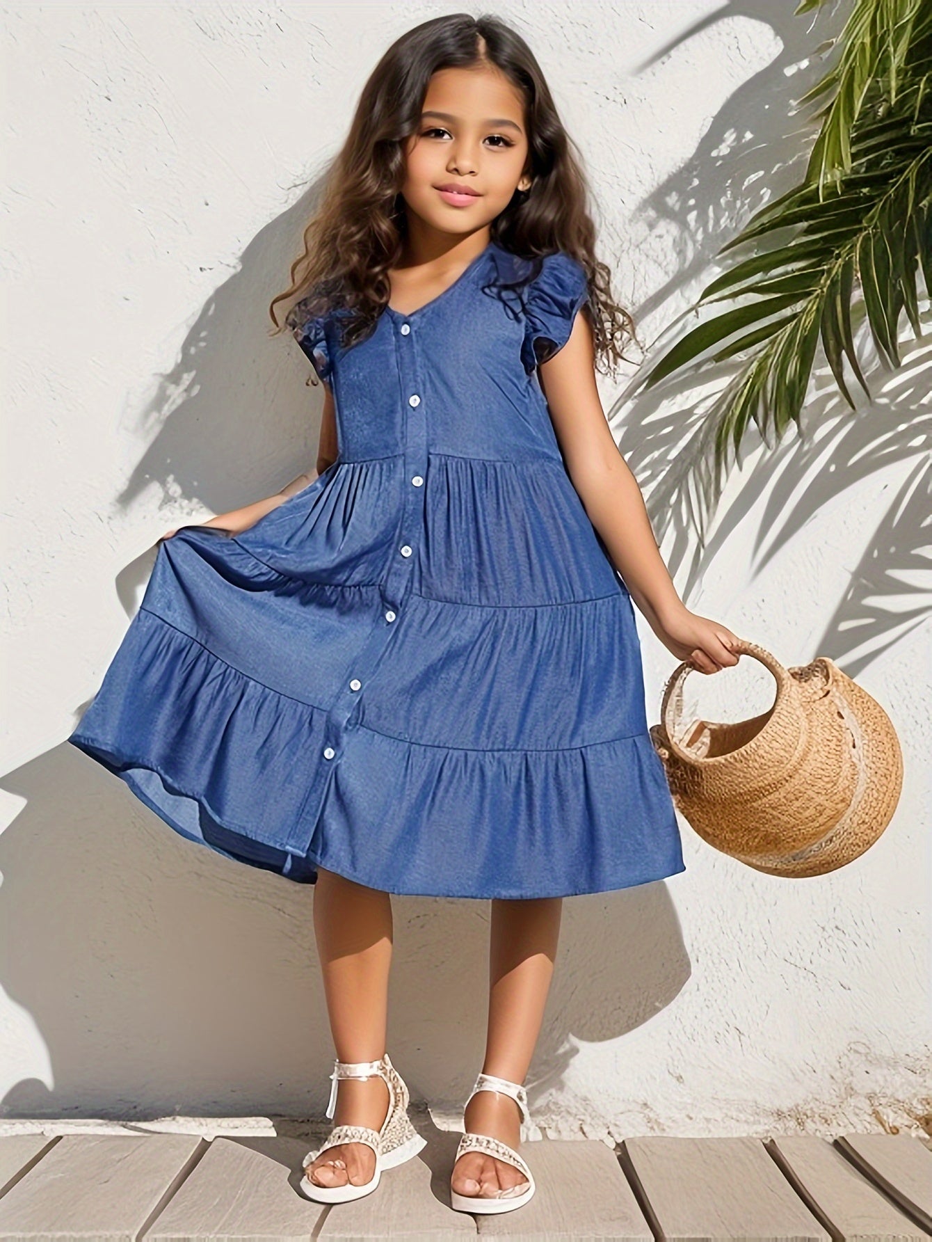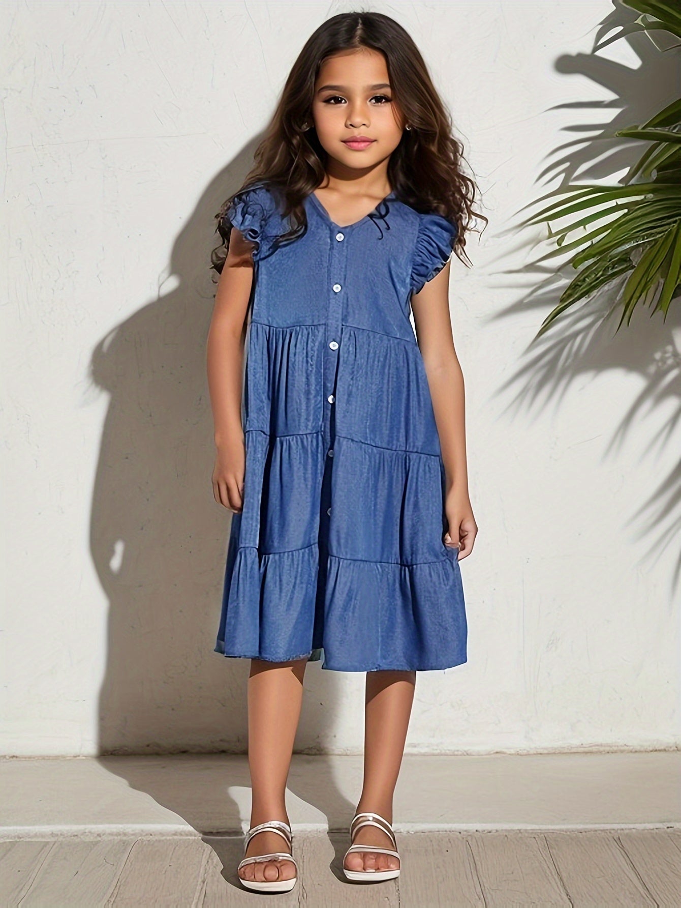 Fake denim fabric Youngsters Tween Girls' Everyday Casual Loose Fit Denim-Look V-Neck Short Sleeve Dress