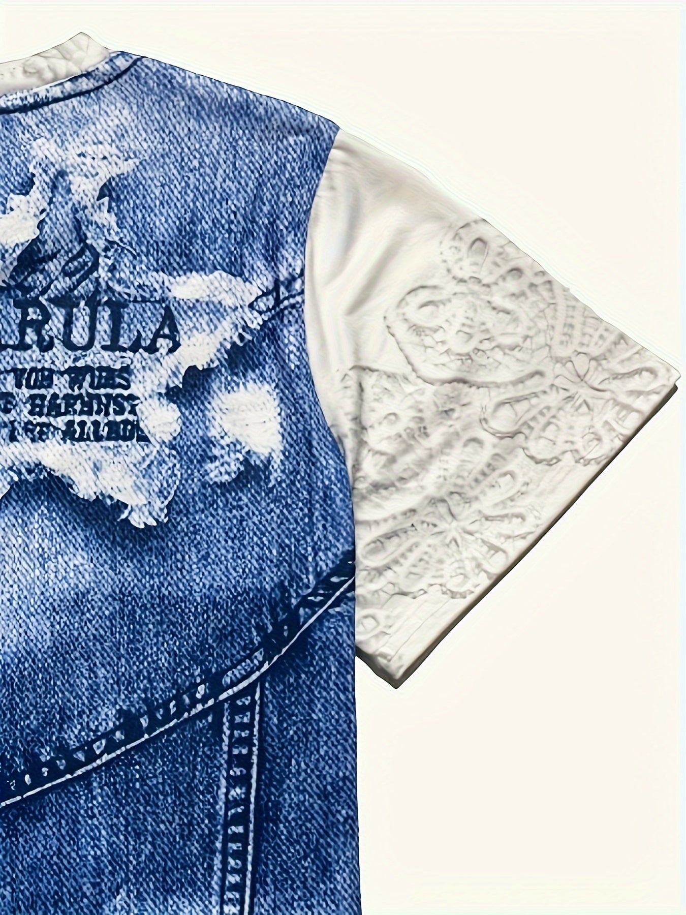 Faux Denim Print Crew Neck T-shirt, Casual Short Sleeve Top For Spring & Summer, Women's Clothing
