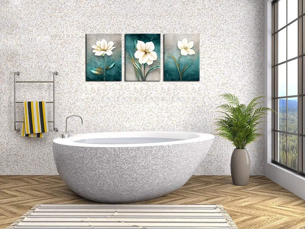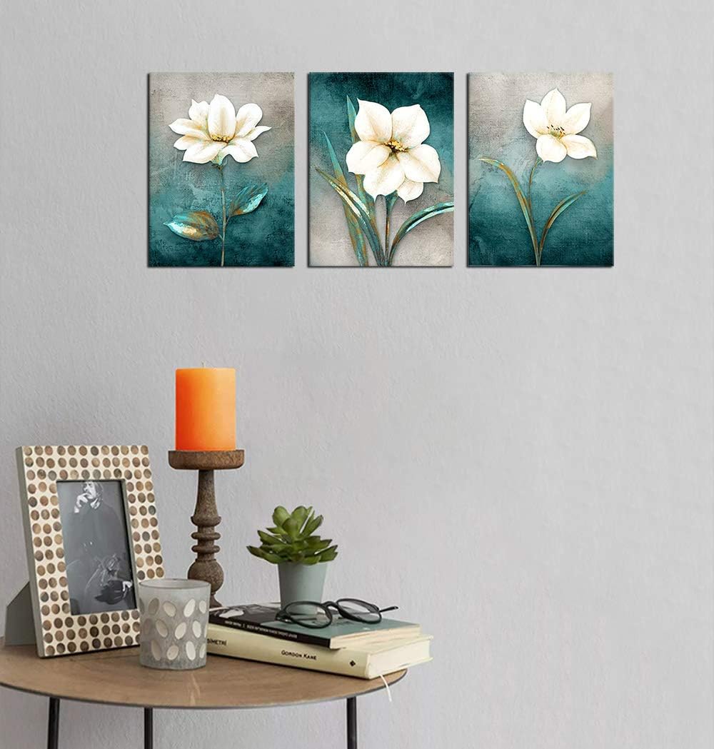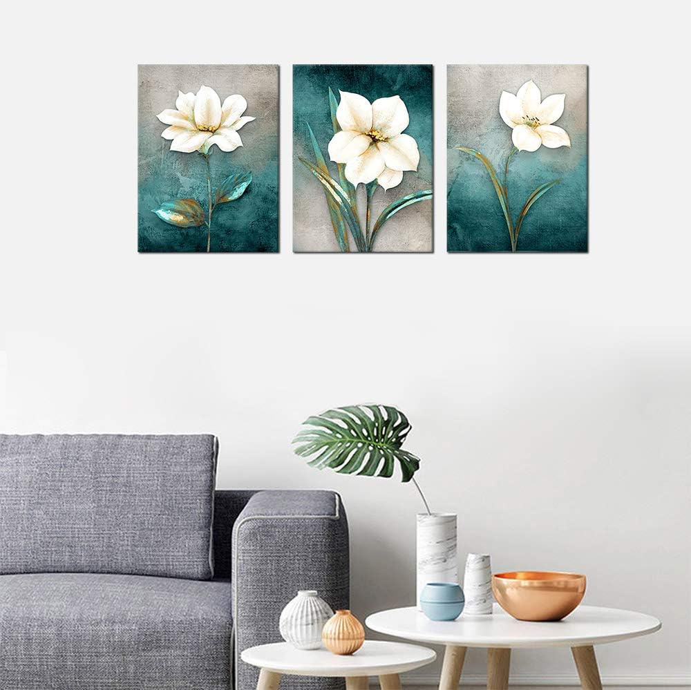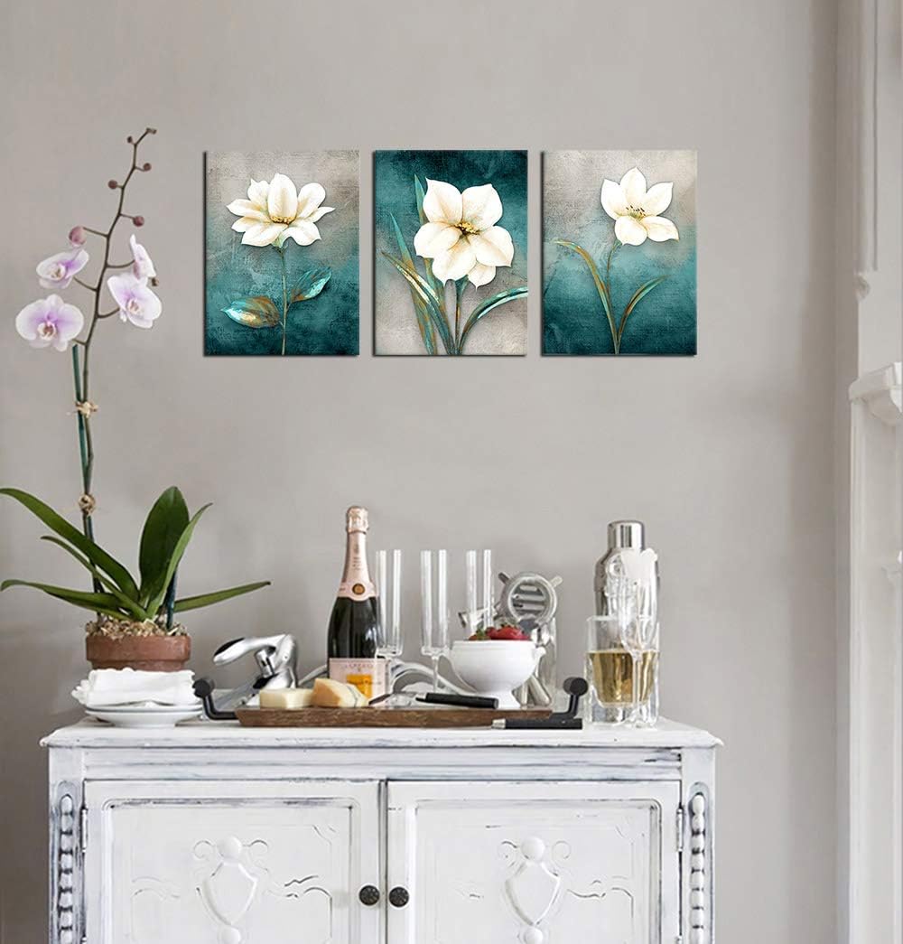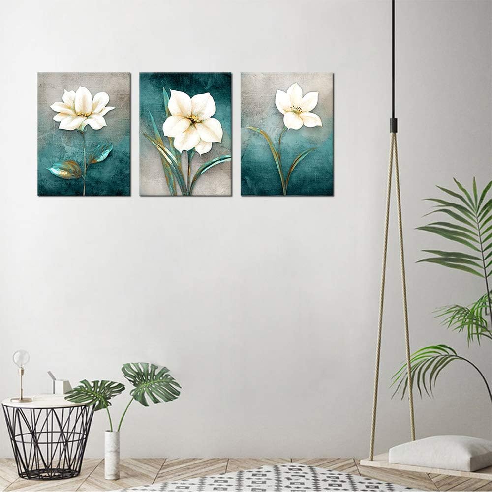 Flower Canvas Wall Art Cream White Floral Wall Decor Turquoise Tealish Grey Background Canvas Picture Modern Rustic Artwork Bathroom Bedroom Living Room Home Office Decoration 12" x 16" x 3 Pieces