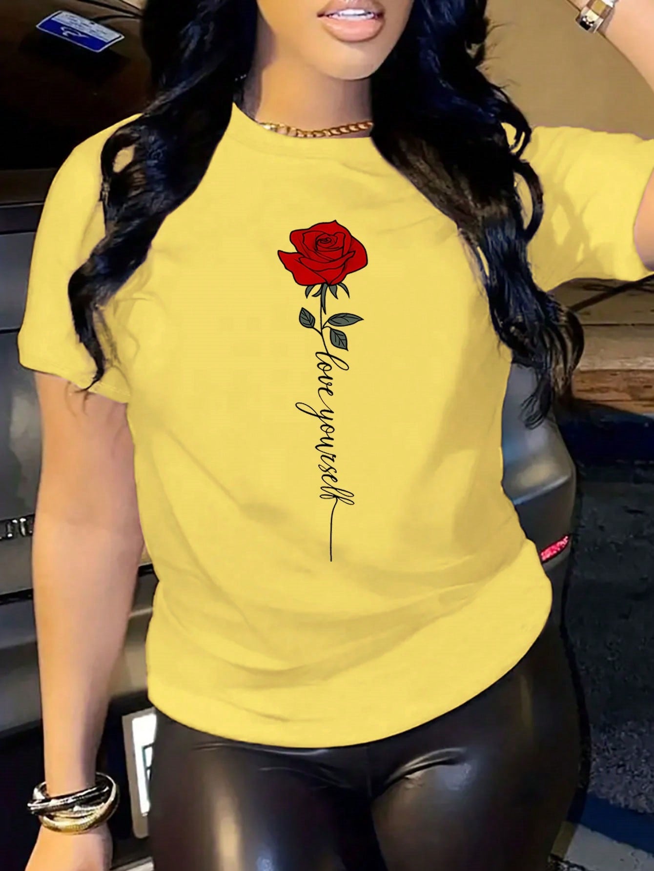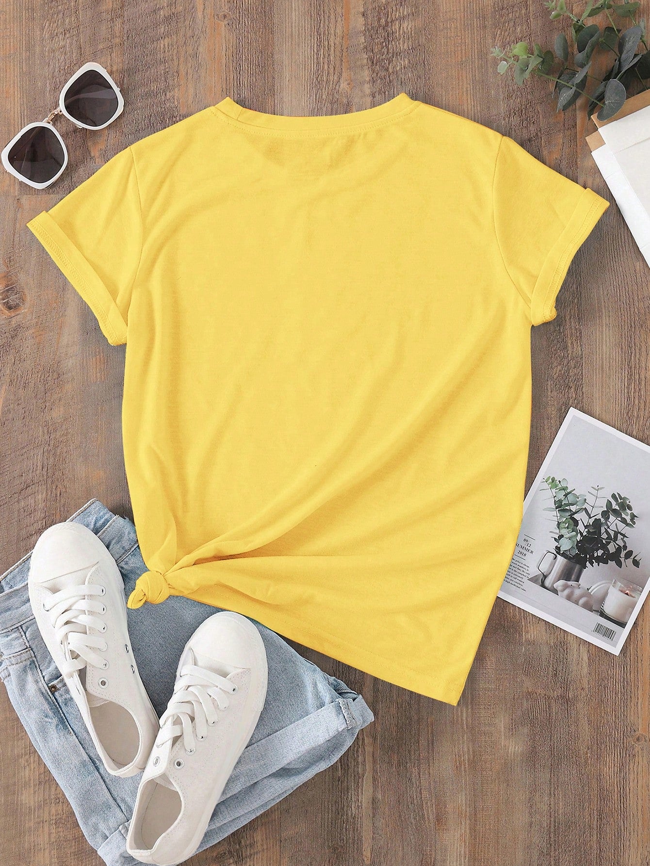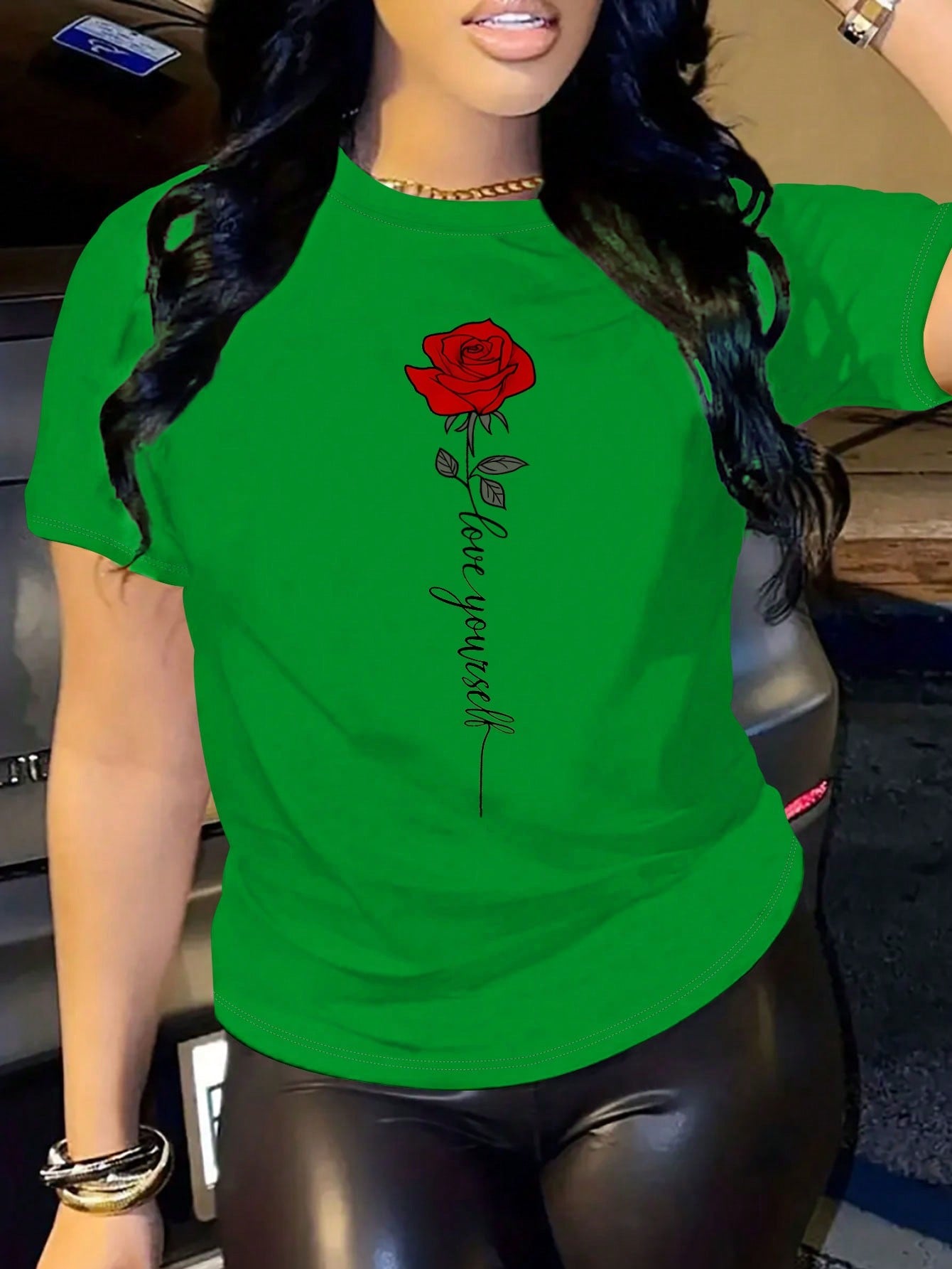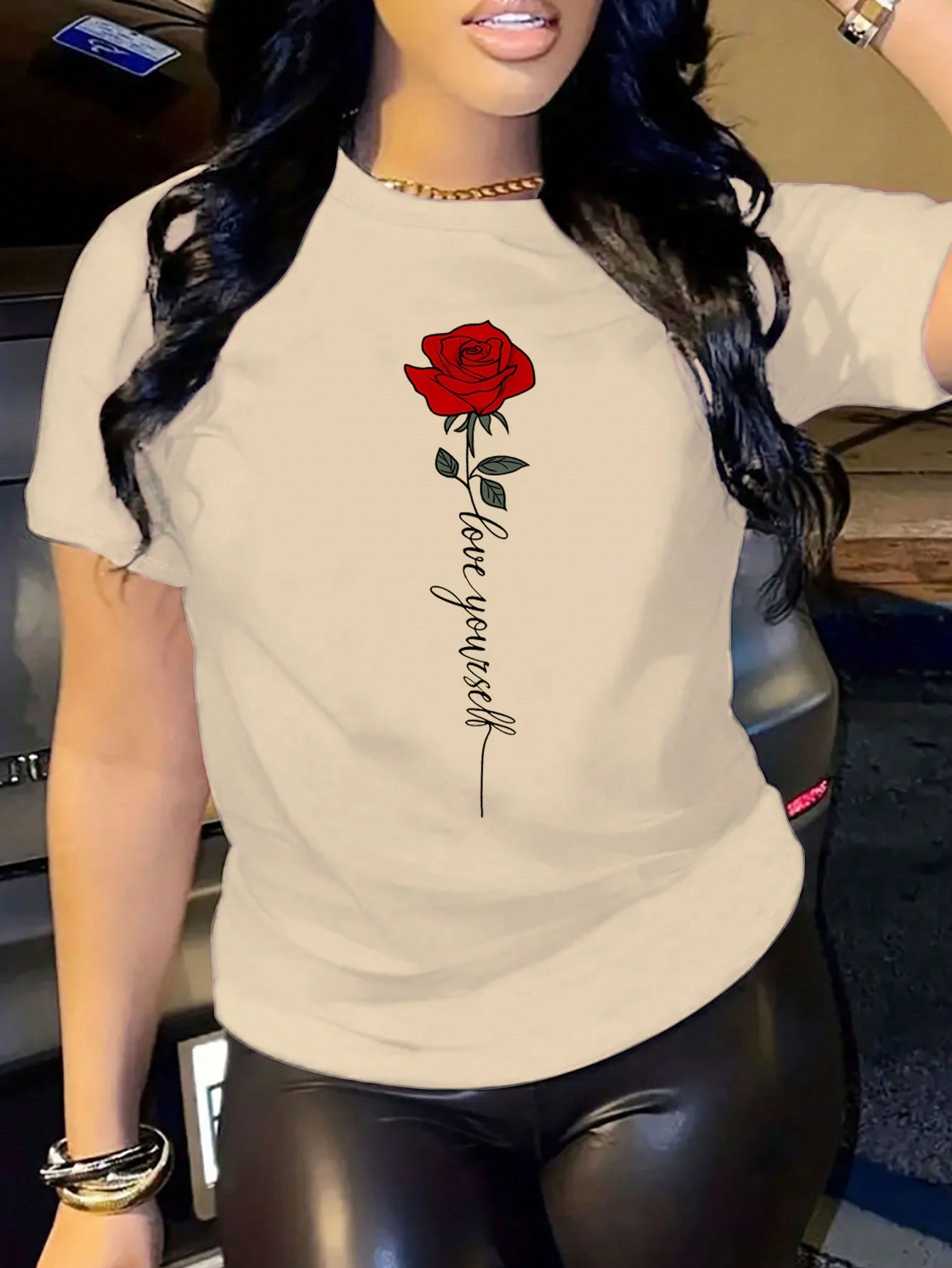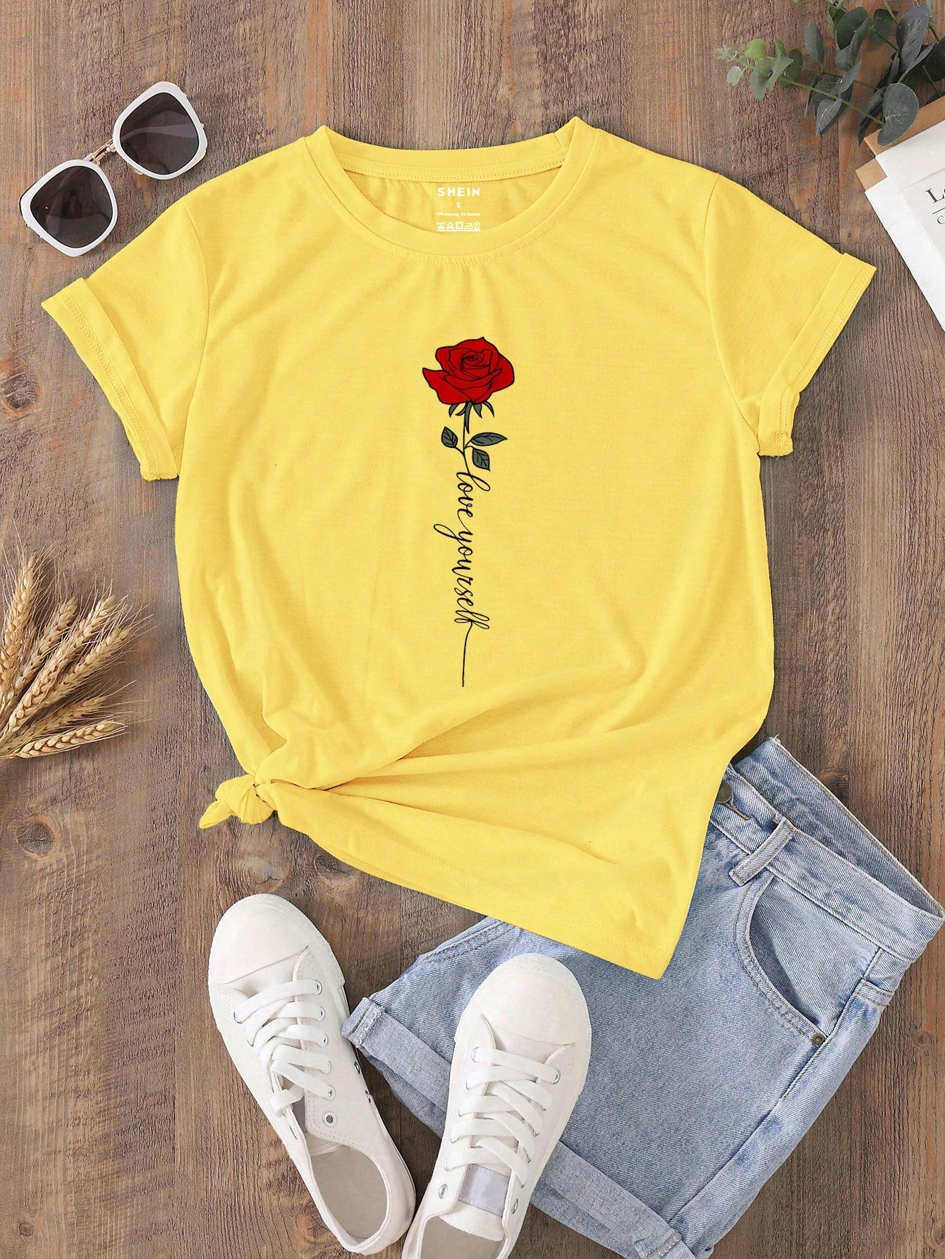 Flower & Letter Print Round Neck Short Sleeve T-Shirt Graphic Tees Women Tops