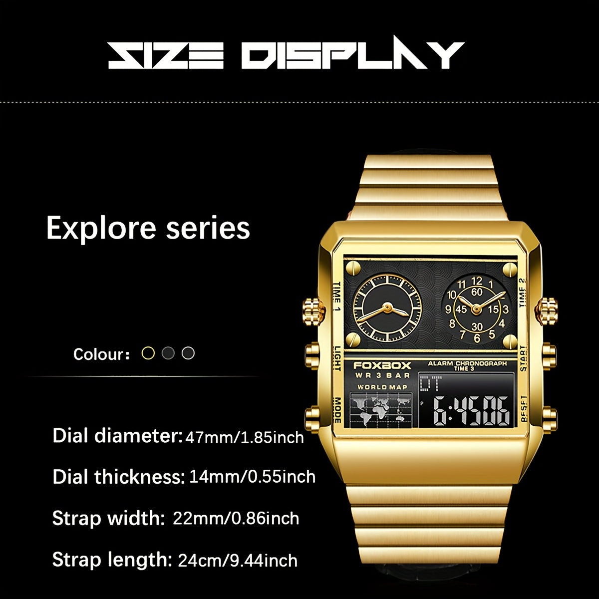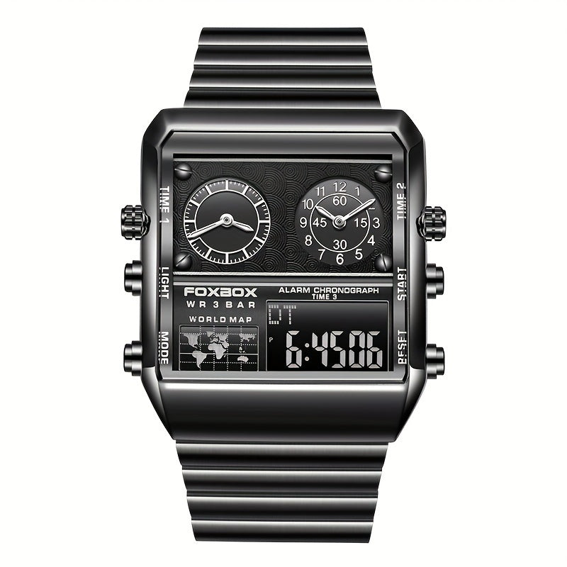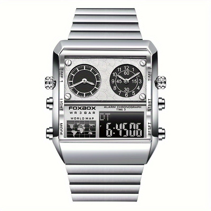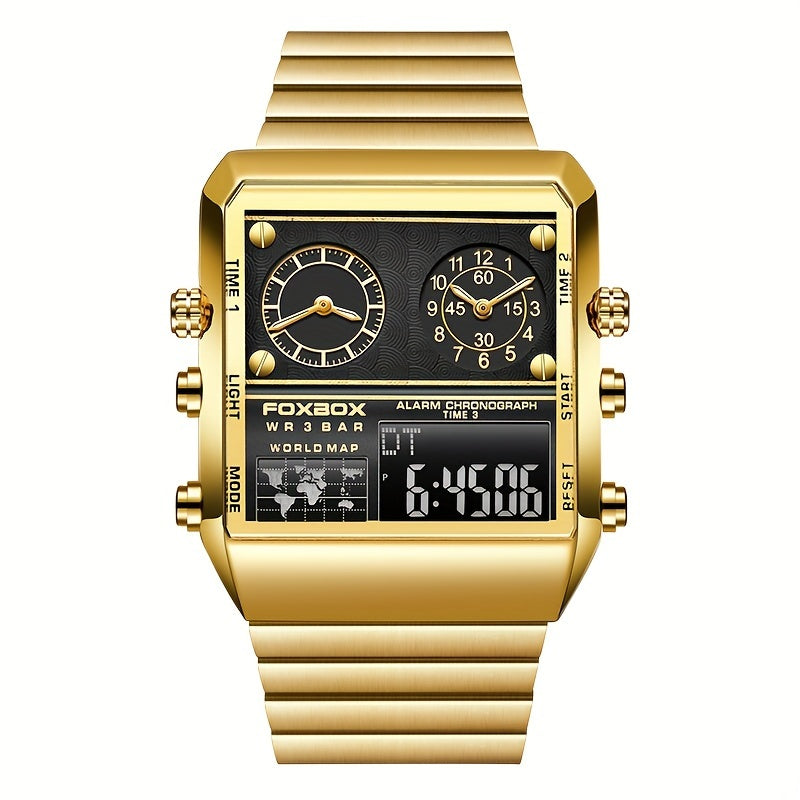FOXBOX Men's Luxury Golden-Tone Quartz Watch - Sporty Military Digital Display with Stainless Steel Band, Square Zinc Alloy Case, and Analog/Digital Dual Time Zone - Elegant Statement Piece
