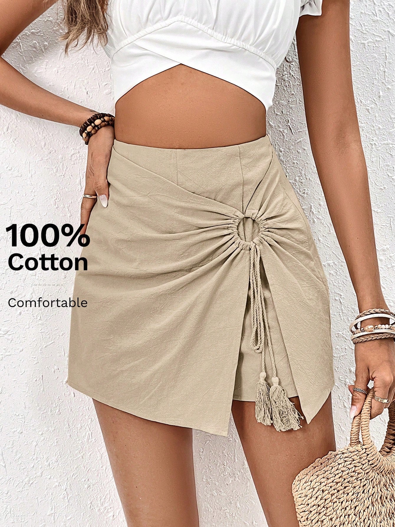 Frenchy Tassel Decor Ring Linked Bow Tie Wrap Mini Asymmetrical Hem Old Money Style Skort