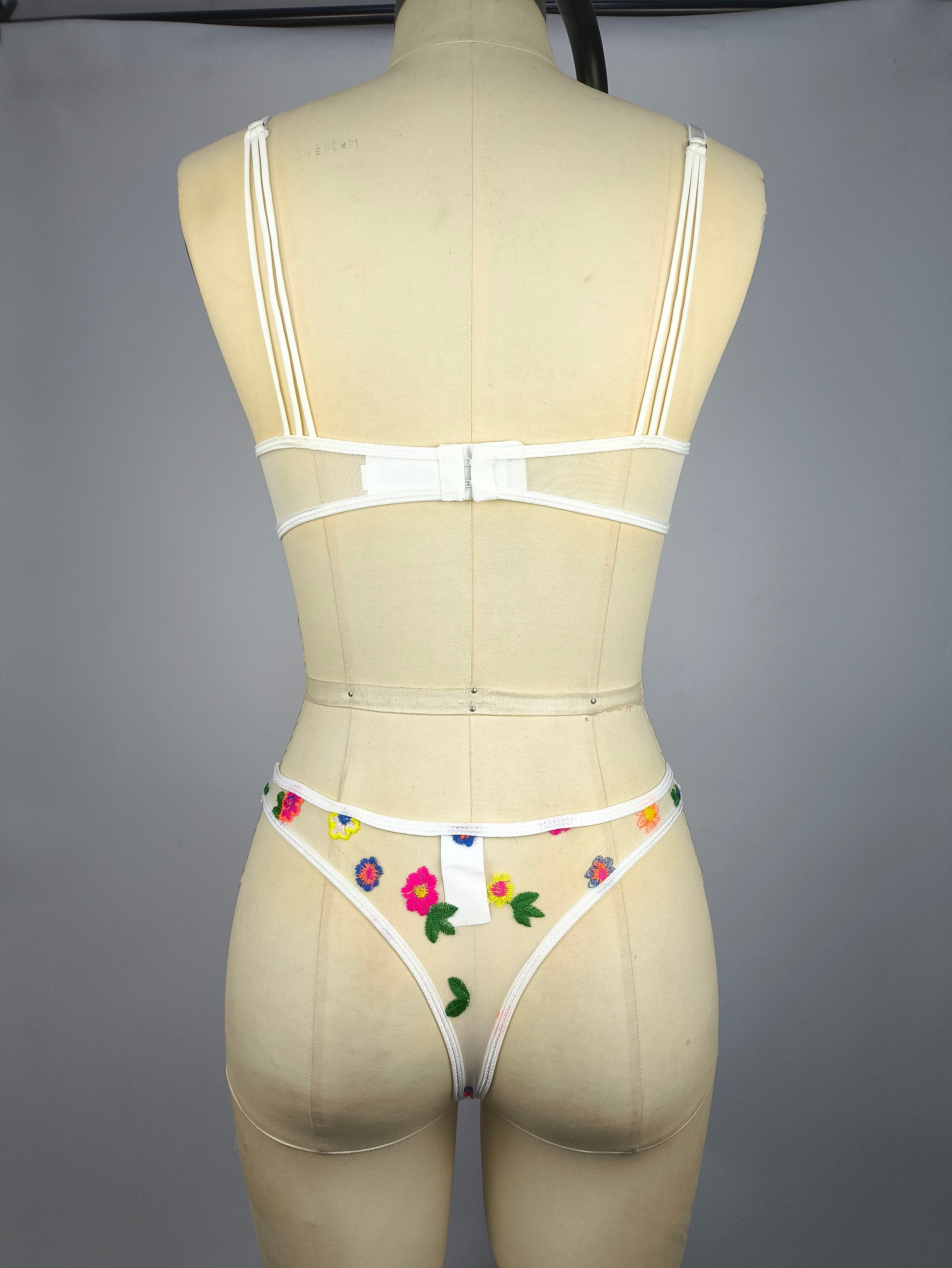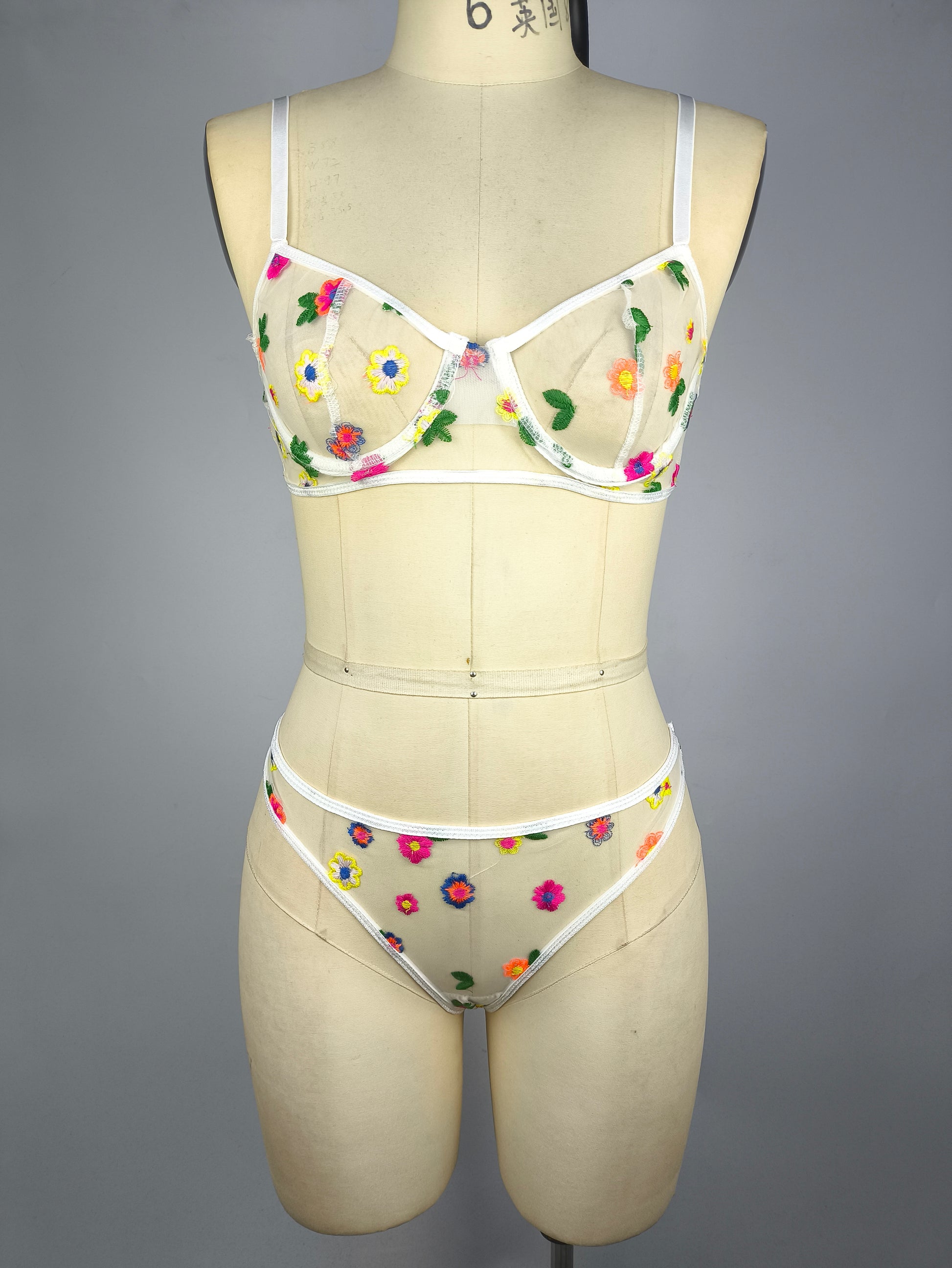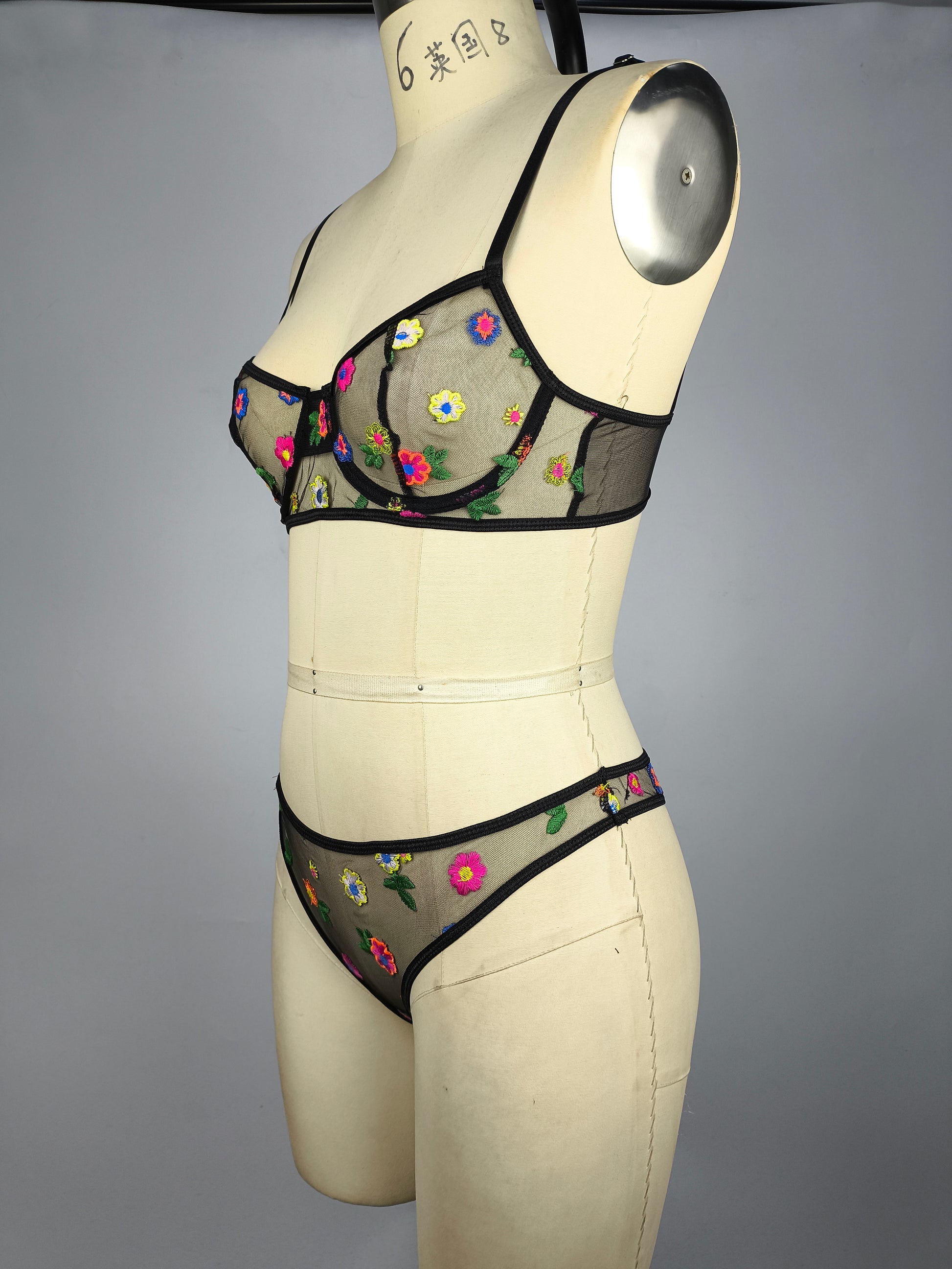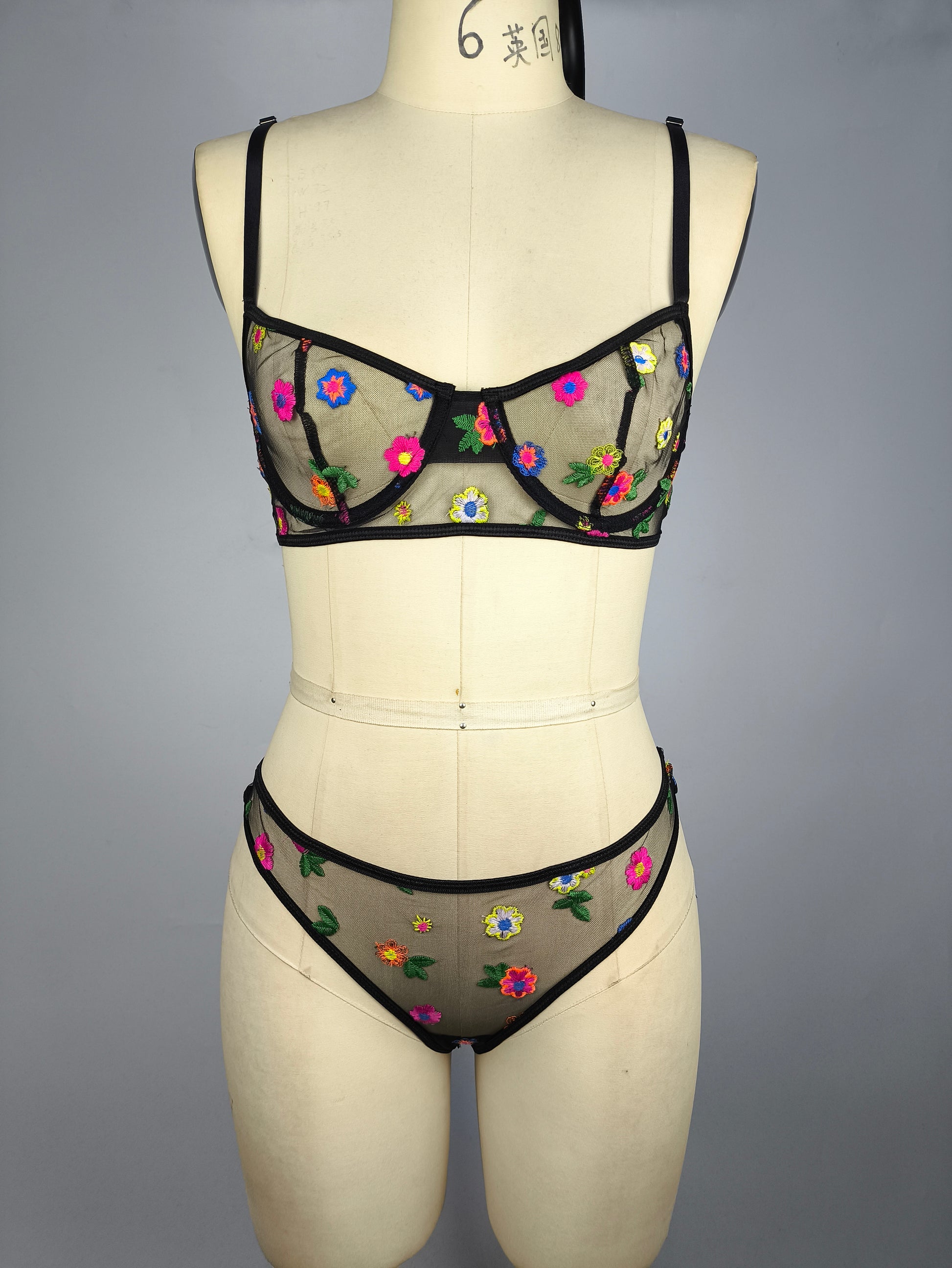 Fresh Bra Panties Two Piece Set Embroidered Mesh Steel Ring Gathered Three Point Sexy Lingerie