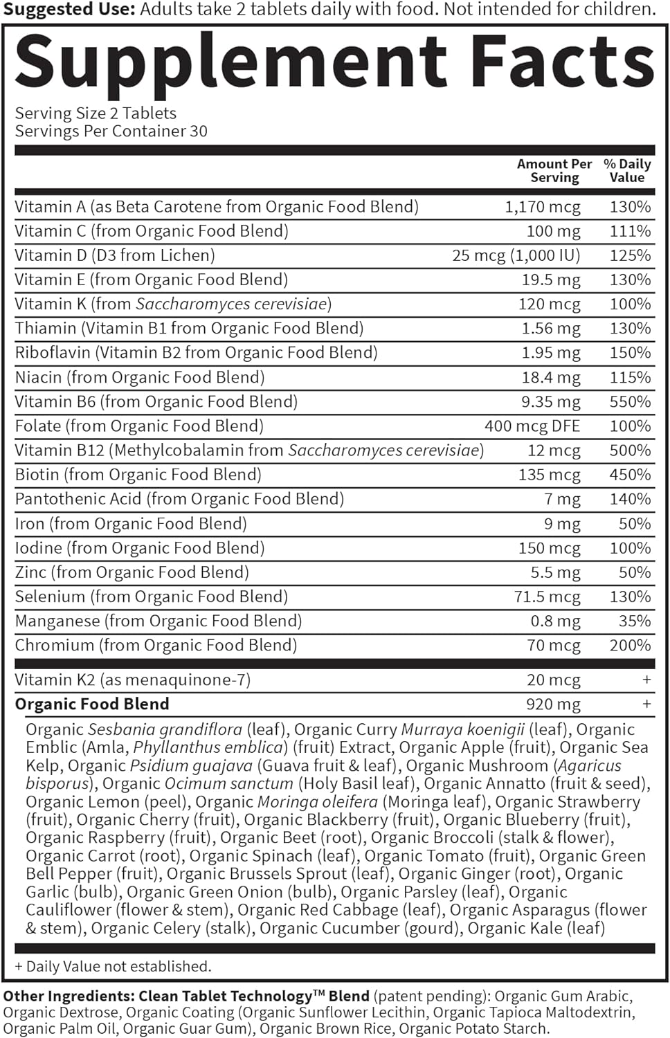 CERTIFIED ORGANIC MULTIVITAMIN: Organic vitamins and minerals are made from real foods—gently extracted using water and proudly third-party tested and certified Organic, Non-GMO, Gluten Free, Vegan & Kosher