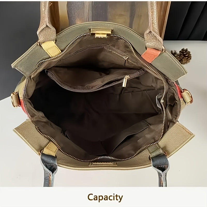 Genuine Genuine Leather Women's Handbag - Hand-Stitched Retro Color-Block Design, Adjustable Shoulder Straps, Zipper Closure, Multiple Color Options & Polyester Lining - Casual & Business Handbag for Women, Versatile Fashion Accessory, Durable Stitched De