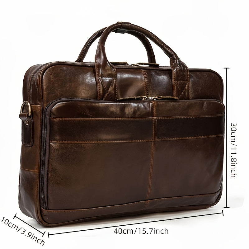 Genuine Top-Grain Cowhide Leather Briefcase - Laptop Compartment, Adjustable Detachable Shoulder Strap, Zipper Closure - for Office & Daily Commute