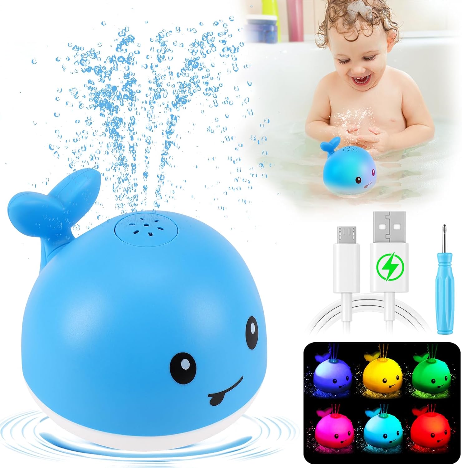 - Rechargeable Whale Bath Toy: Equipped with a rechargeable battery, saves you from having to replace with new batteries all the time. Our cute whale baby bath toys can automatically spray water and flash colorful lights when you put bath toys for toddlers in the water. This Bath toys 6 months bring endless entertainment for baby baths, fun baby toys to entice your child into taking baths, and your baby will enjoy every bath time