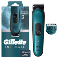 Meet Gillette's gentle and easy intimate shaving lineup that shows the proper respect for your region. Gillette Intimate Pubic Trimmer is Gillette's first manscape pubic hair trimmer for men, designed for gentle and easy manscaping below the waist. This i3 green manscaping electric pubic trimmer is cordless and has Skin-First technology with closely spaced blades to reduce skin bulging and help protect pubic skin. With a sensitive skin shield guard for protection from nicks and cuts and precision in intimate areas. Powered by Braun, this electric men's pubic hair trimmer is equipped with a powerful Nickel Metal Hydride rechargeable battery that lasts up to 80 minutes from a single charge. This waterproof manscaping pubic hair trimmer for men can be used wet or dry, so you can easily manscape at the sink or in the shower, whenever you want, wherever you want. Transform your manscaping routine with Gillette's manscaping pubic hair trimmer. Gillette's intimate pubic trimmer comes with a charger sensitive skin guard. With Gillette Intimate Grooming, you have a routine so simple and easy that you won't need to plan ahead. For a complete manscaping intimate grooming routine, use the entire Gillette Intimate grooming line to help prepare, help protect pubic hair from shave irritation, and maintain your pubic hair & skin. Dermatologist tested on Sensitive Skin. Blue. Makes a great stocking stuffer holiday gift for men.