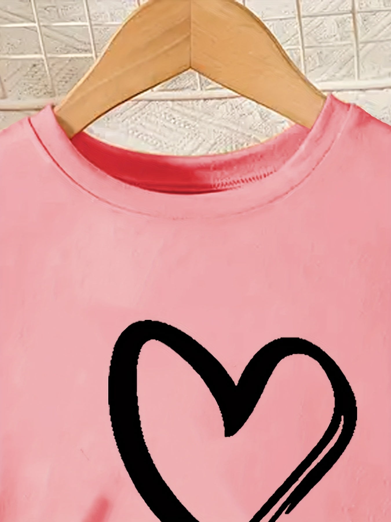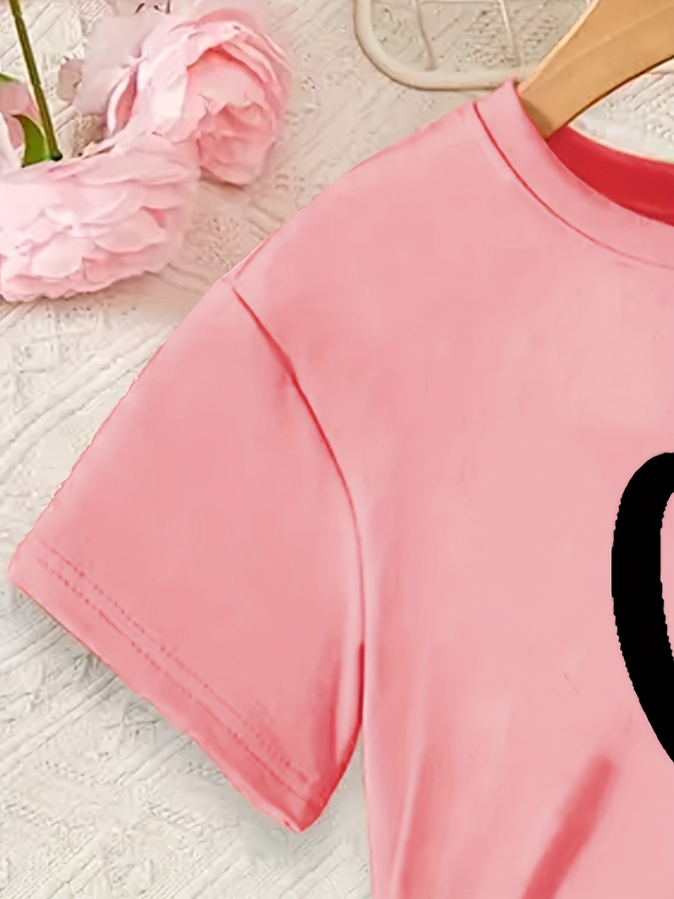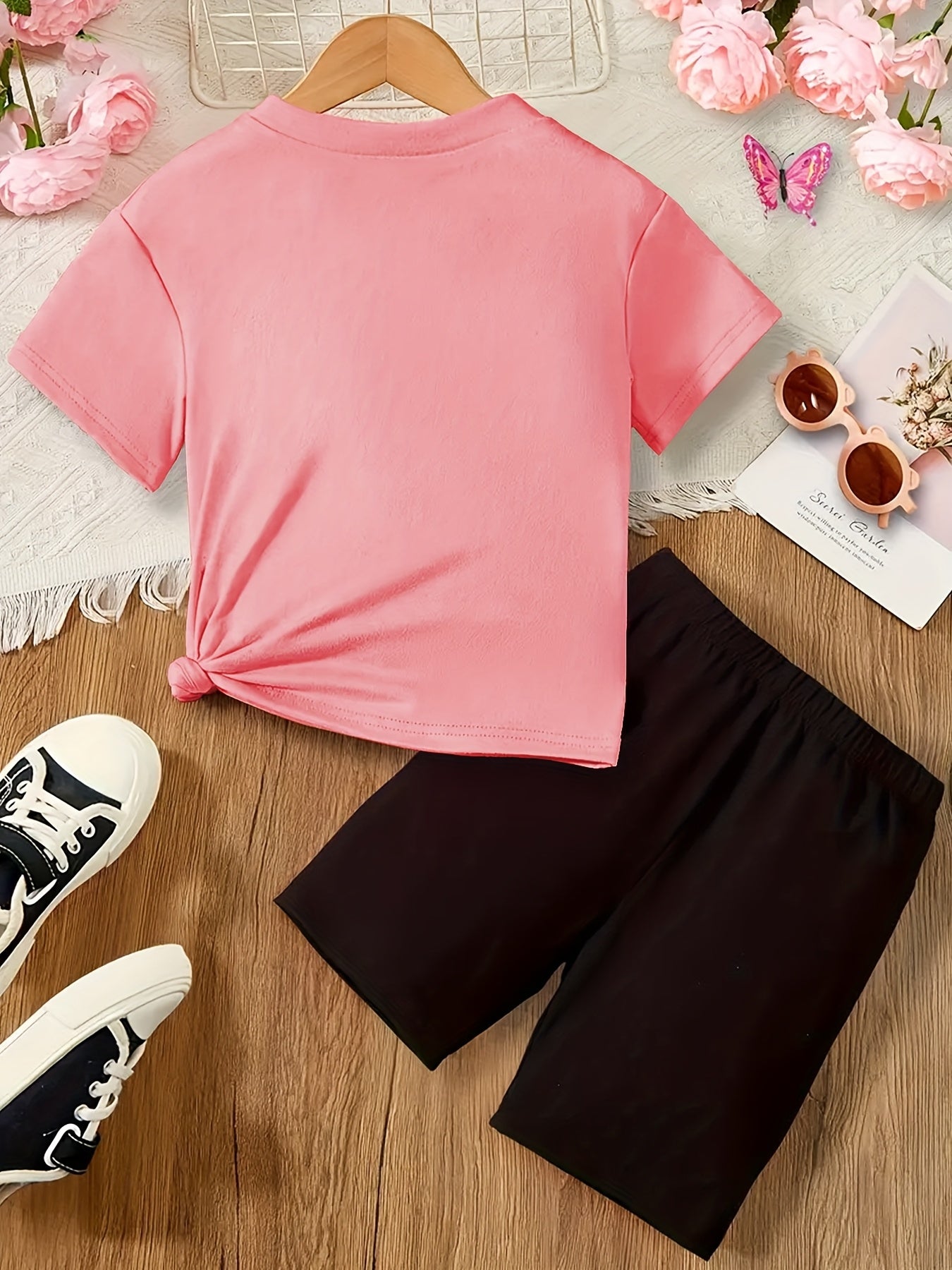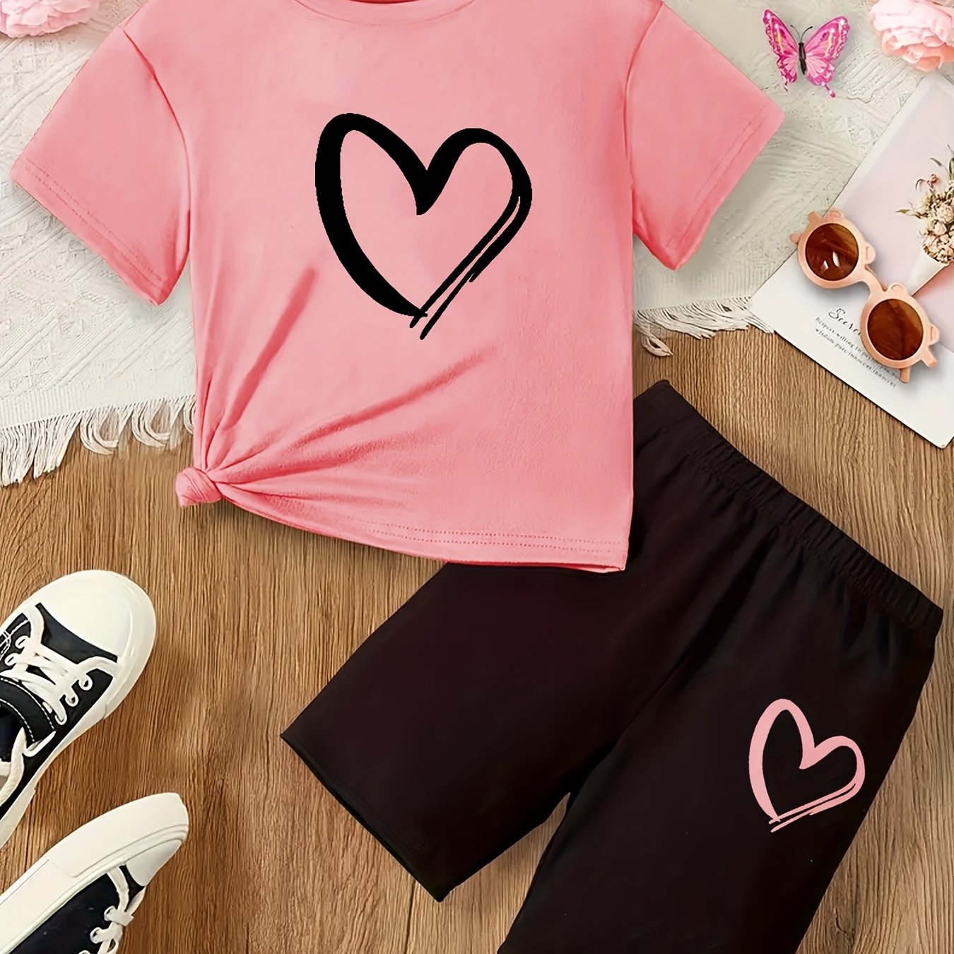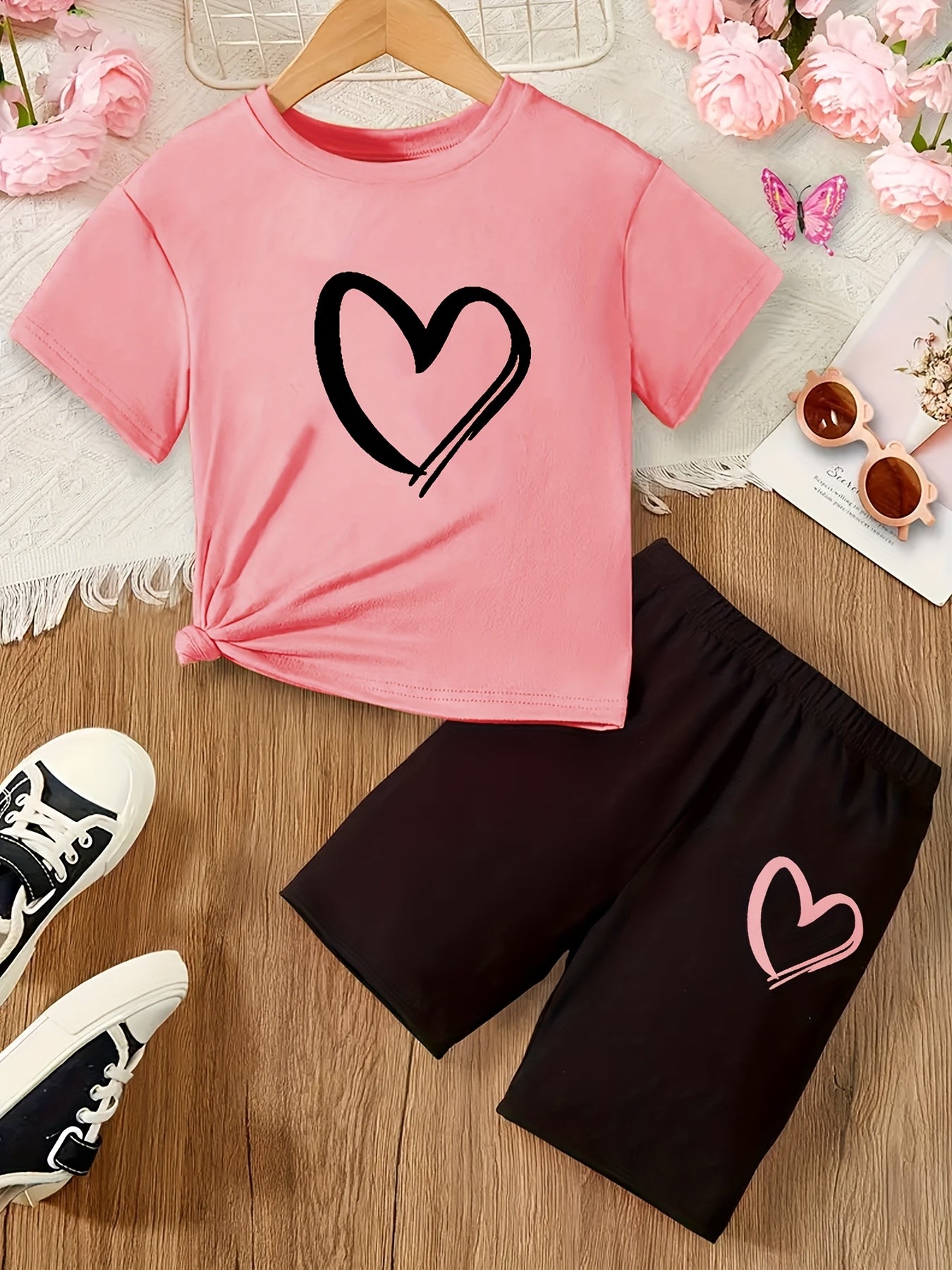 Girls' 2pcs Set, Heart Print Short Sleeve T-Shirt and Shorts, Casual Crew Neck Polyester Knit with Elastane, Regular Fit, Spring/Summer/Fall Outfit, for Outdoor