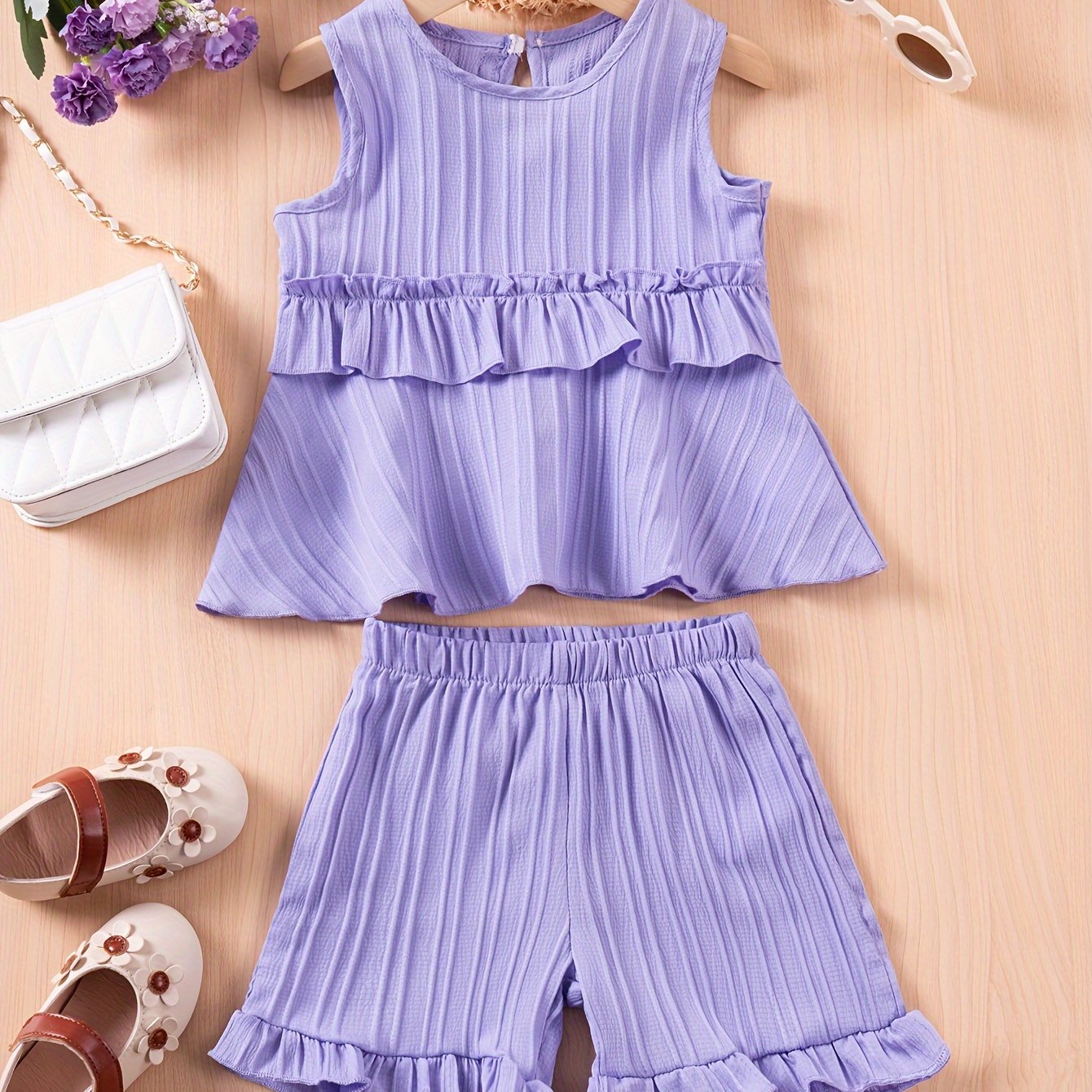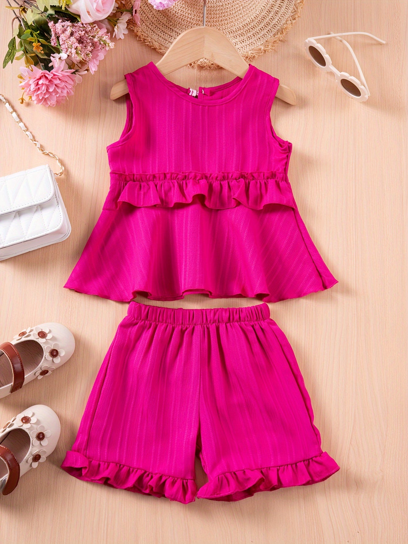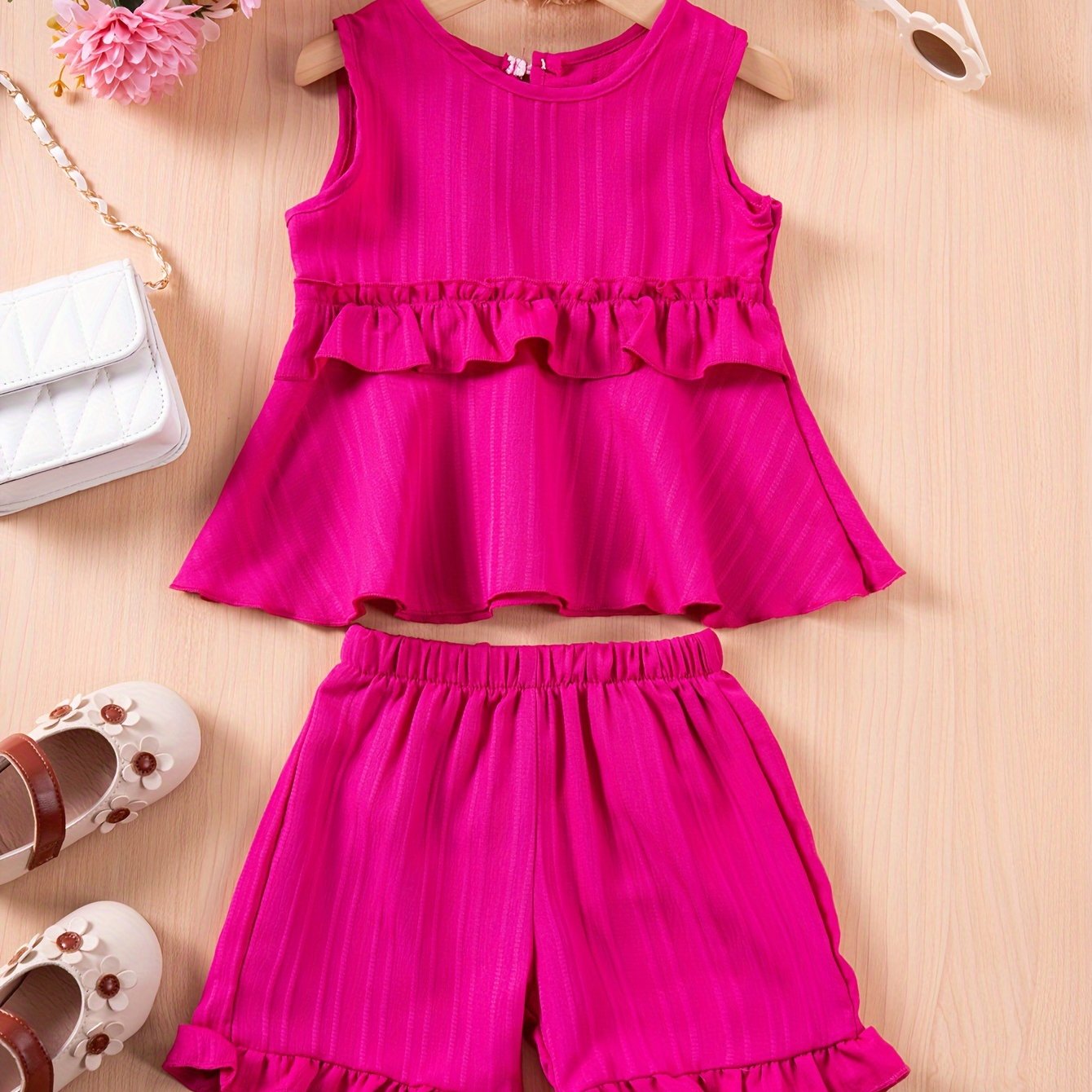 Girls' Solid Color Sleeveless Ruffle Top + Shorts Two-Piece Casual Cute Set HN02