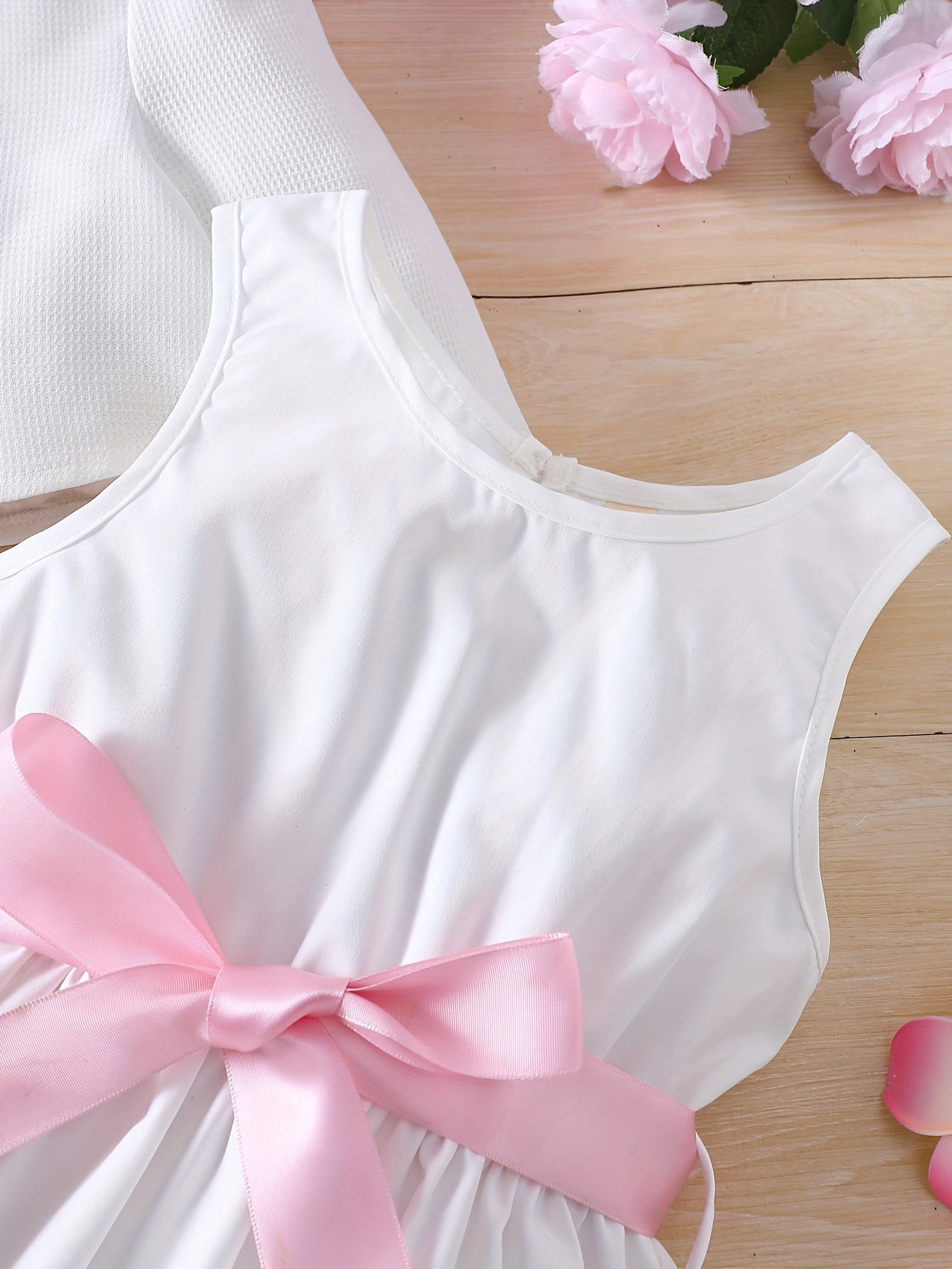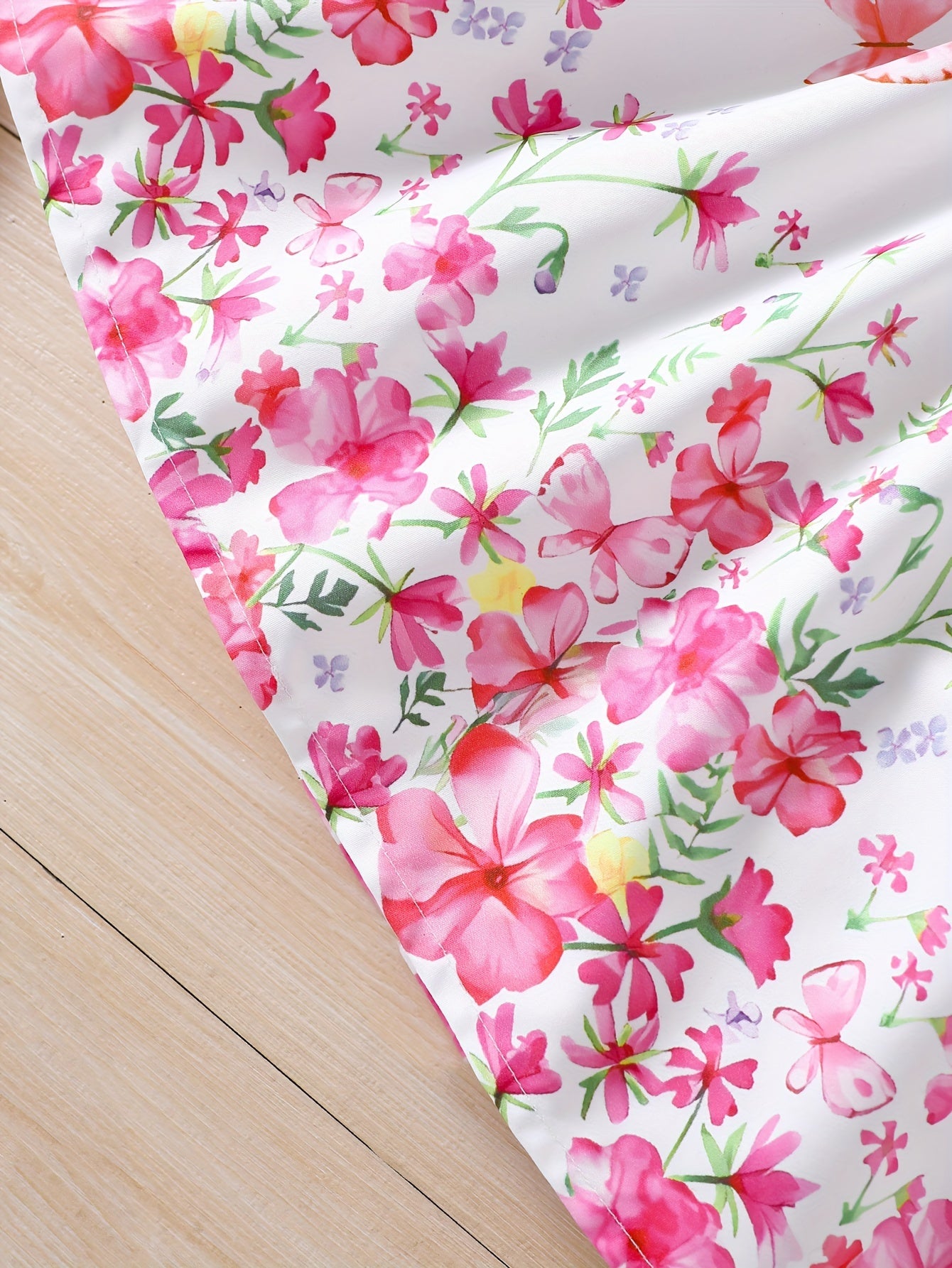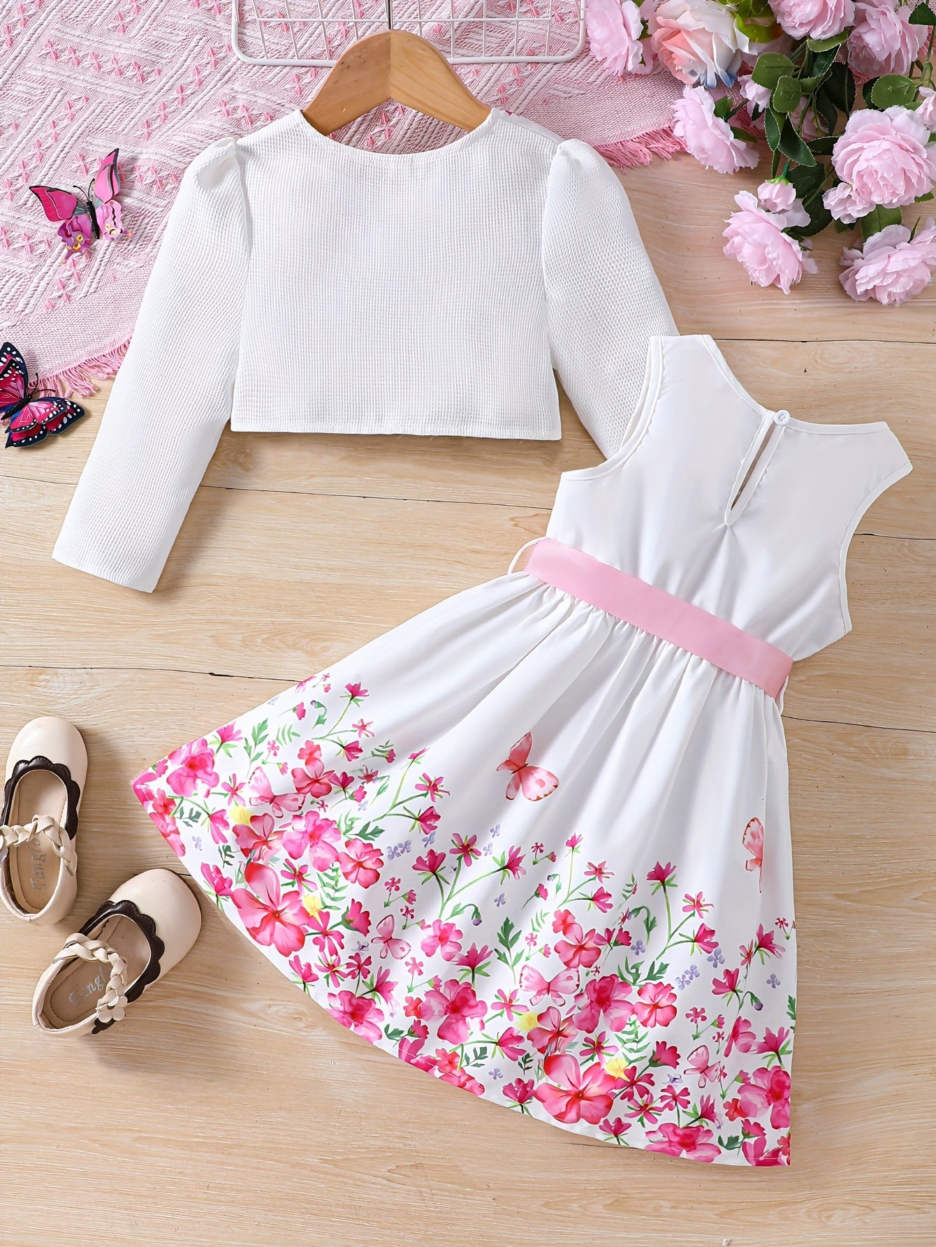 Girls' Spring Fashion 2pcs Set, Floral Print Dress with Belt Detail and Matching Cardigan, Crew Neck, Regular Fit, Polyester 100%, Non-Stretch Woven Fabric, Belted Dress for Kids, for Outdoor