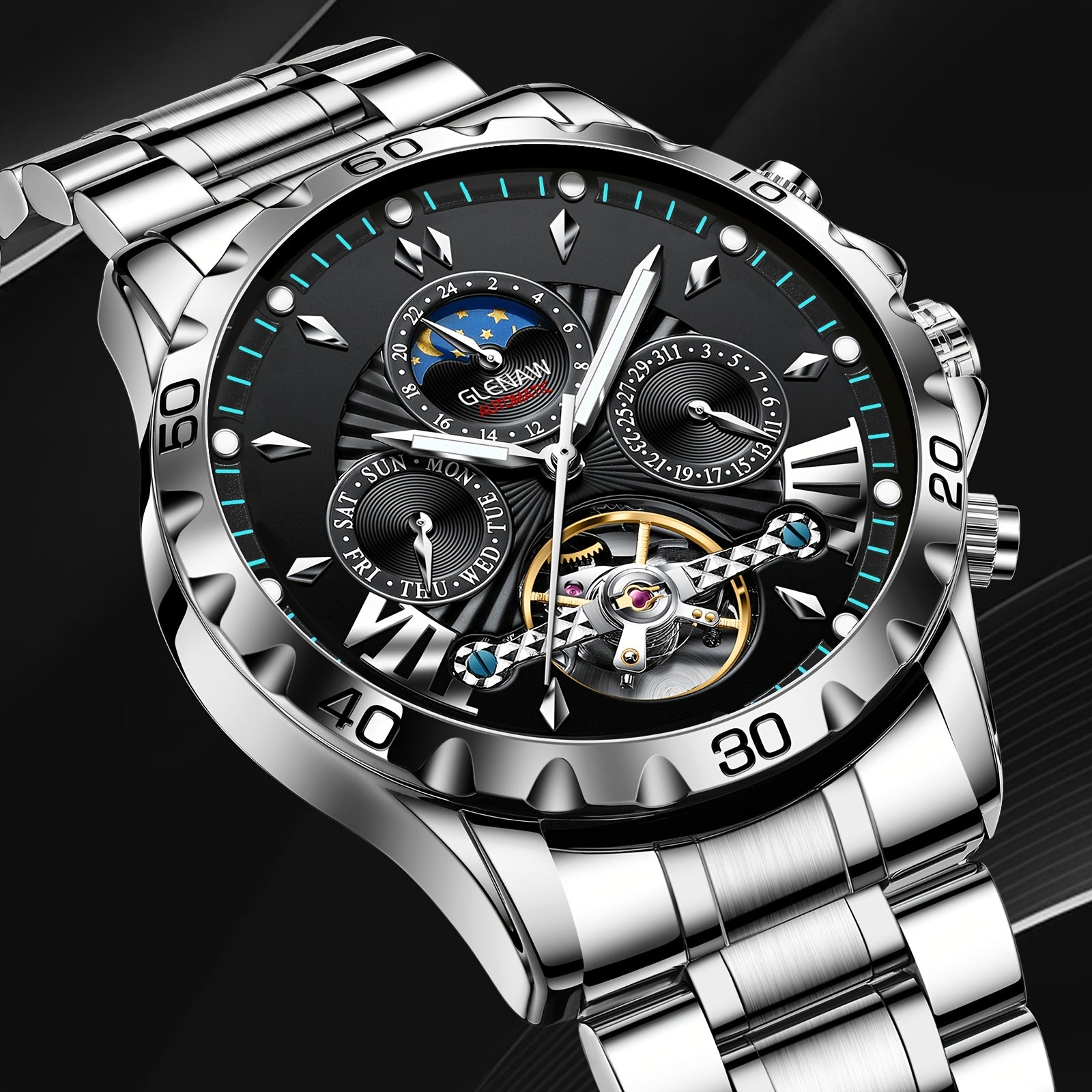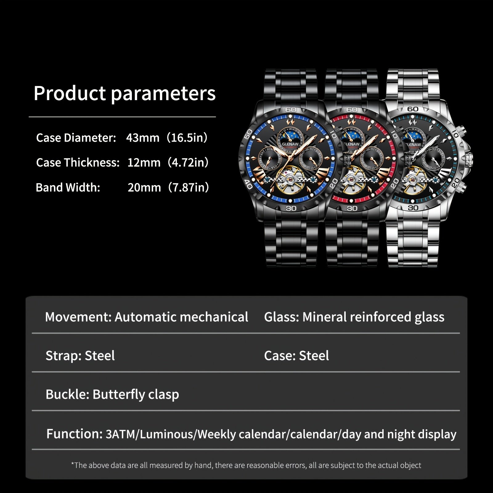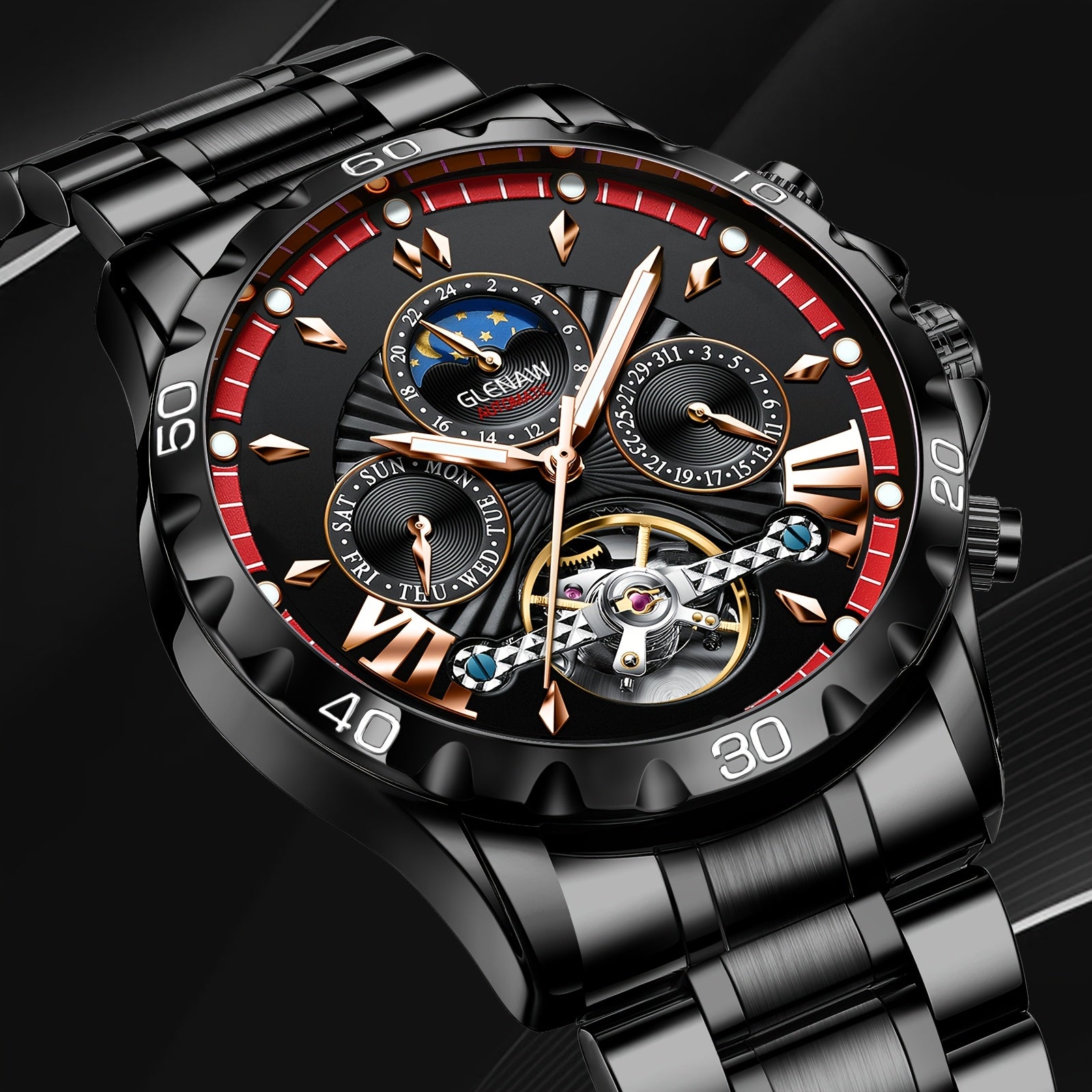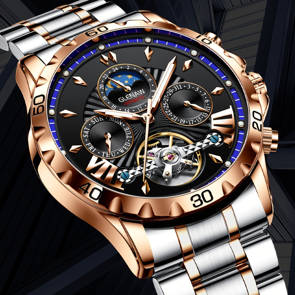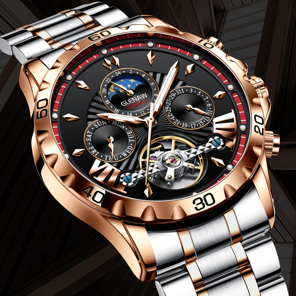 GLENAW Men's Automatic Mechanical Watch - Rose Golden Case, Black Dial, Stainless Steel Band, 24-Hour Date Display, Party Style with Rhinestone Details, Water-Resistant up to 30m, Formal Wear Watch | Rhinestone Embellishments | Zinc Alloy Case