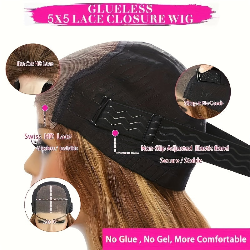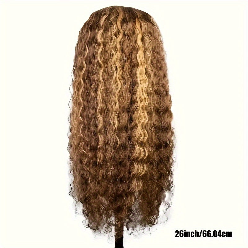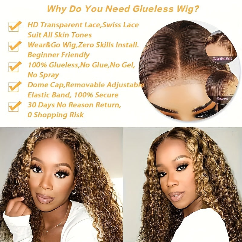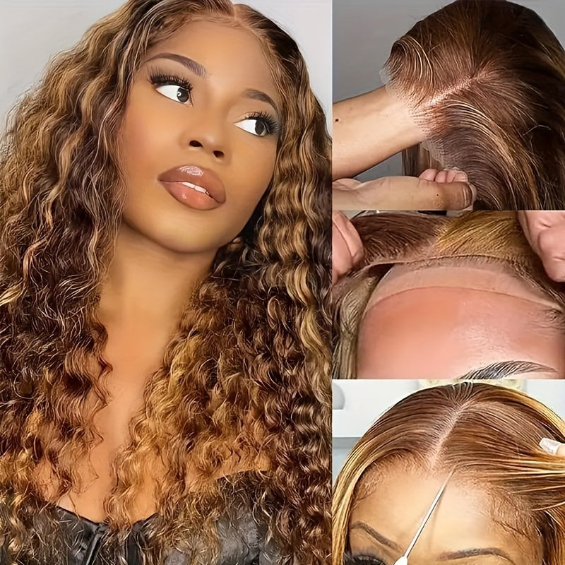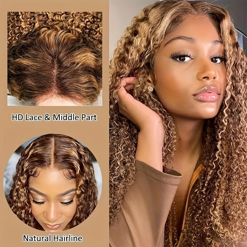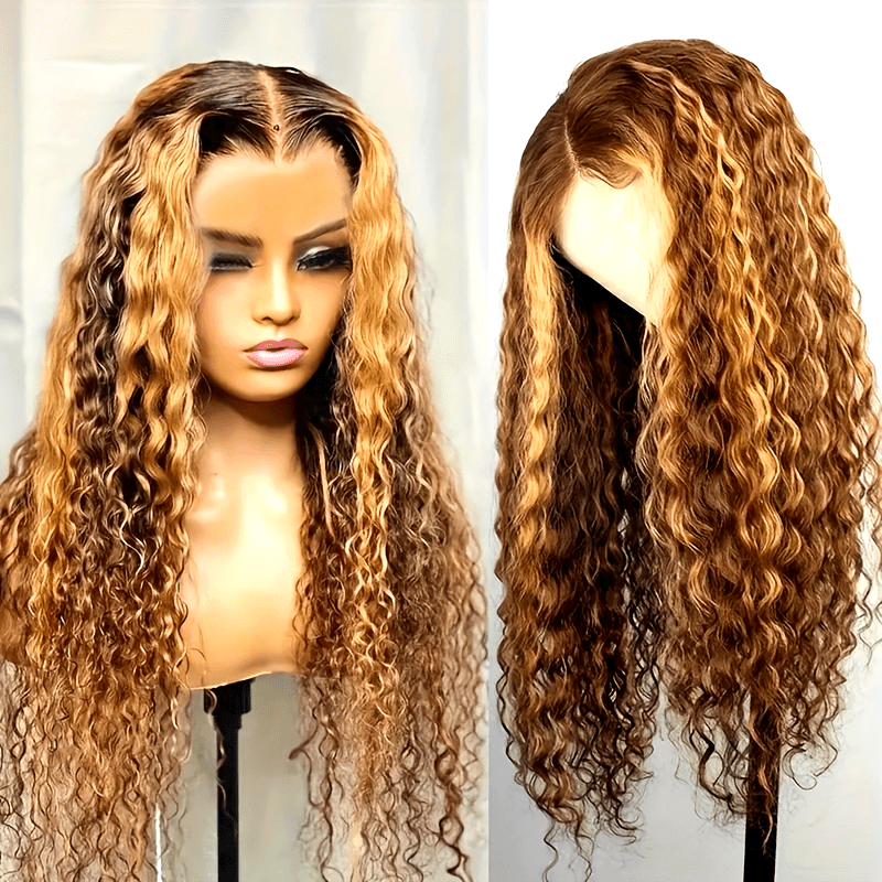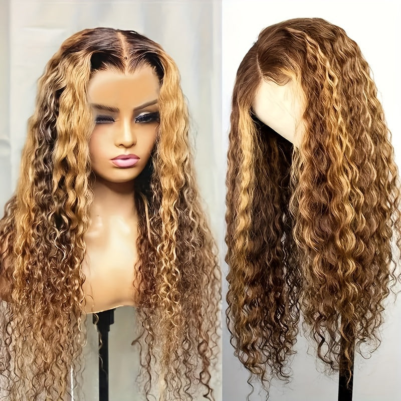 Glueless Water Wave Lace Front Wig, Human Hair, Ombre Brown Mix Highlighted Honey Blonde, 4/27, 5x5 HD Transparent Lace Closure, 180% Density Full & Thick Hair, Colored