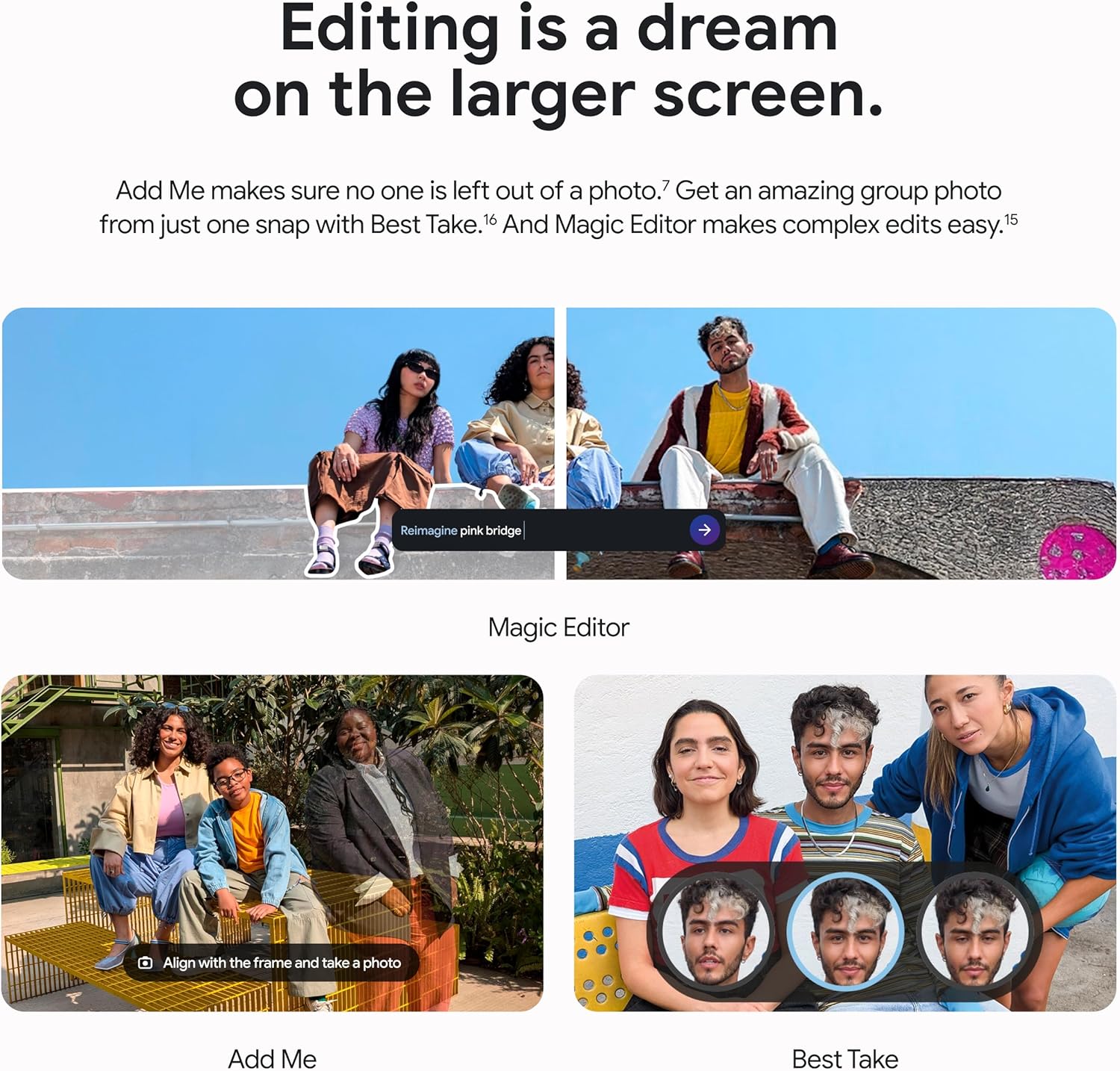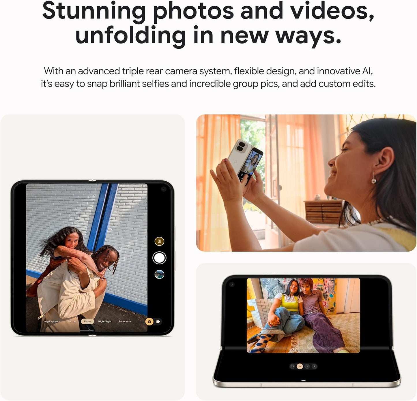 Take brilliant selfies and incredible group pics with Pixel 9 Pro Fold’s advanced triple rear camera, flexible design, and innovative AI; use tabletop mode for tripod-free astrophotography and group pics