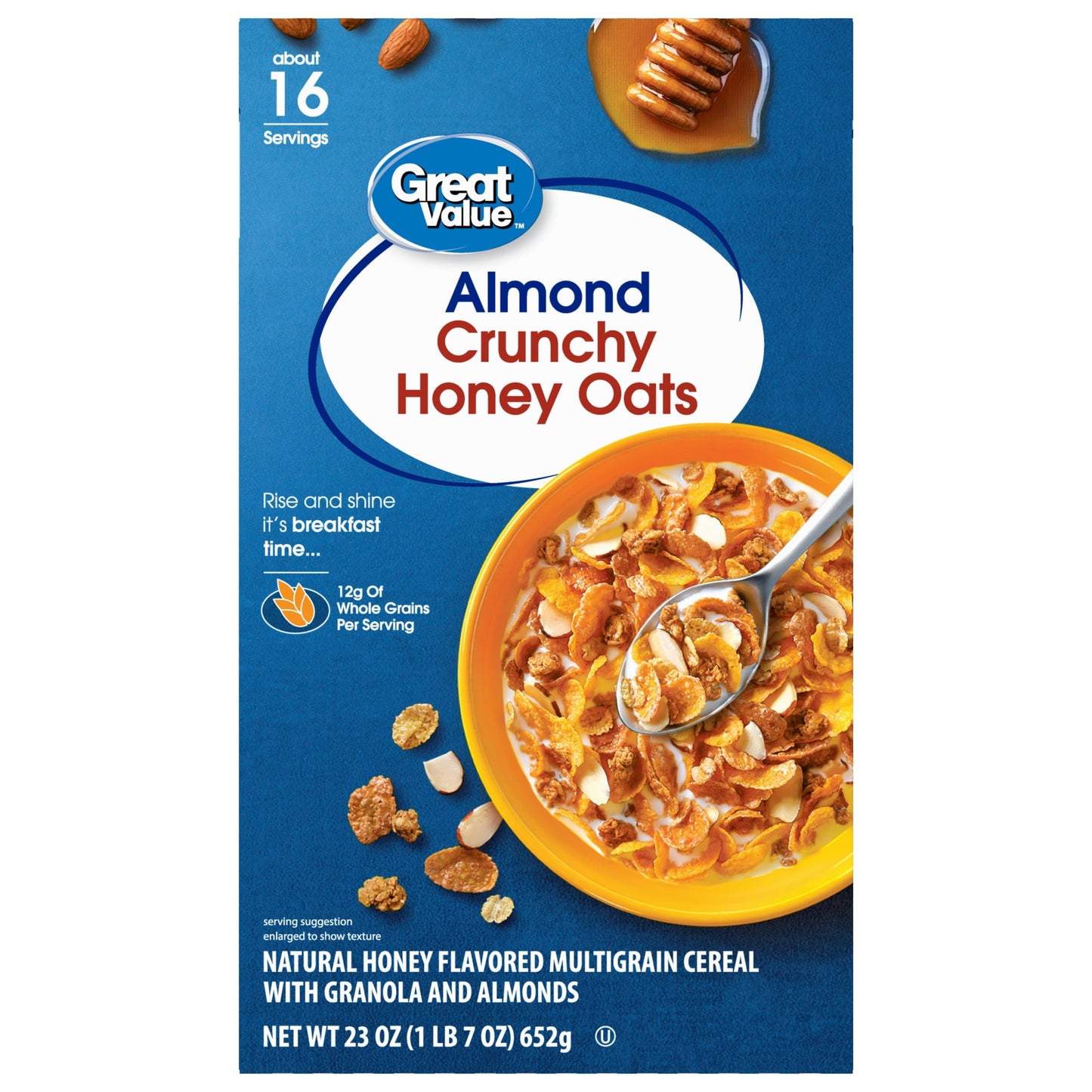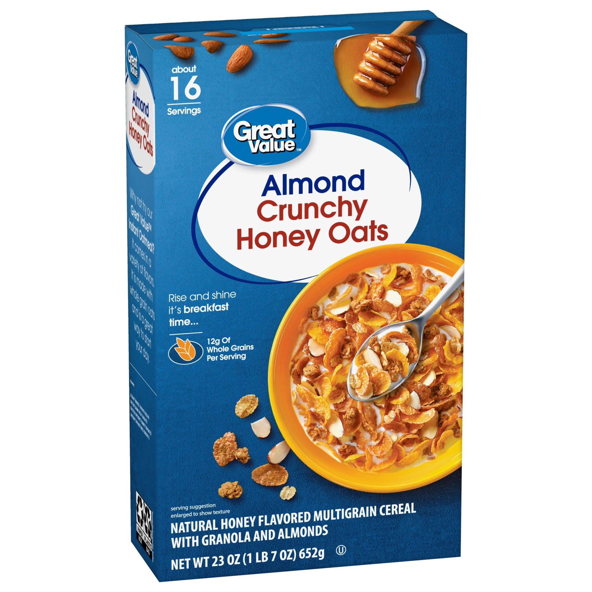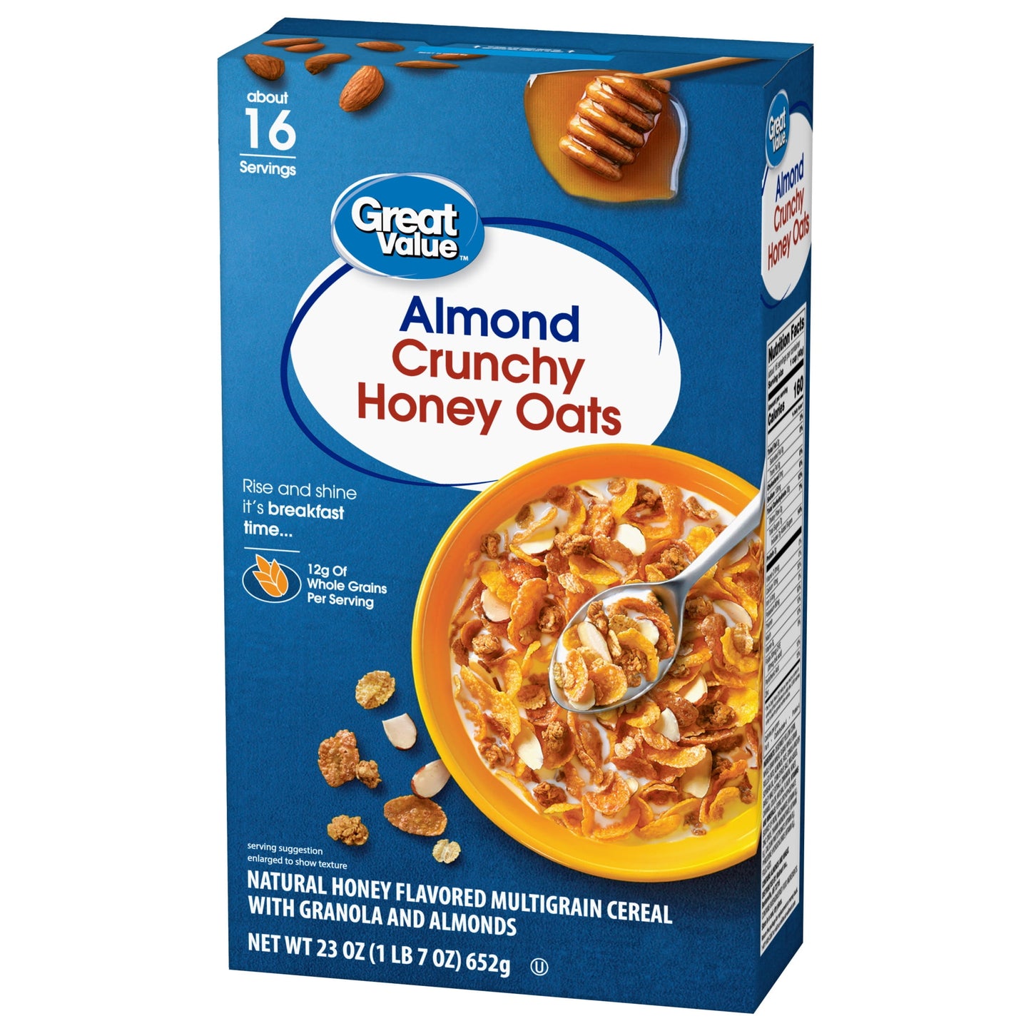 Add some sweetness to your regular morning routine with Great Value Almond Crunchy Honey Oats Breakfast Cereal. This sweet and crispy breakfast cereal contains 12g of whole grains per serving, making it the perfect breakfast offering. Pour a bowl as part of breakfast or as a snack with milk, add on top of yogurt with some of your favorite fruit, or grab a handful for a quick bite. Pick up some delicious Great Value Almond Crunchy Honey Oats Breakfast Cereal today.