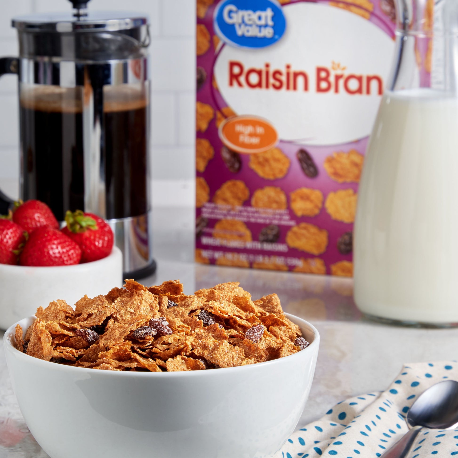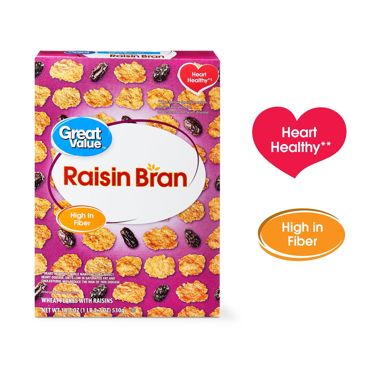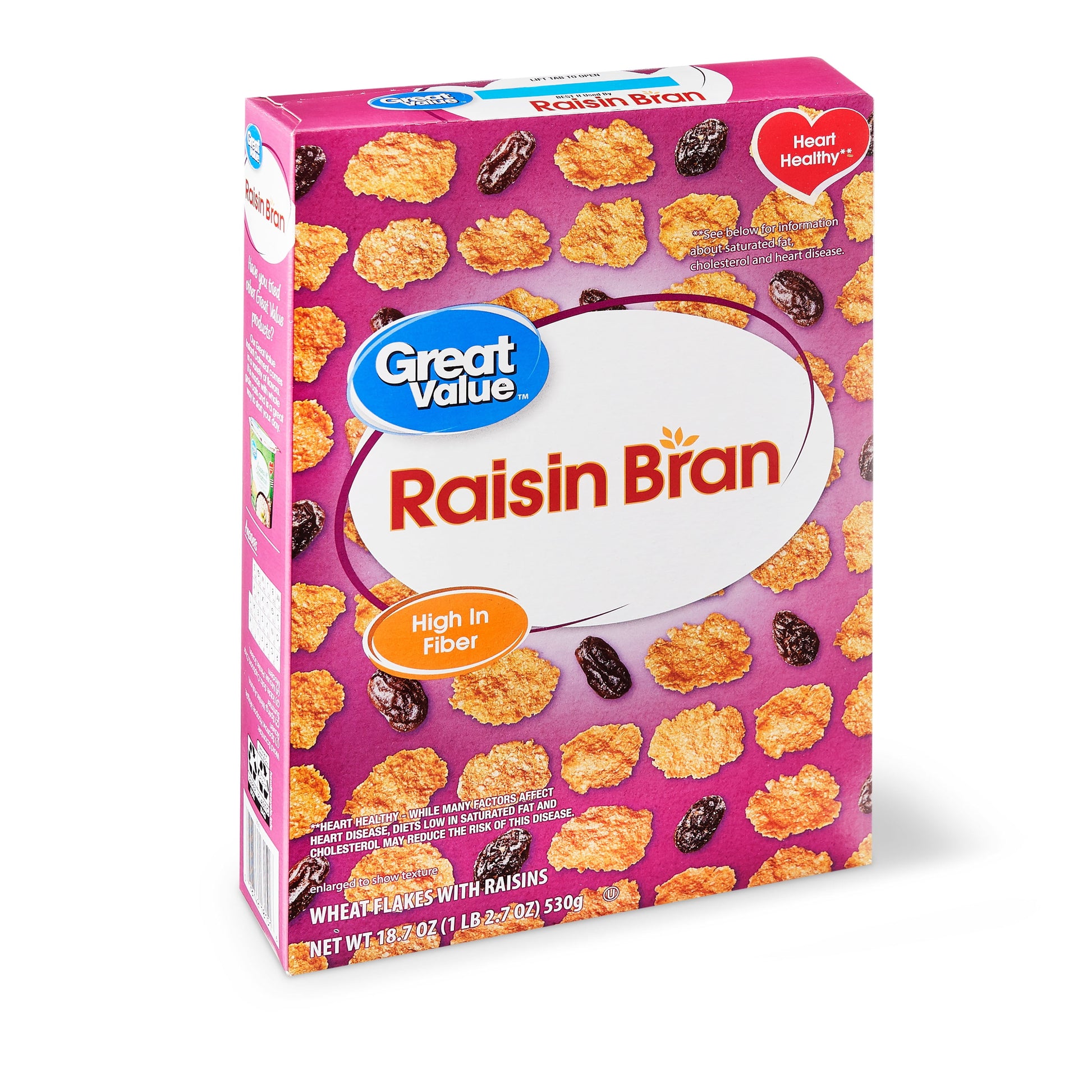 - Great Value Raisin Bran Cereal, 18.7 oz: Whole grain wheat and wheat bran flakes with raisins