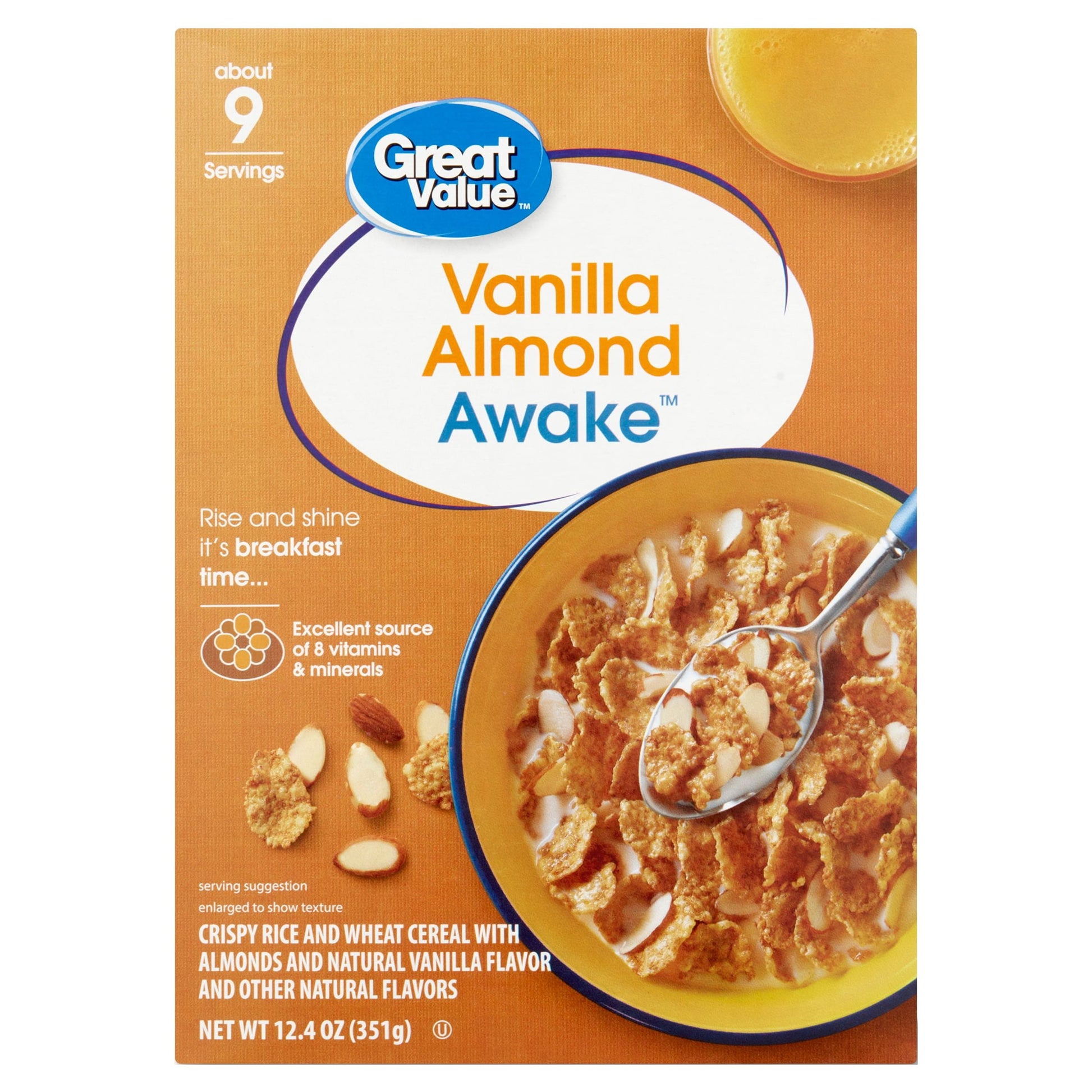 - Great Value Awake Vanilla Almond Cereal: Rice and wheat flakes with almonds and vanilla flavor