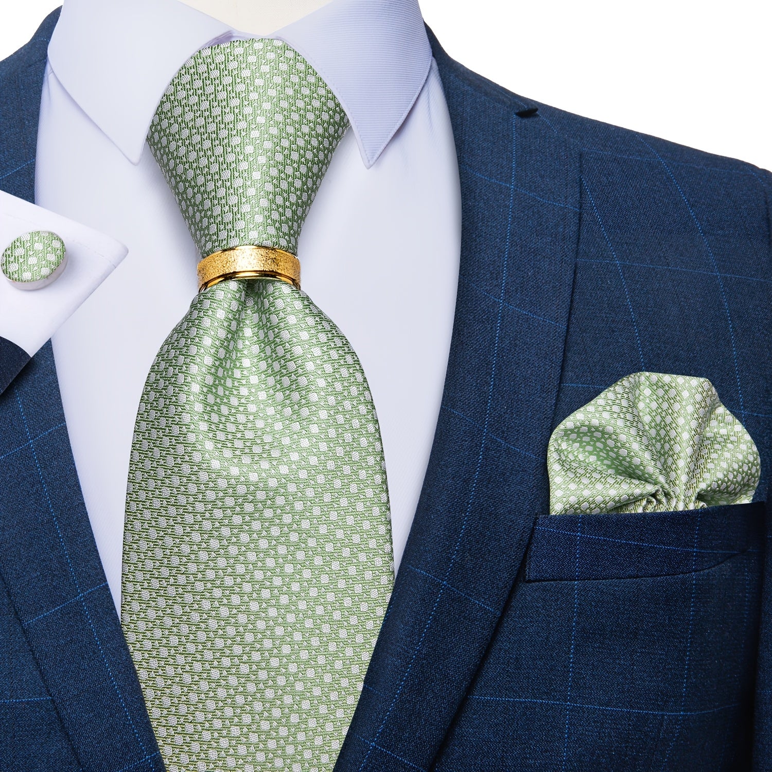 Green Men'S Ties Woven Necktie Striped Checks Pocket Square & Cufflinks Ring Set For Wedding Business