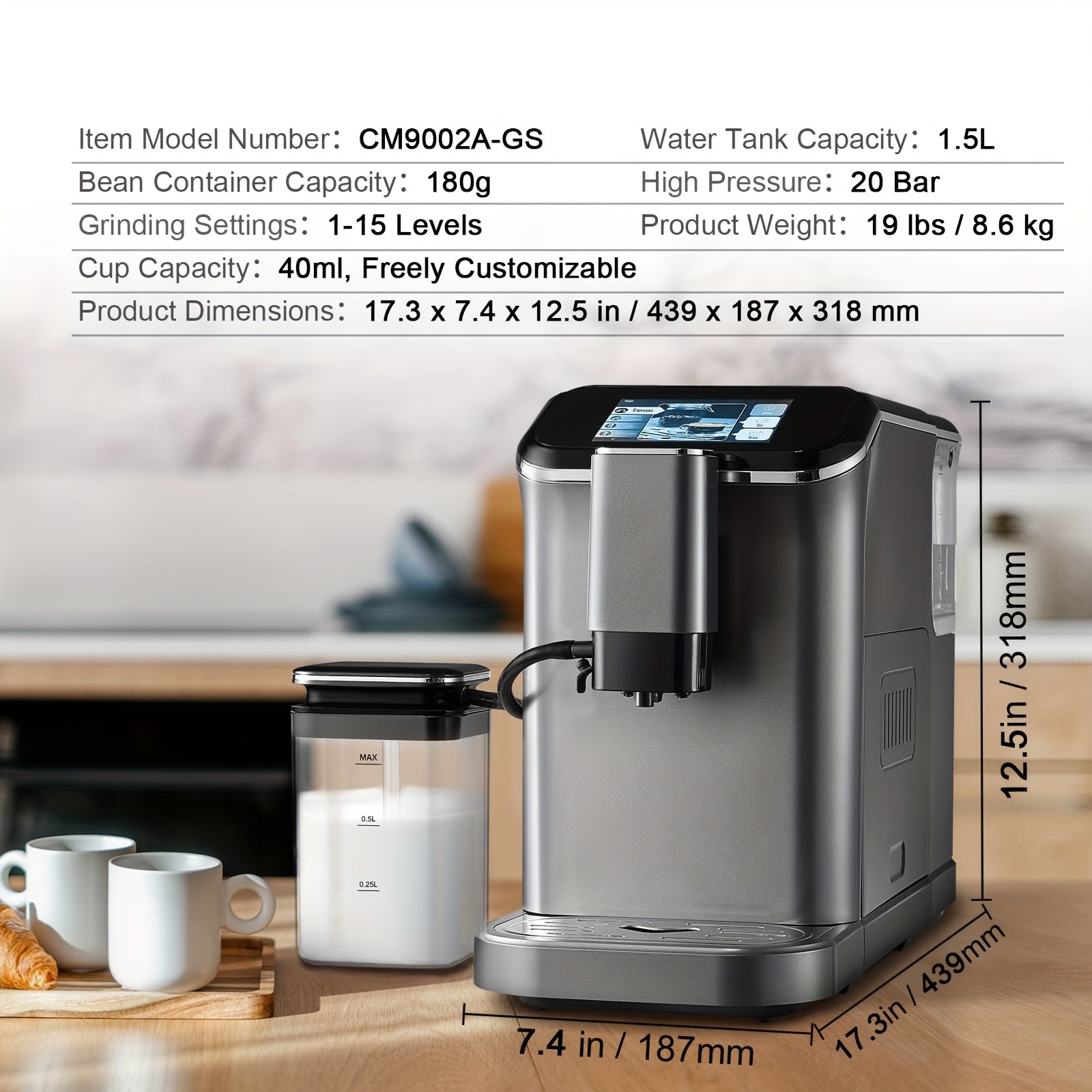Happybuy 20&15 Bar Automatic Espresso Machine With Built, In Grinder & Milk Frother, 50.72oz Water Tank, 15 Adjustable Grind Settings For Professional Coffee Making, With Steam Wand & Fully Automatic Milk Jug & Espresso, Touch Button& TFT& Color Screen