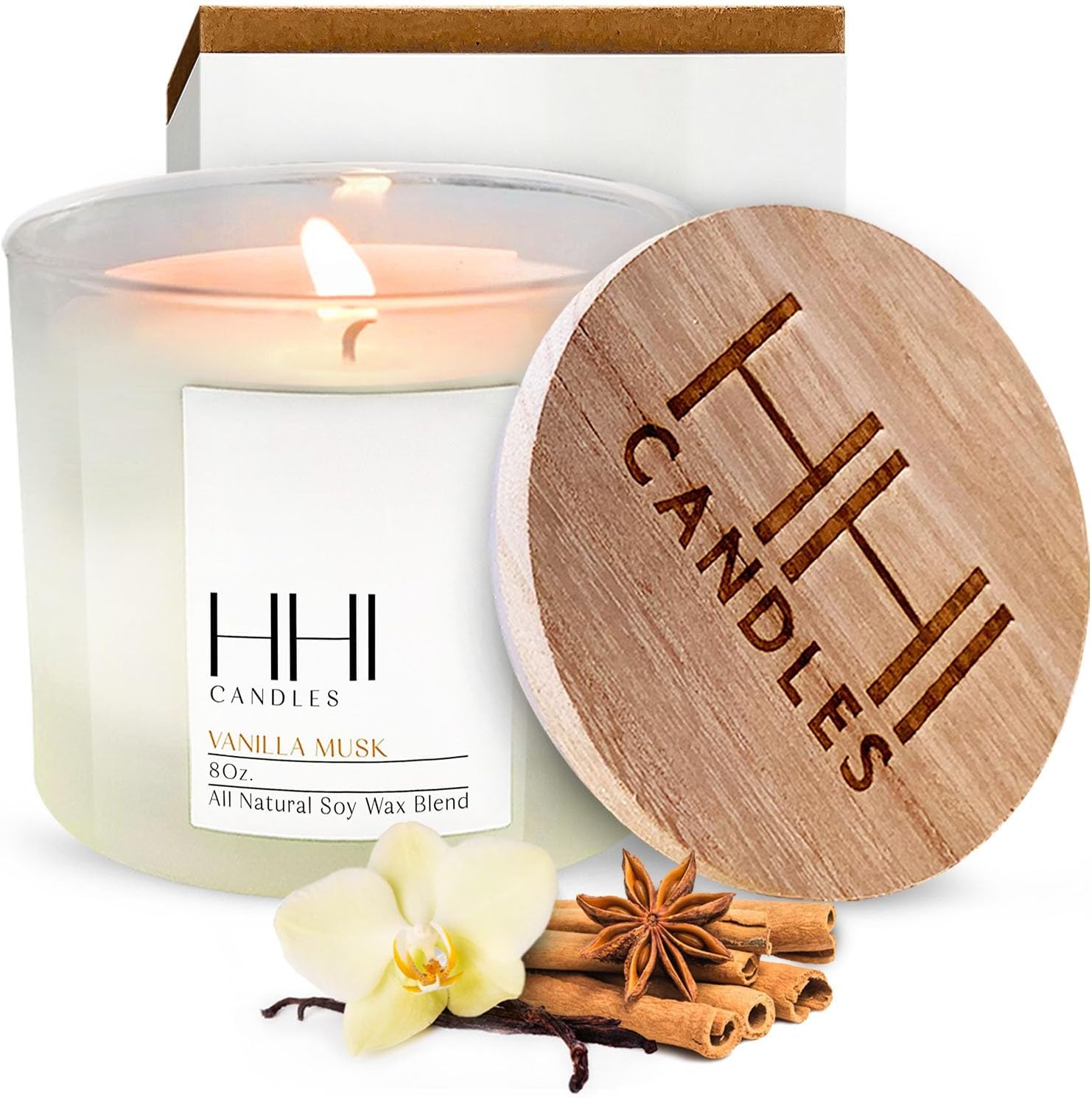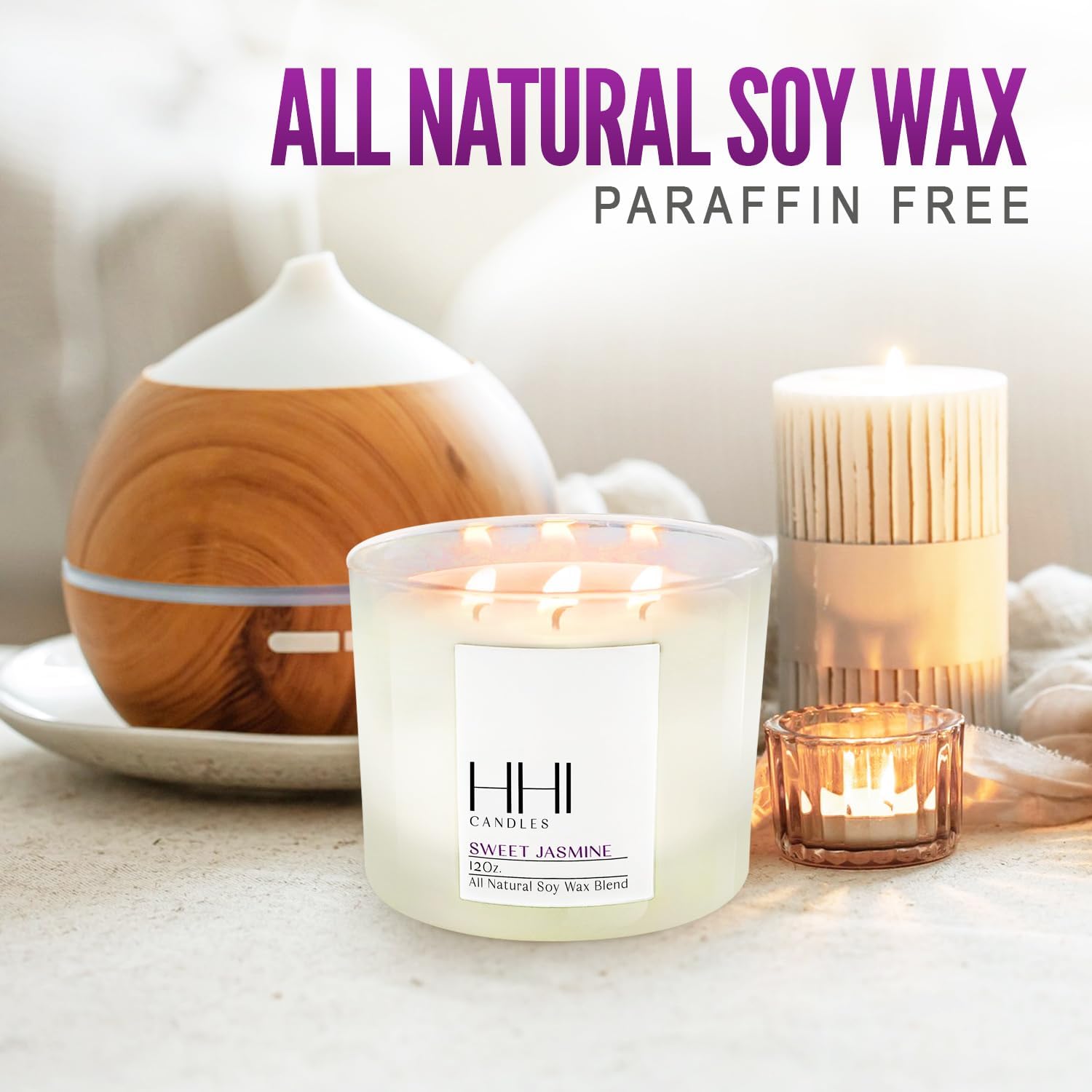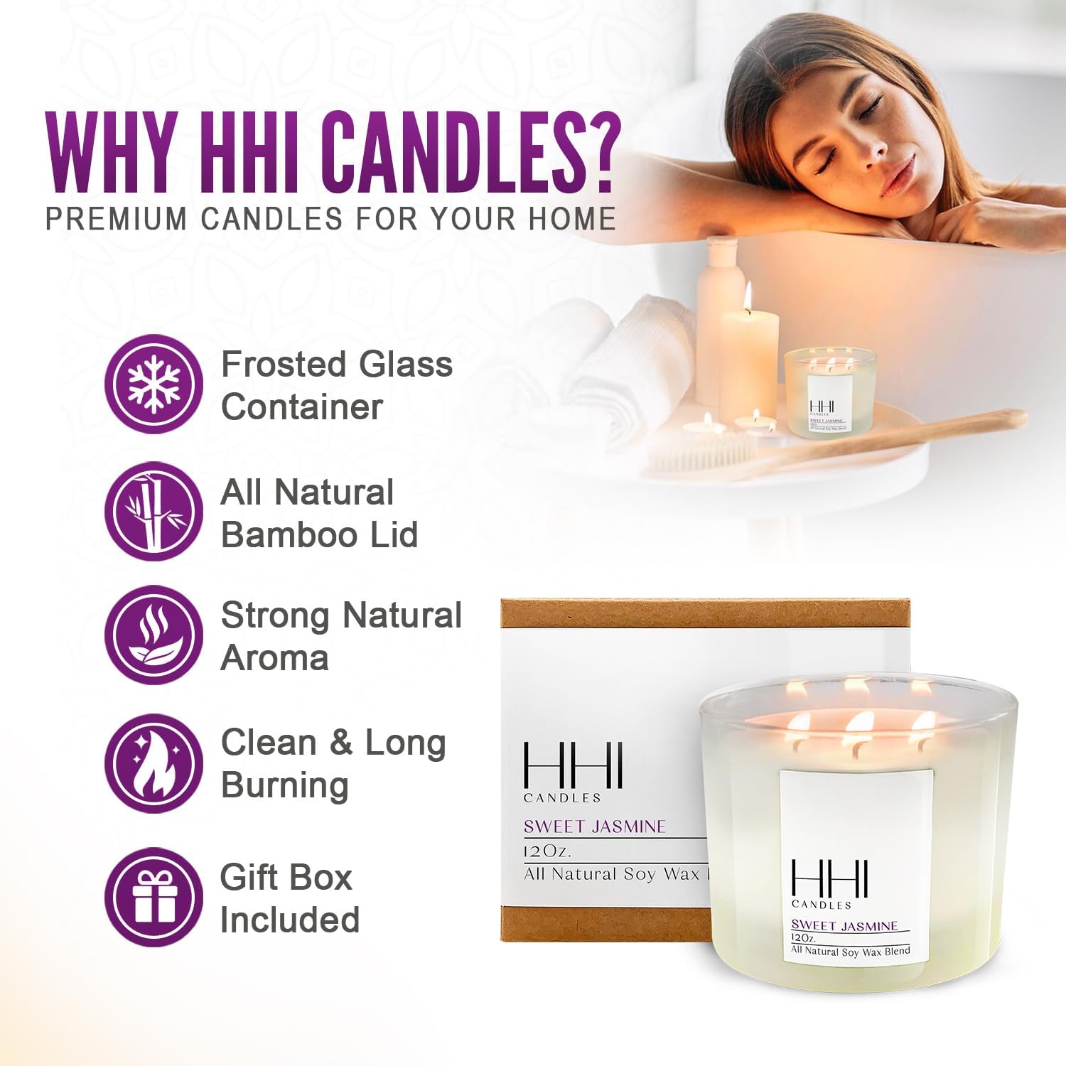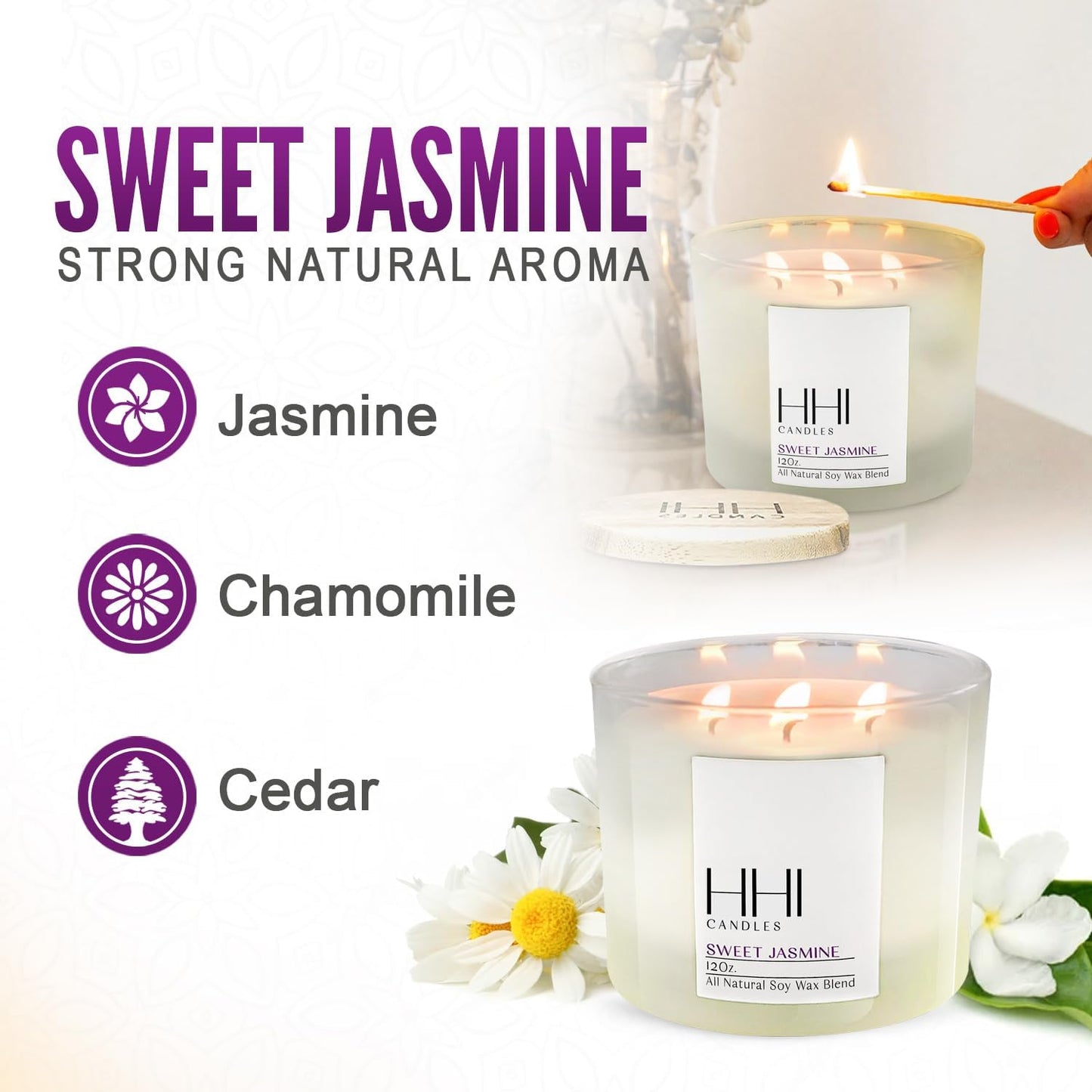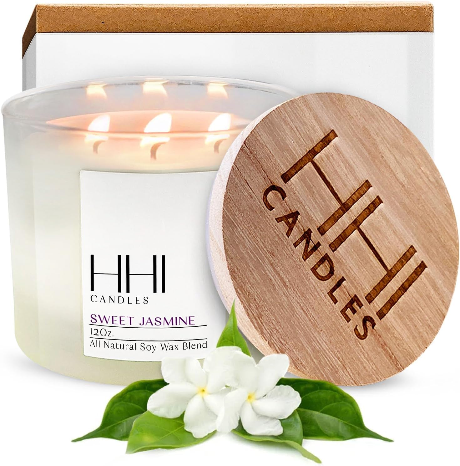 HHI All-Natural Scented Soy Candle | Sweet Jasmine | A Fresh Blend of Chamomile, and Cedar | Large 12 Ounce 3 Wick | Long Burn time | Includes Bamboo Lid and Gift Box