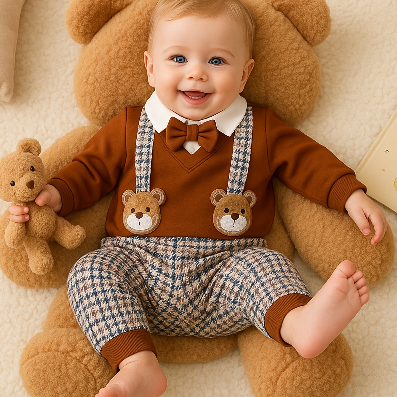 Hibobi Baby Boys' Gentleman Bear Pattern Romper Set - Polyester, Machine Washable, Non-Transparent - Perfect for Spring/Fall, Perfect for Outdoor
