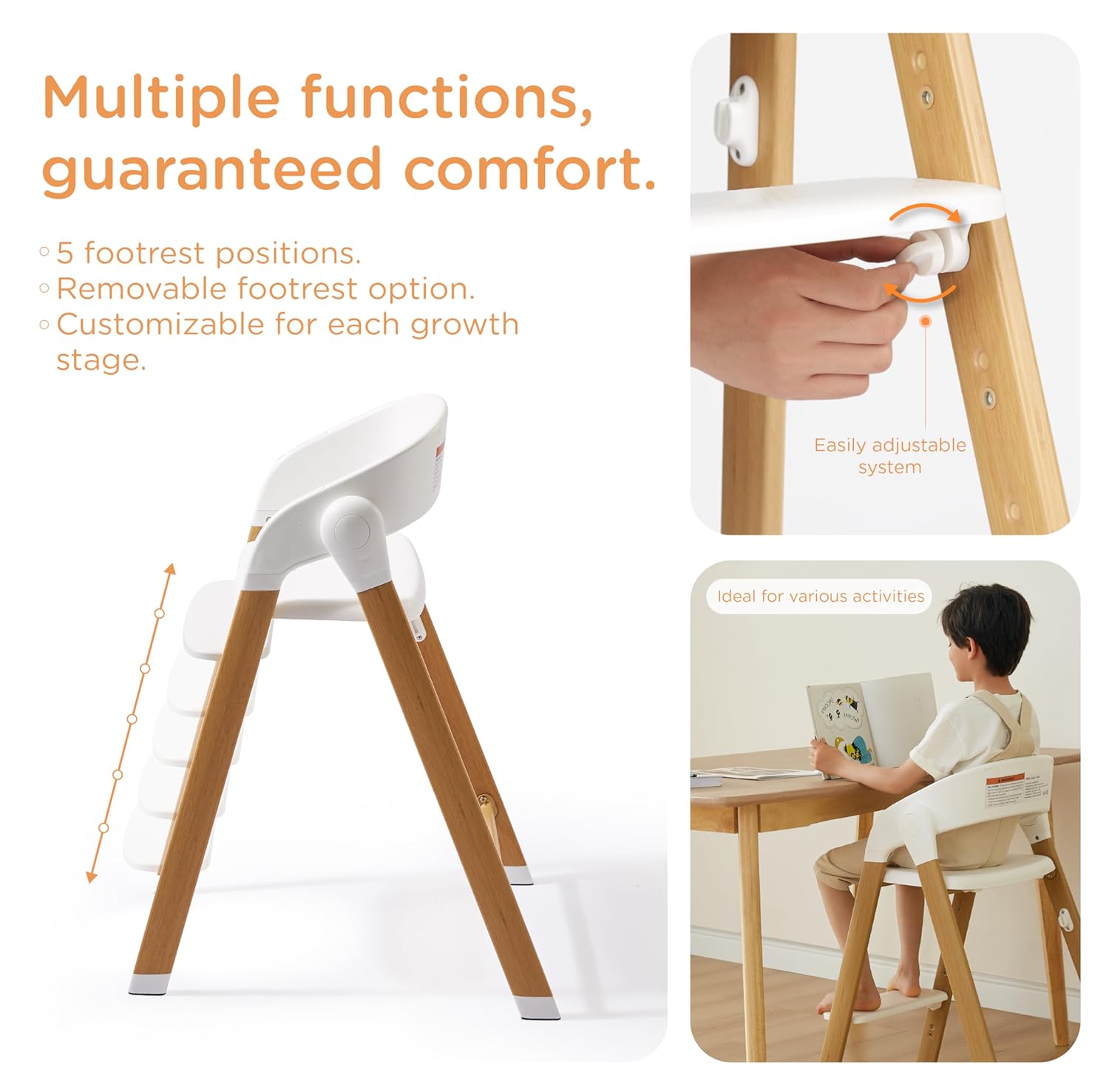 【Multi-functional and adjustable】: 5 adjustable footrest positions, 2 telescopic positions, 5 point harness, removable BPA-free tray, and an easy-to-remove seat to feed babies and children, guaranteeing comfort and functionality. No tools are needed for adjustment.
