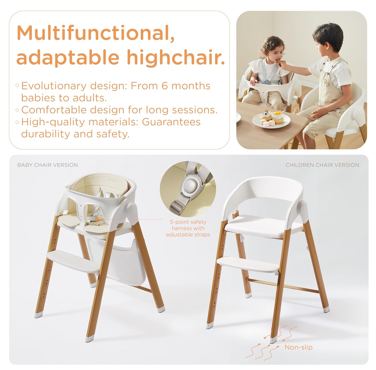 High Chair for Babies and Toddlers Adjustable Foldable Convertible 5 Point Harness Easy Clean Wood-Printed Metal with Removable Tray Baby Highchair for Family (White&Natural Wood-Printed Metal)