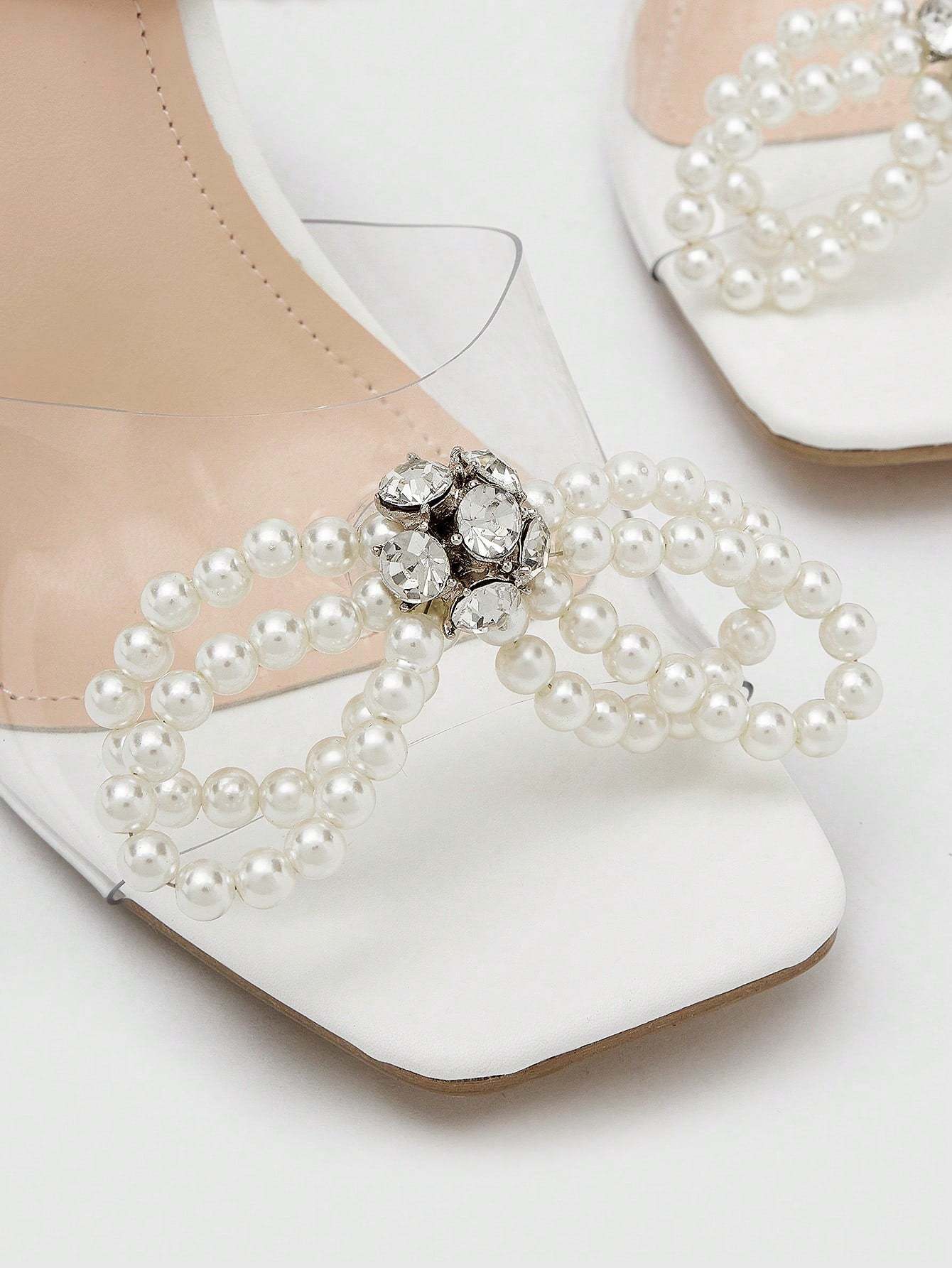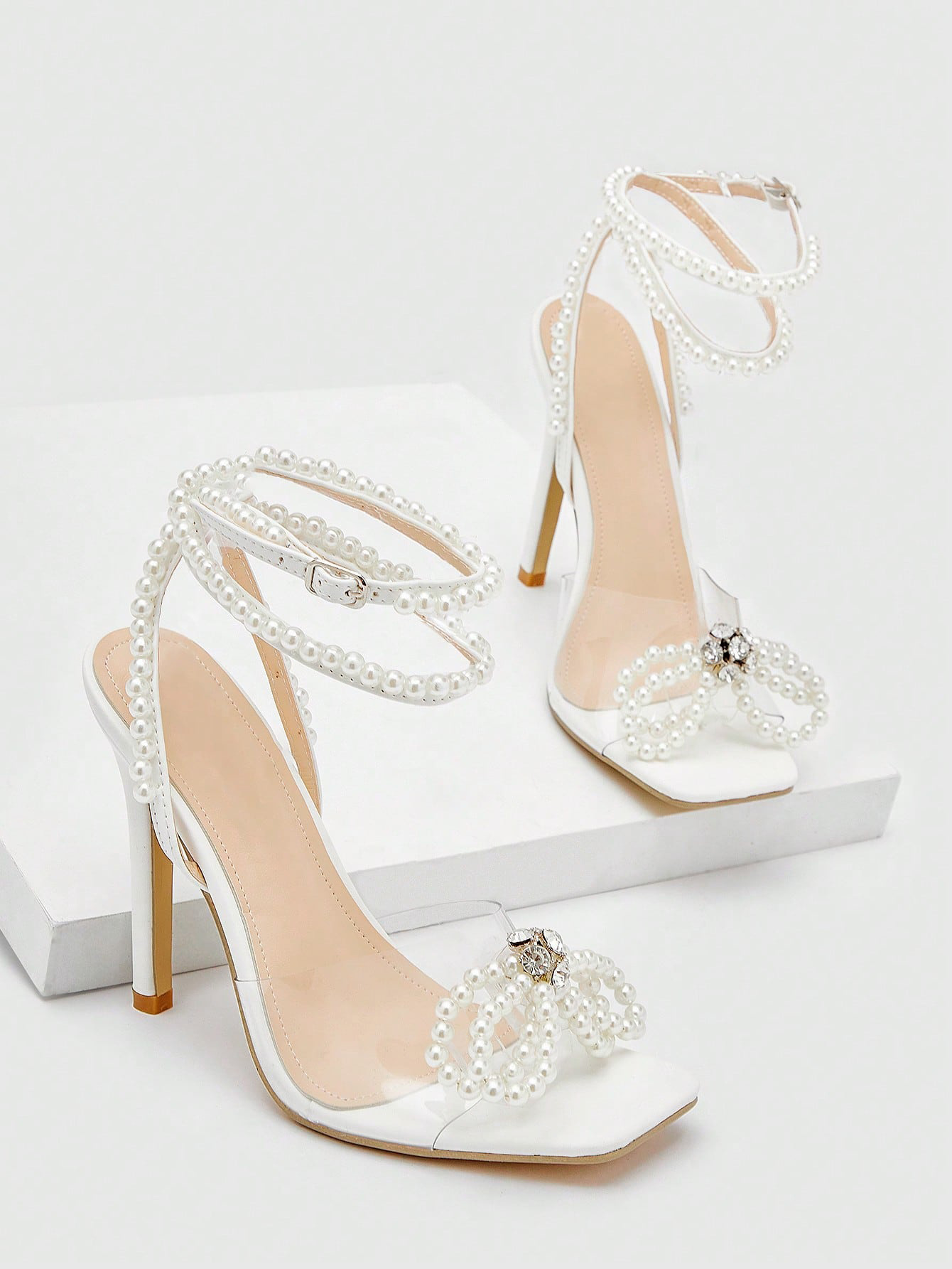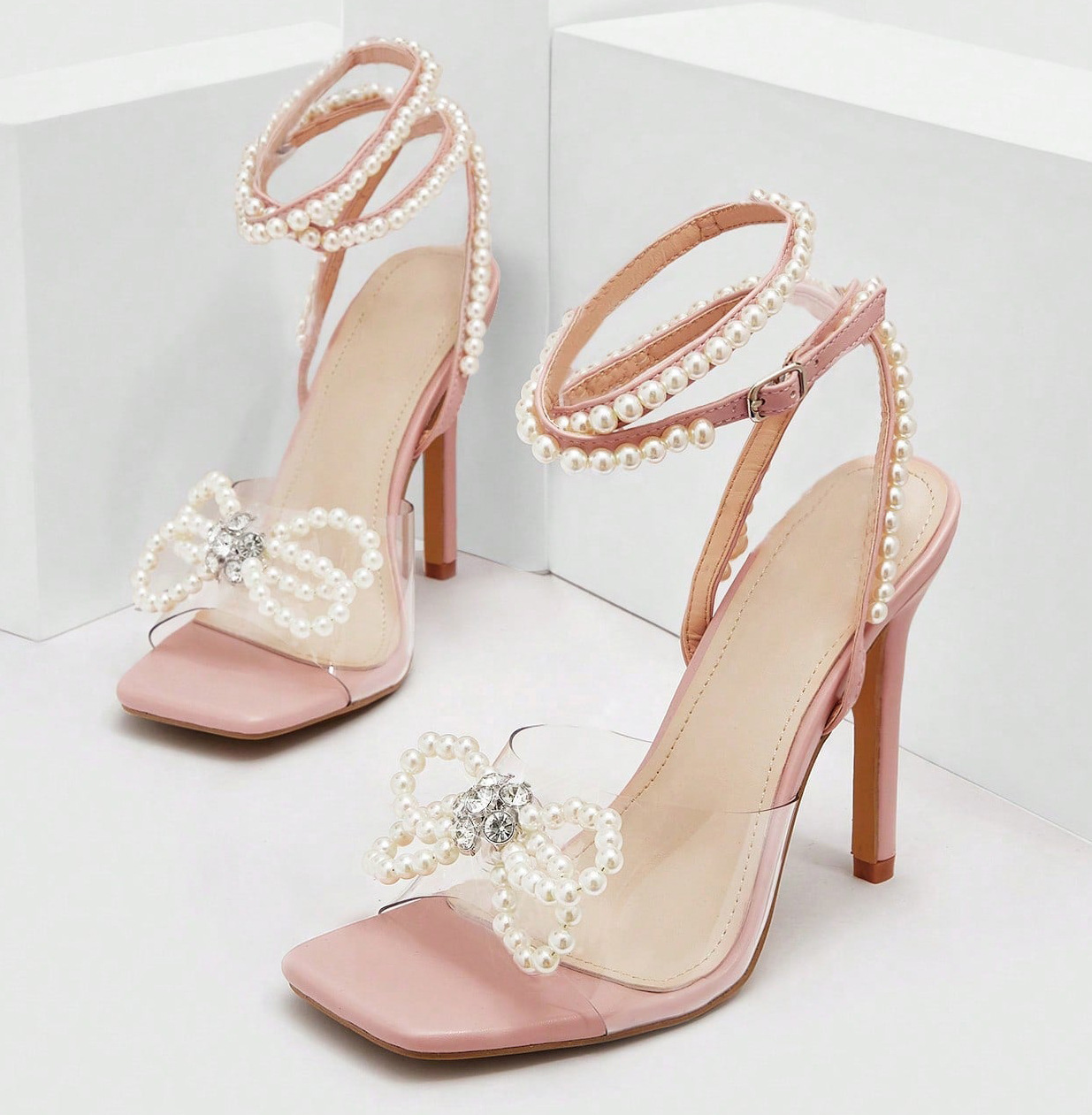 High Heel Sandals Women Heels Heart Pearl Rhinestone Bowknot 11cm Stiletto Square Toe Shoes