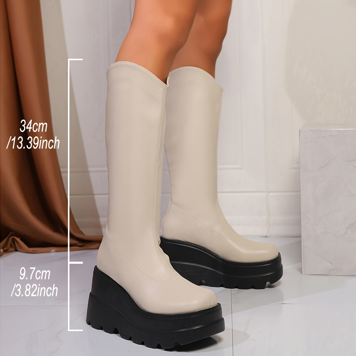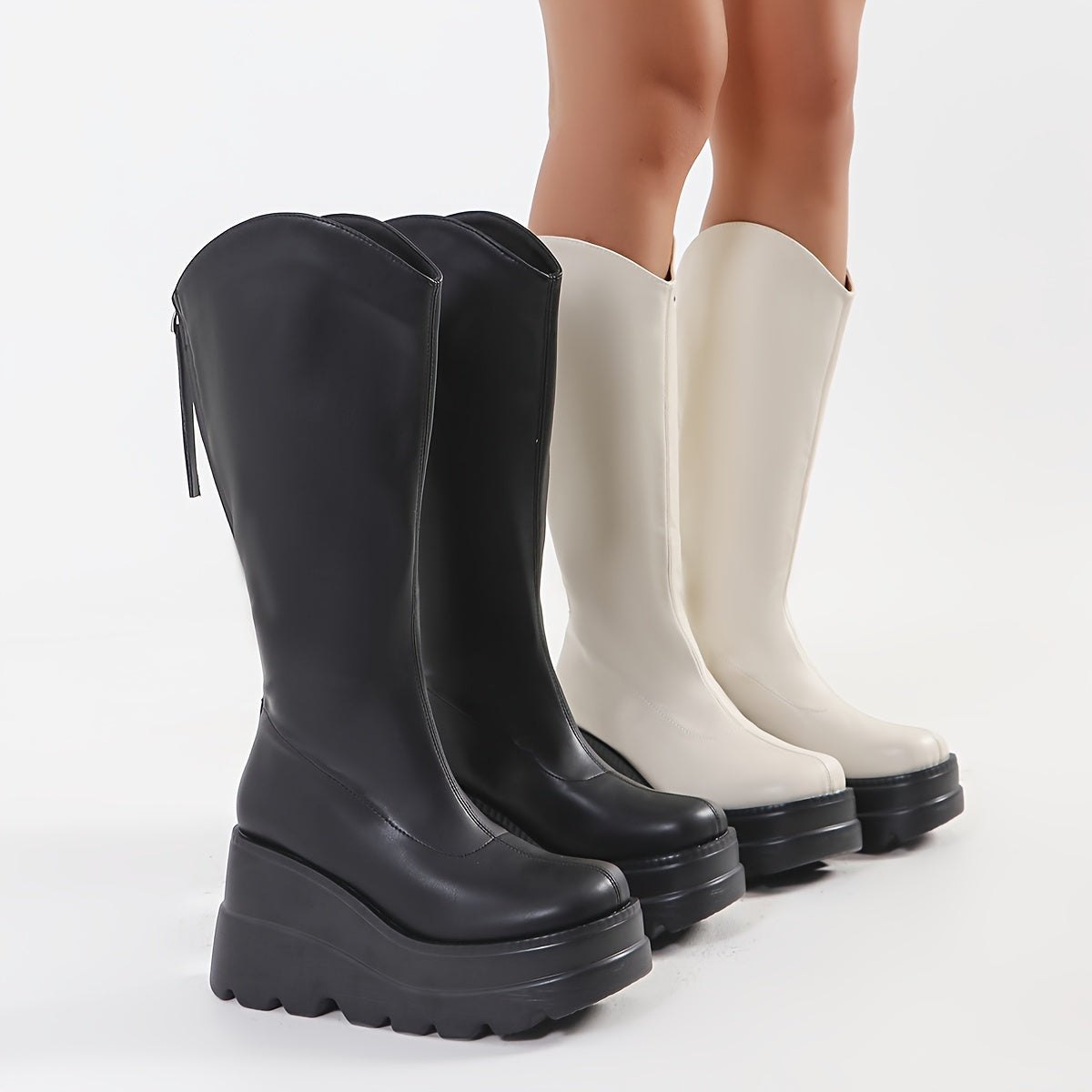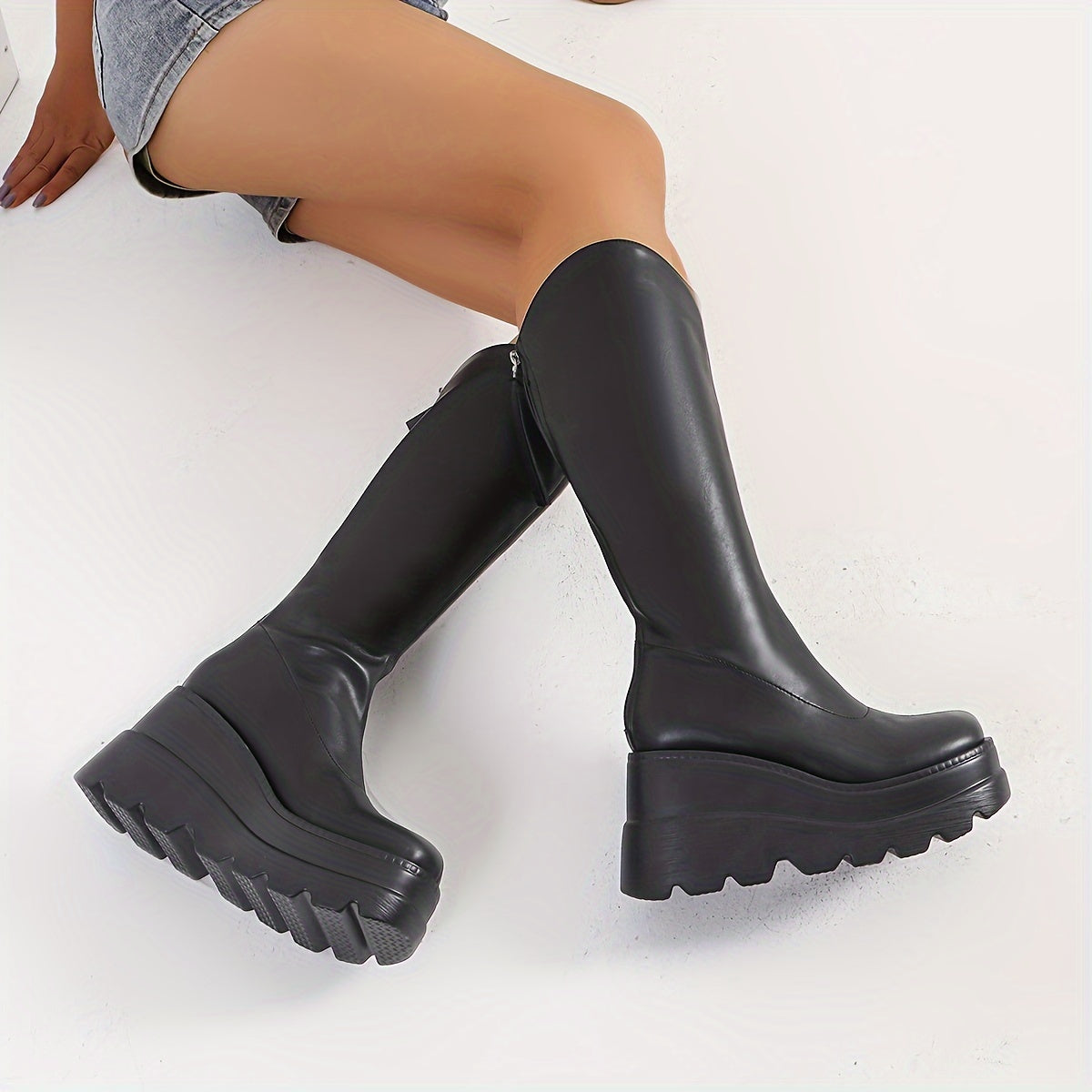 High-Platform Chunky Knee-High Women's Combat Boots - Comfortable Round Toe Chelsea Style with Polyurethane Upper, Lining, Insole & Sole - All-Season Pull-On Taizhou-Origin
