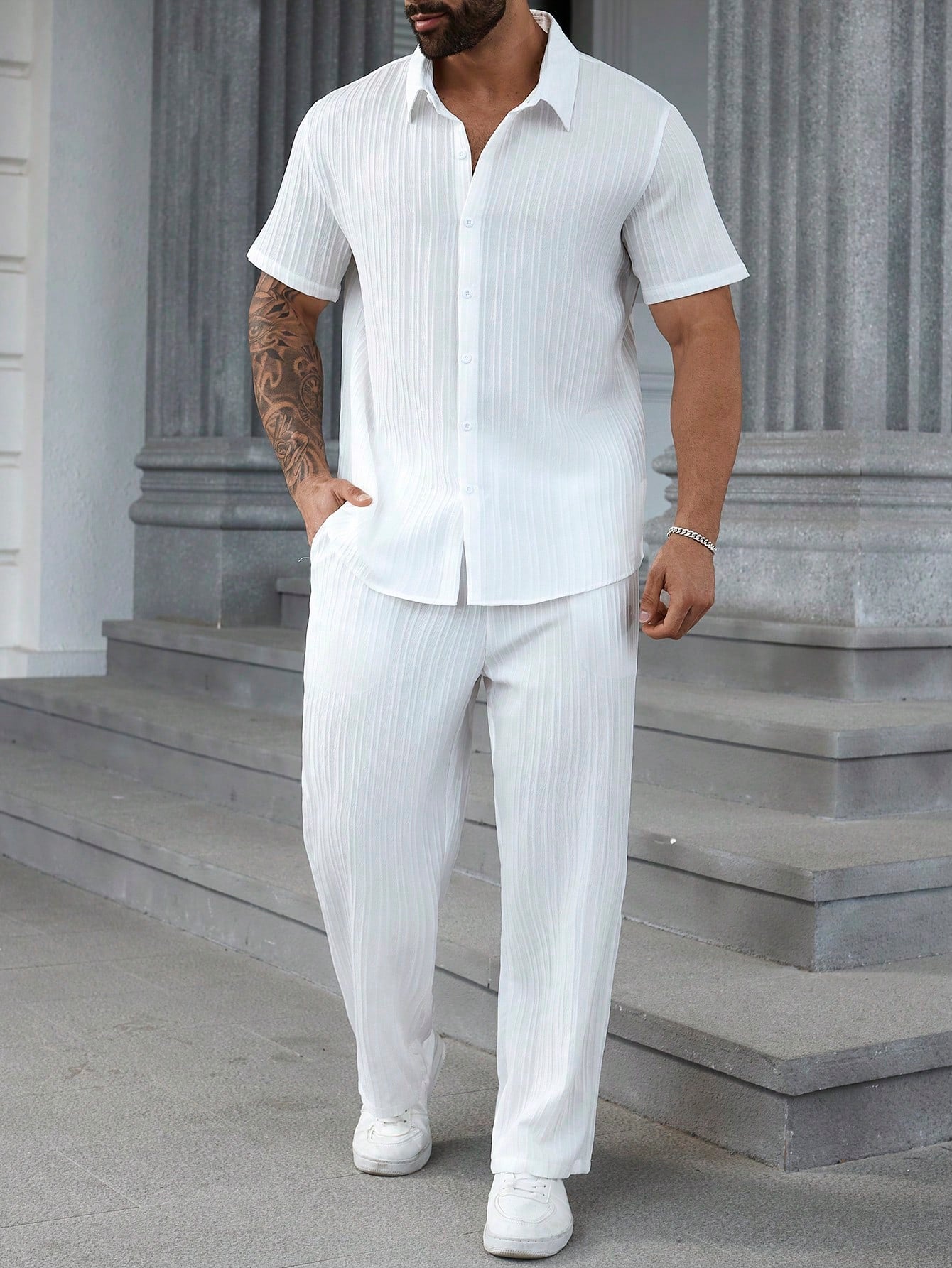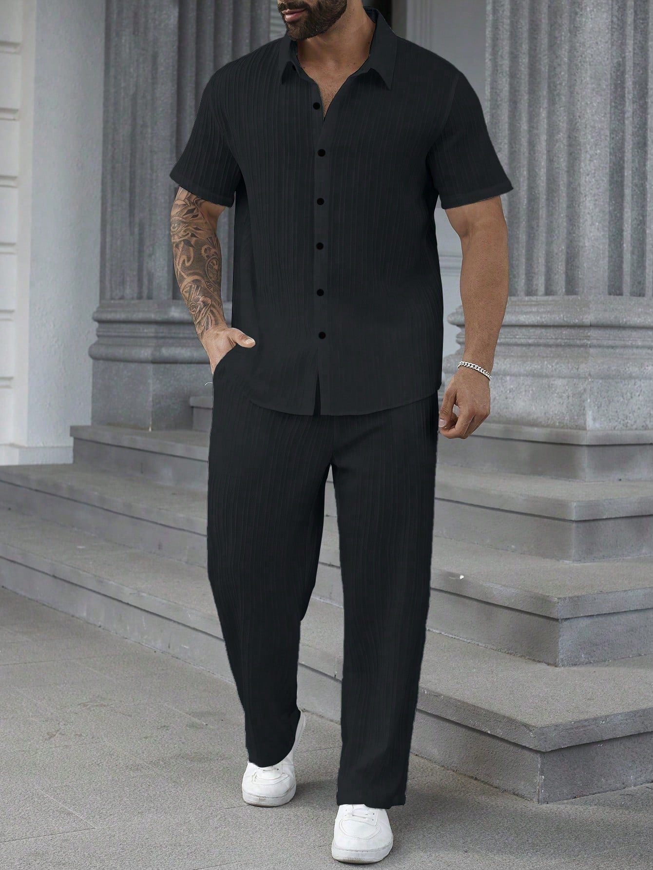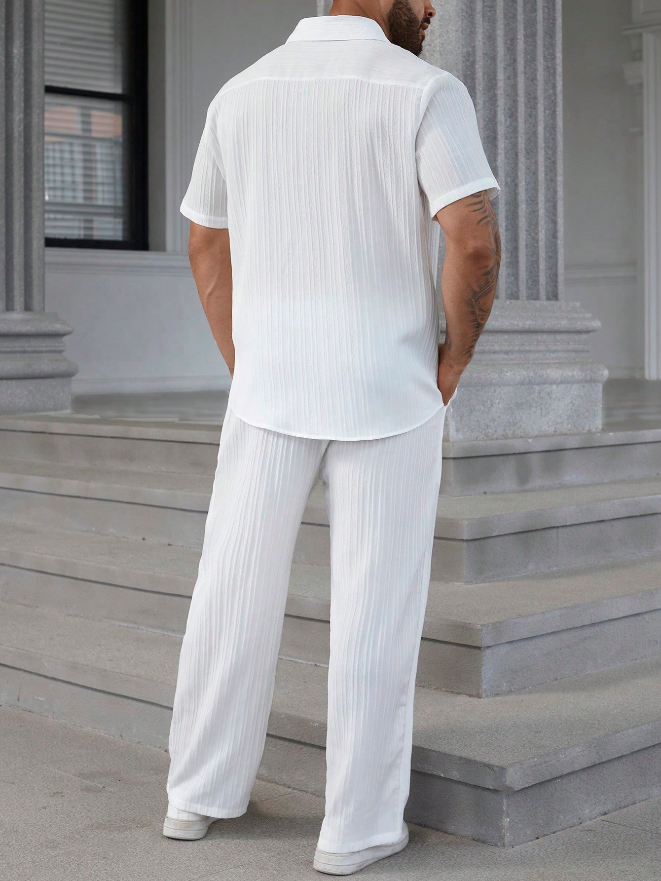 Homme Men Pocket Patched Shirt & Drawstring Waist Shorts Set, Vacation Plain Husband Casual Clothes