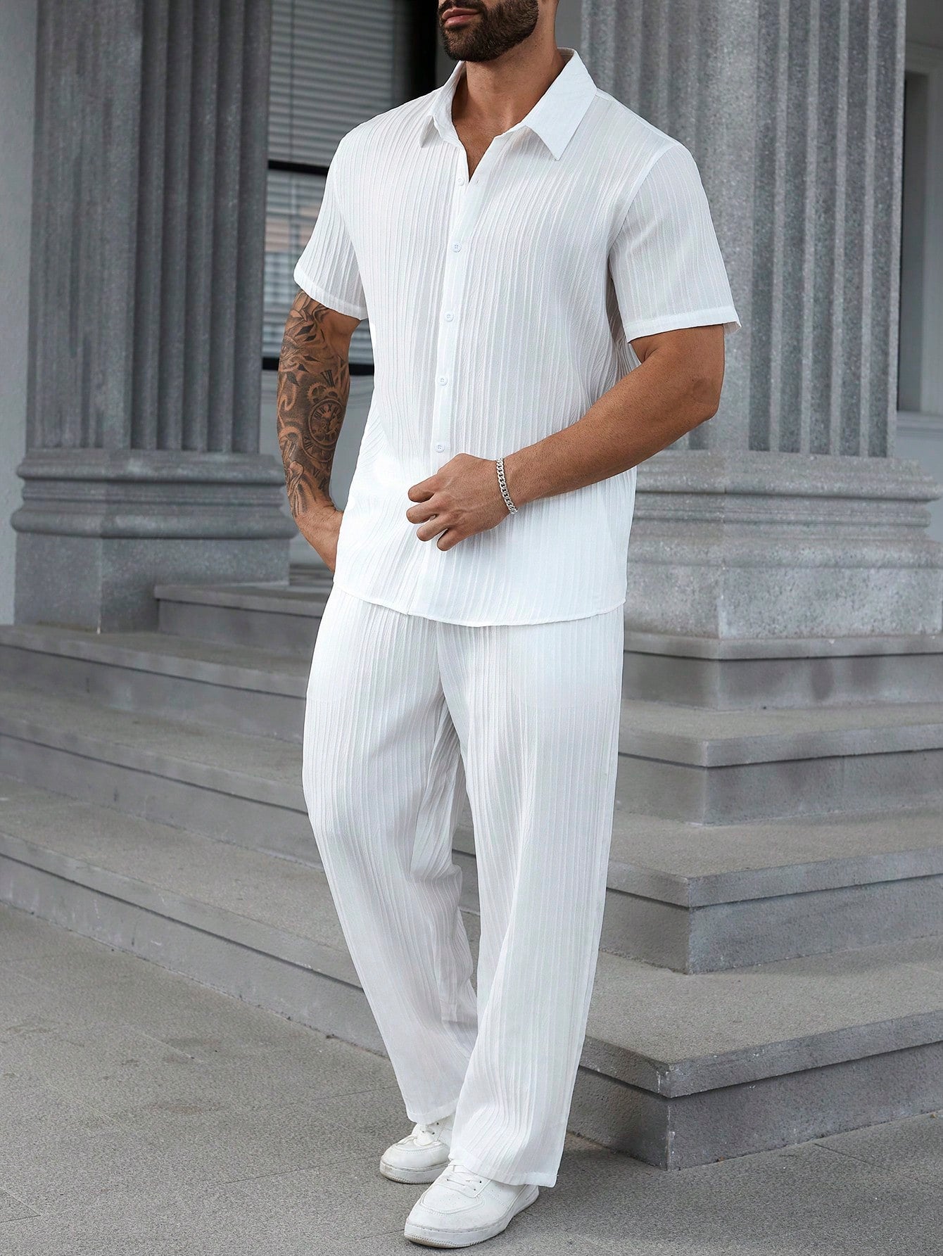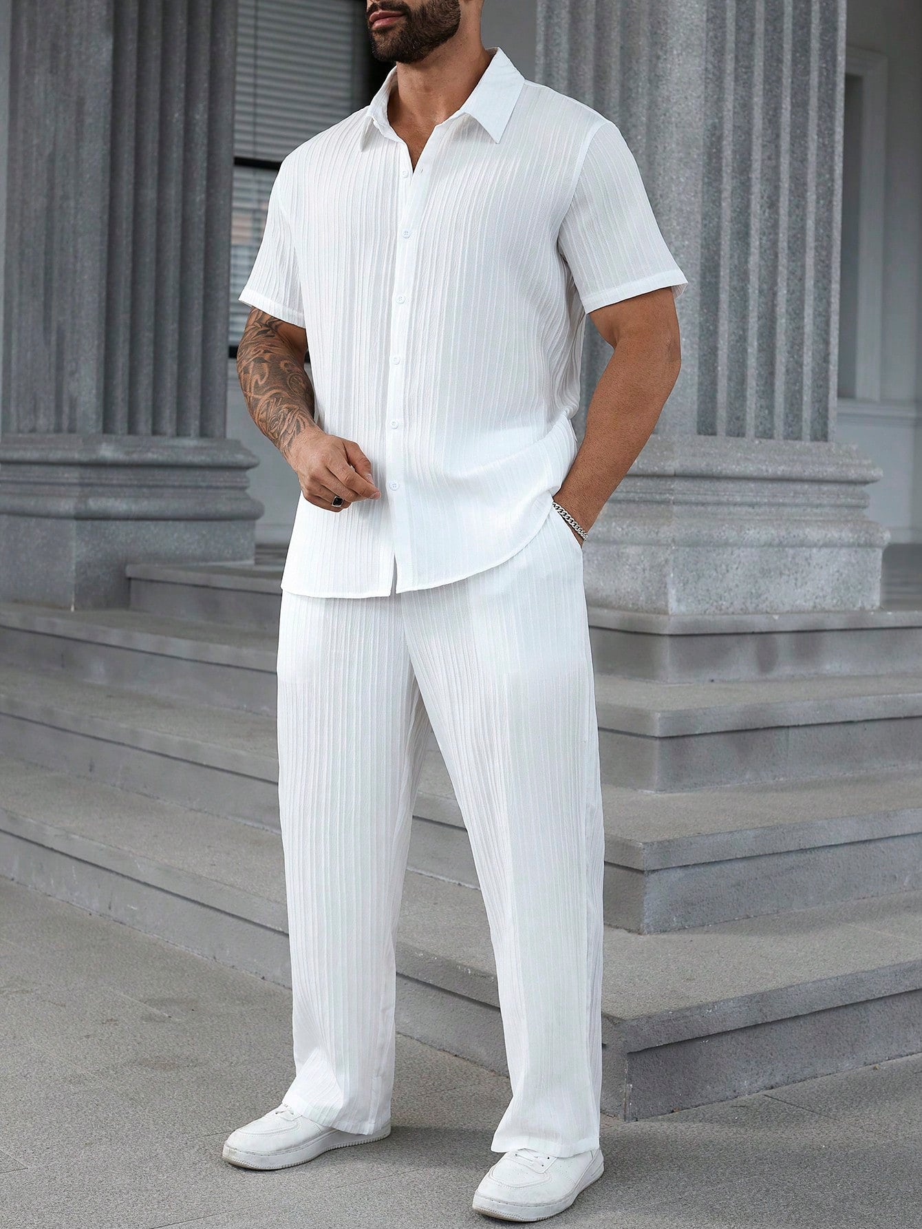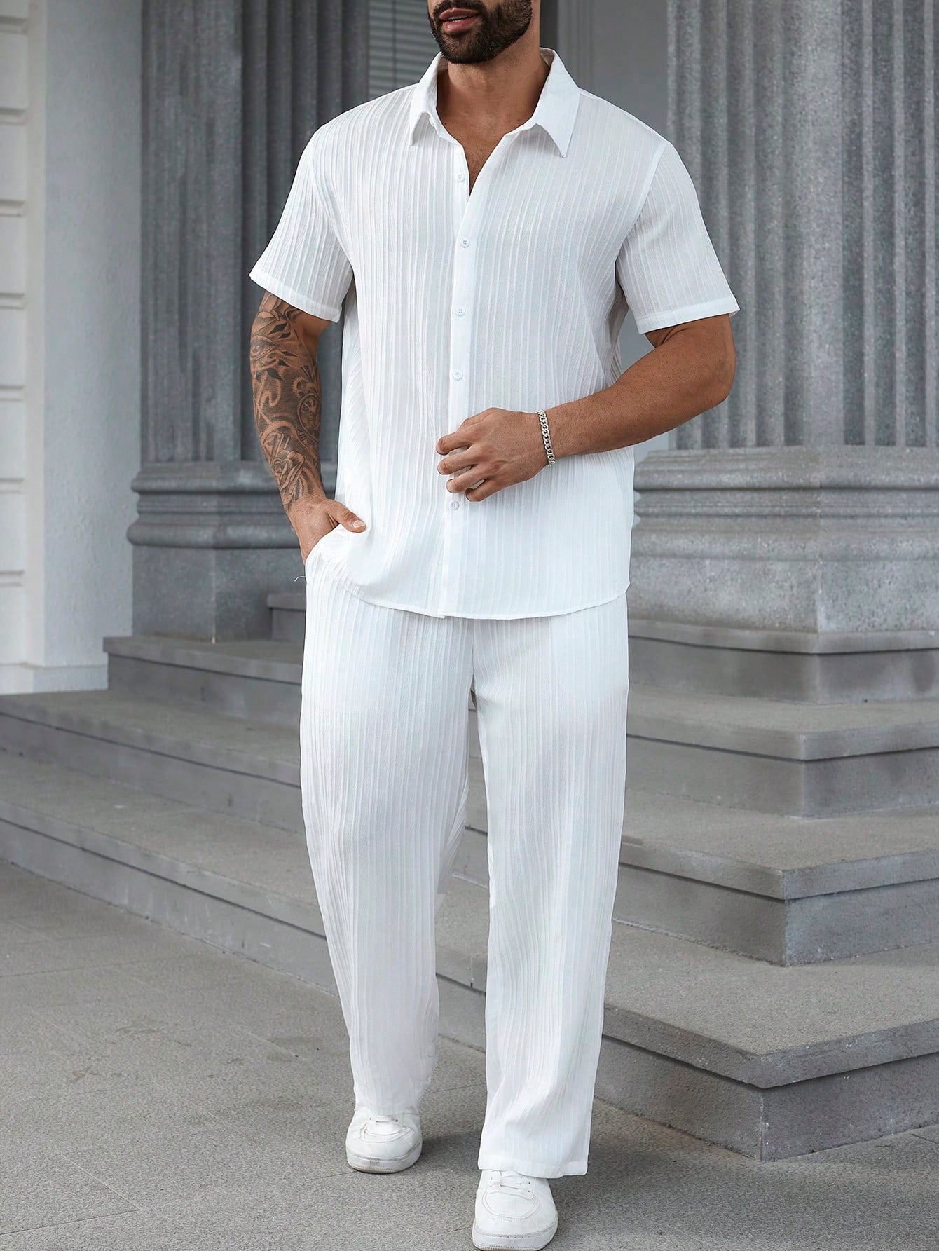 Homme Men Pocket Patched Shirt & Drawstring Waist Shorts Set, Vacation Plain Husband Casual Clothes