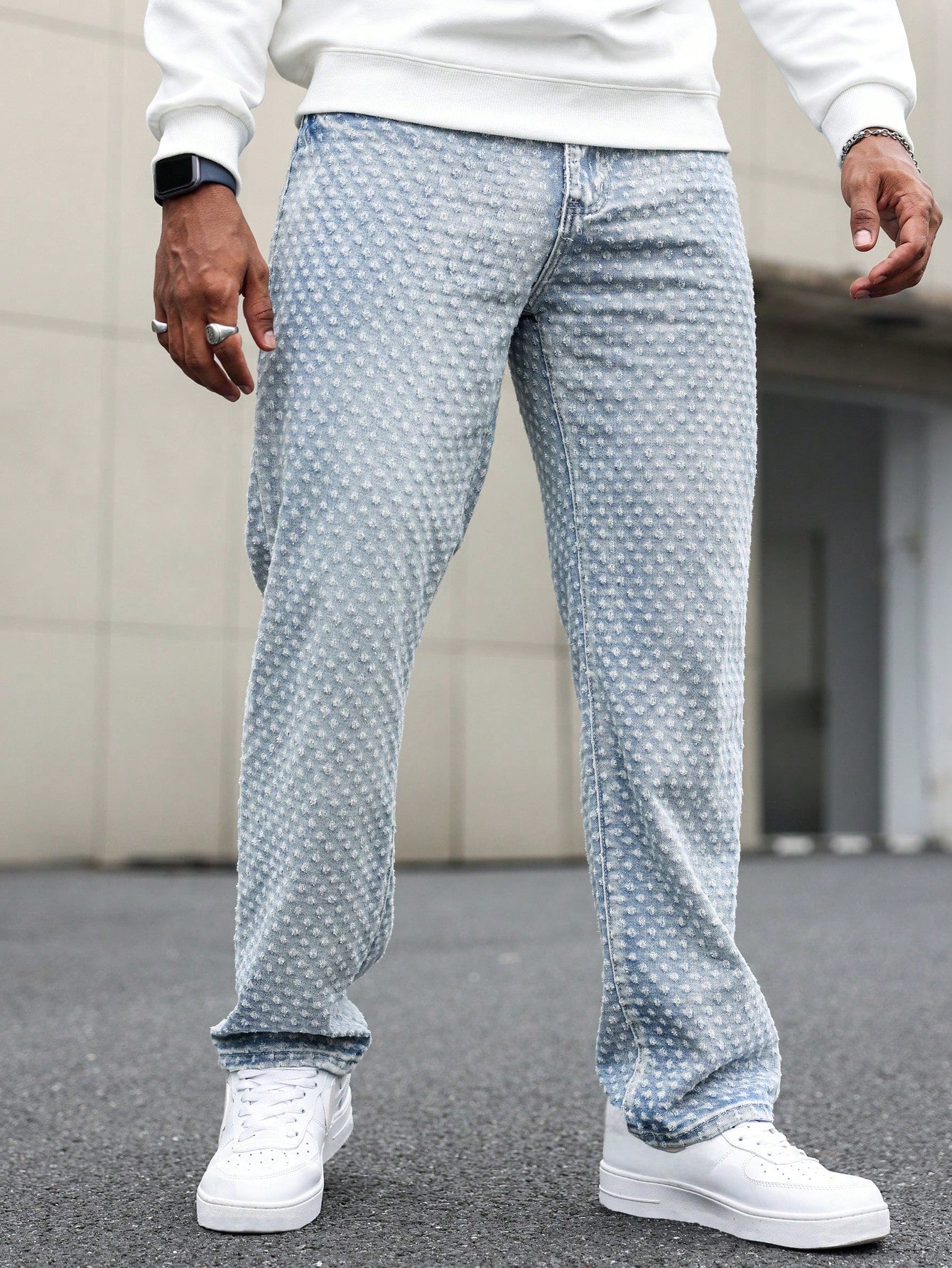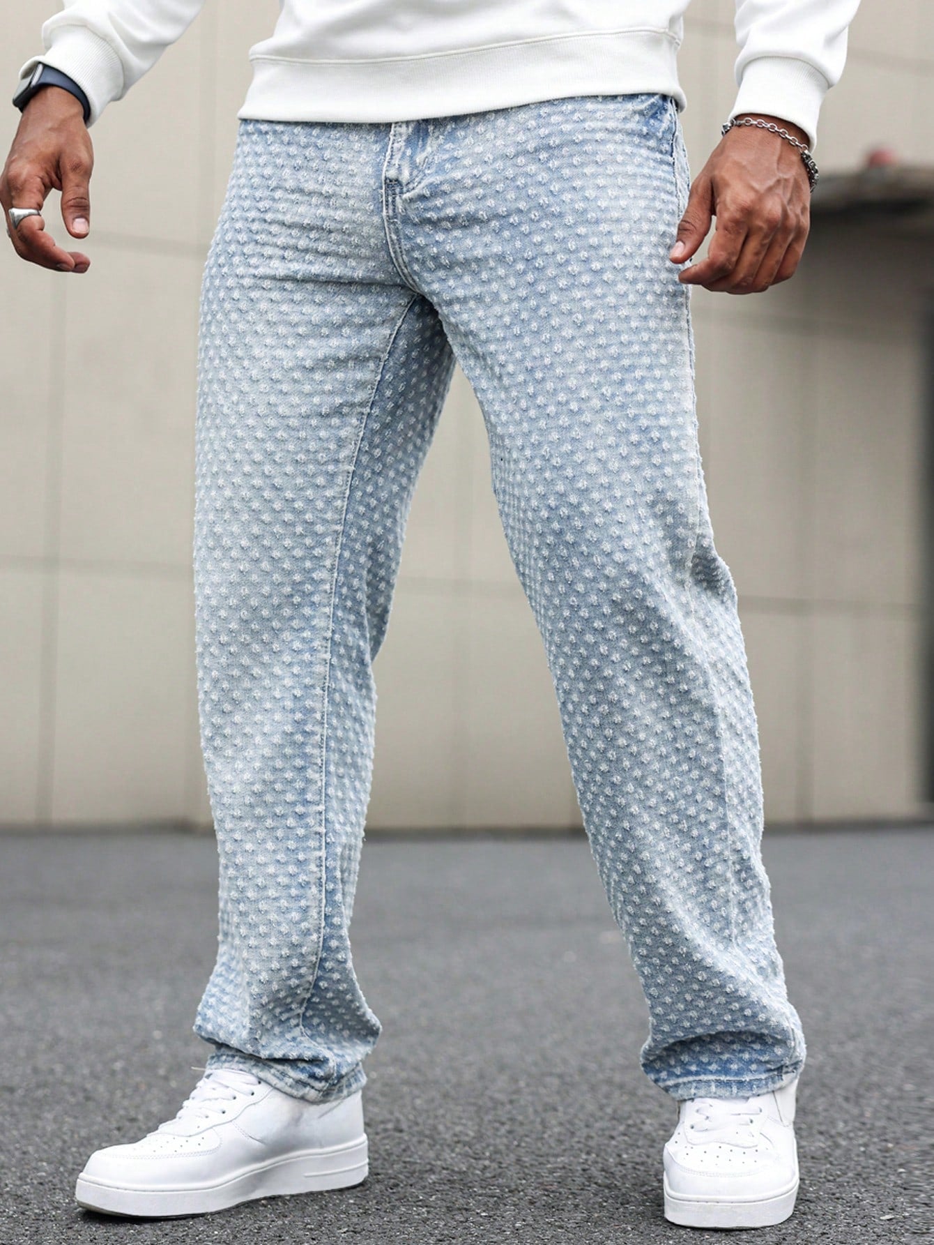 Homme Men's Casual Swiss Dot Light Blue Washed Loose Fit Jeans, Long Washed Straight Leg Cargo Jeans Light Jeans, For Husband, Boyfriend Gifts