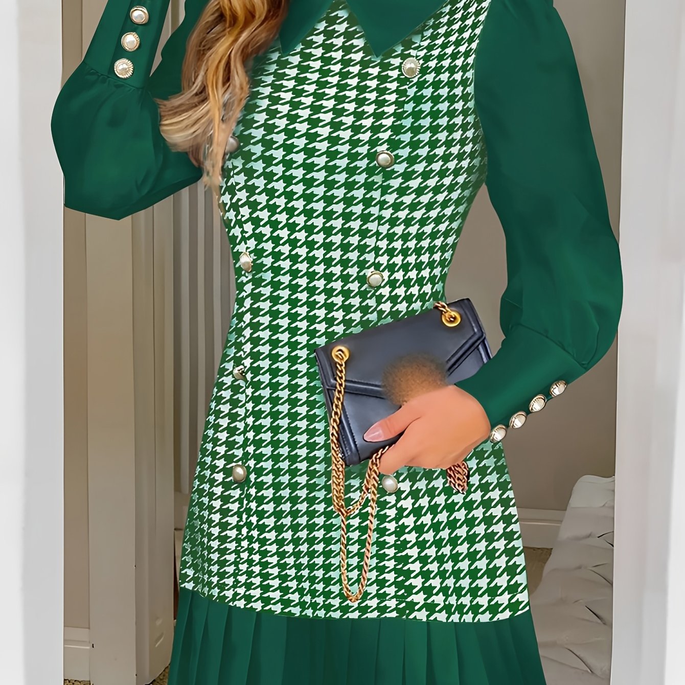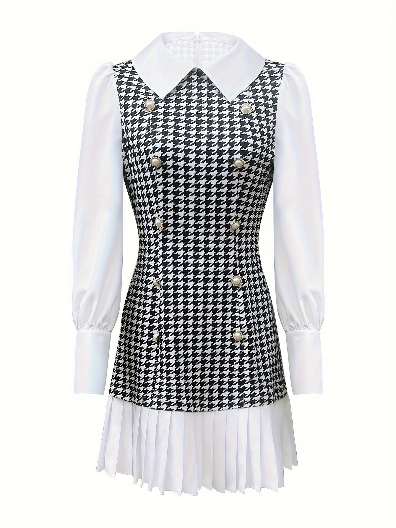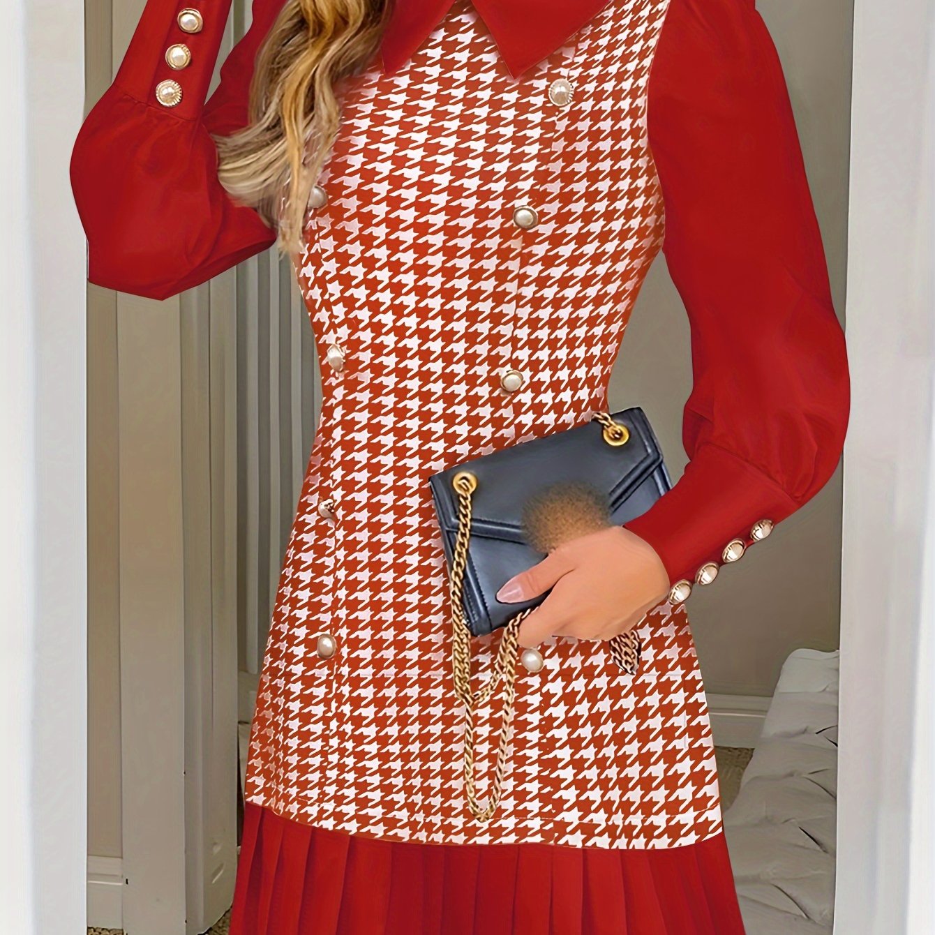 [Houndstooth Dress, Elegant Style] Long Sleeve Houndstooth Dress - Elegant Women's Polyester Blend with Red Pleated Skirt, Button Detail, Machine Washable - Ideal for Spring/Summer/Fall Events