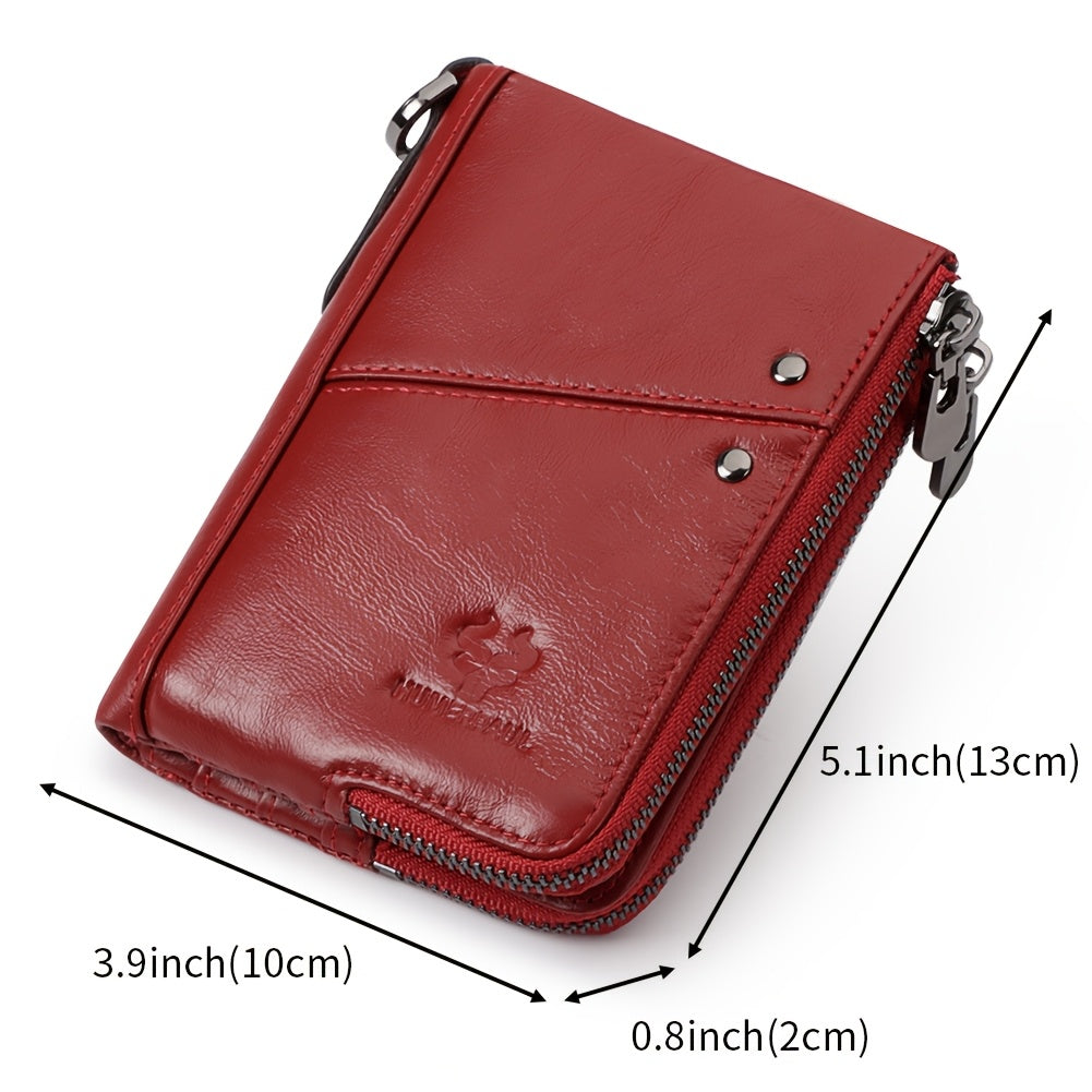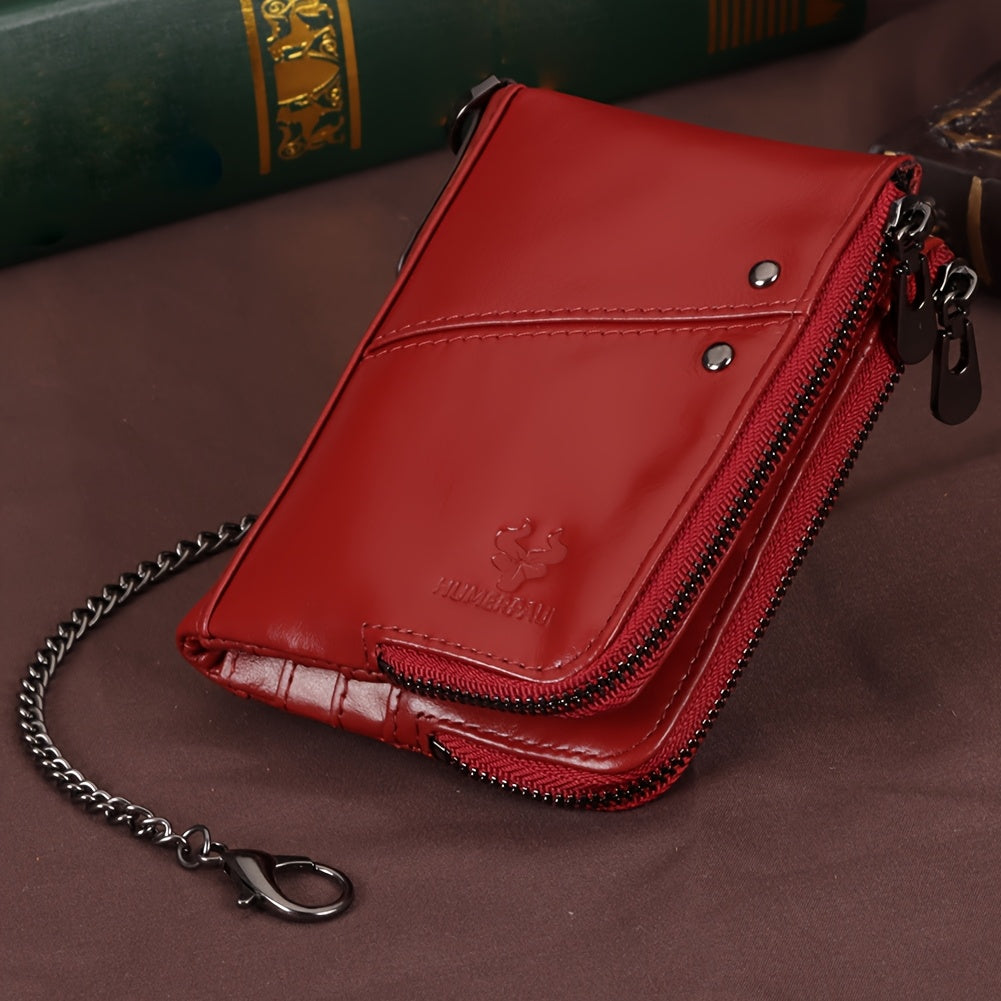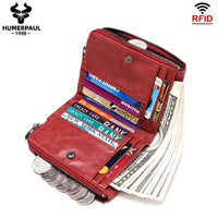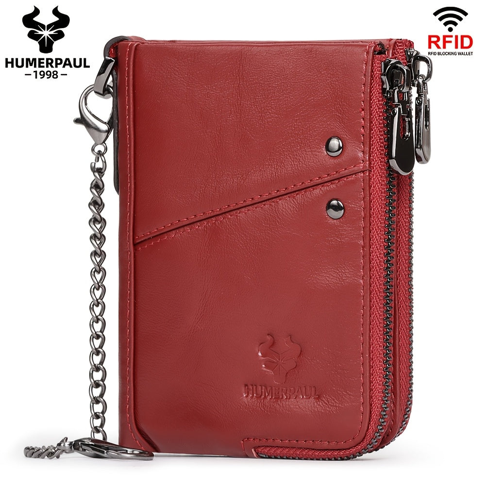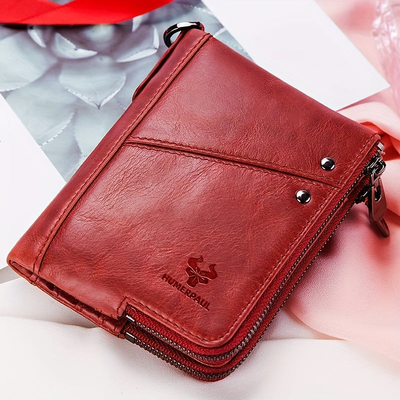 HUMEI Genuine Leather RFID Blocking Wallet for Women - Red Double Zipper Coin Purse with Card Holder, Compact Clutch Bag, Elegant Design, Multiple Compartments, Secure Snap Closure, Card Holder Wallet