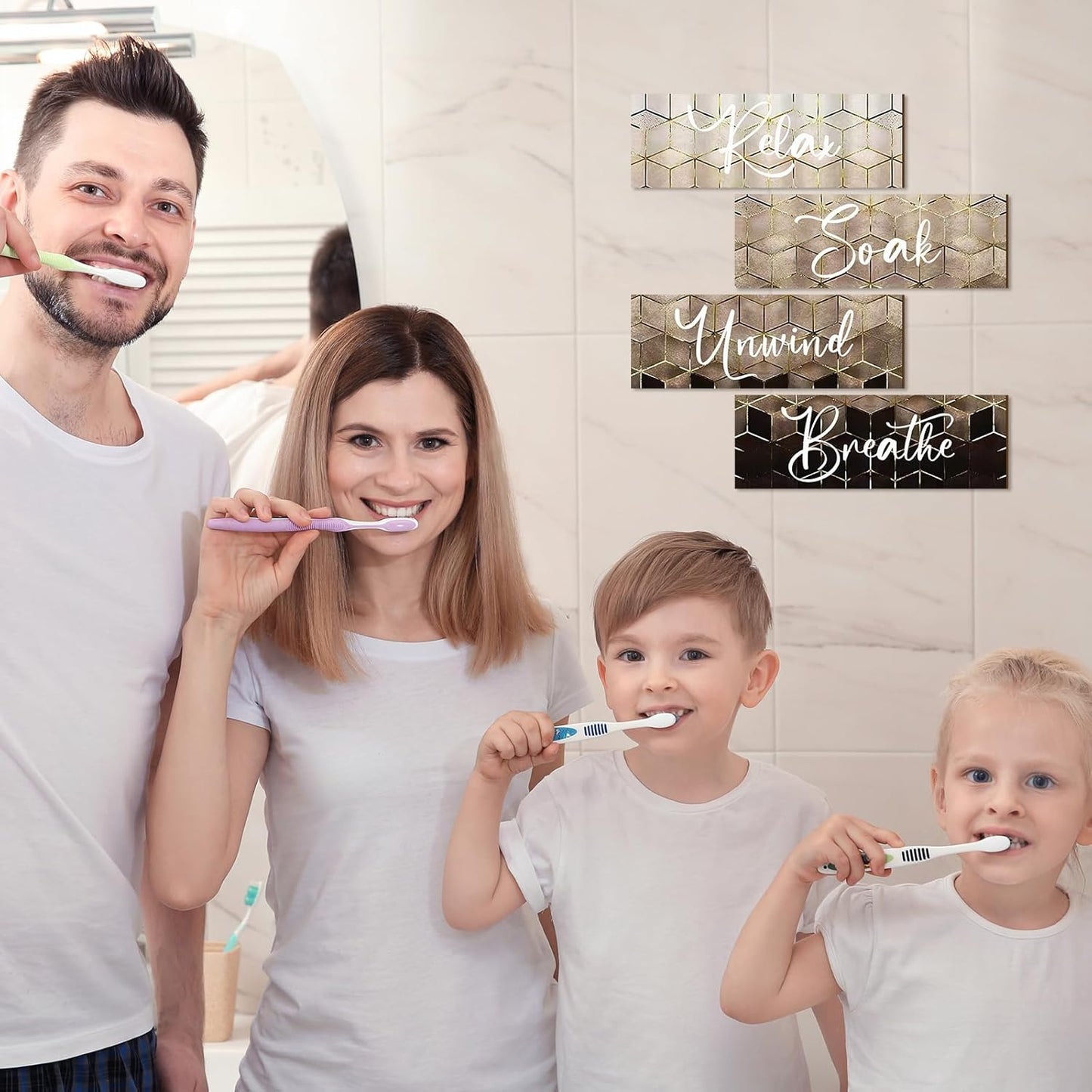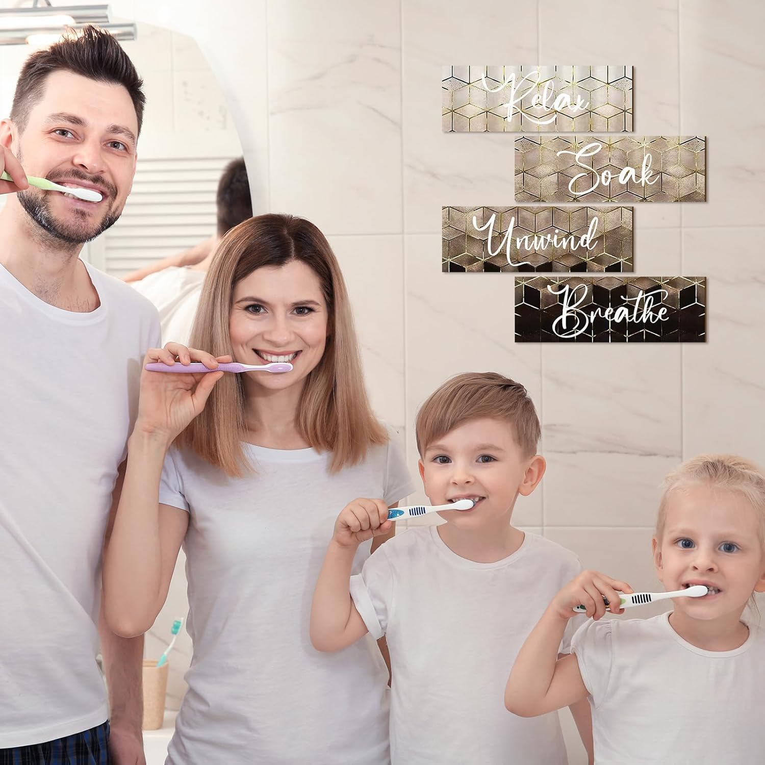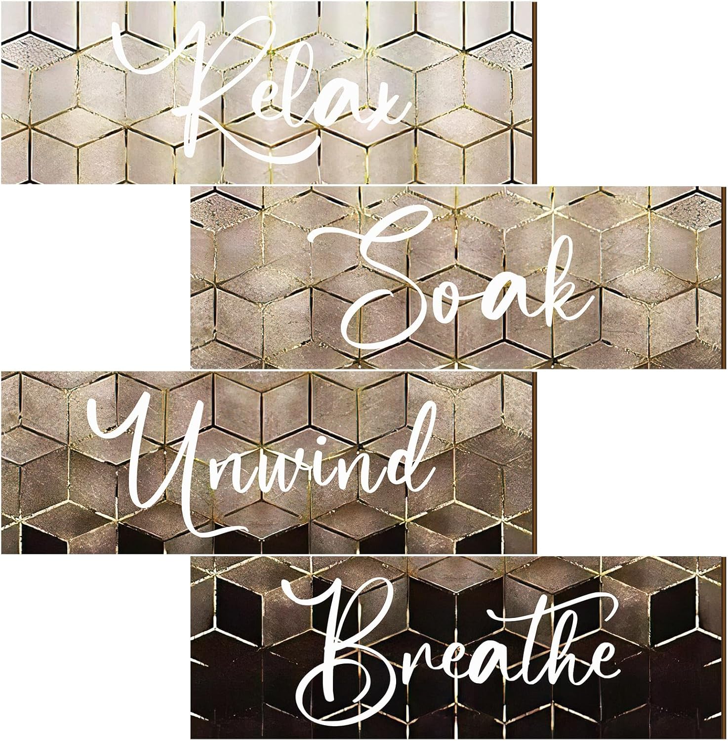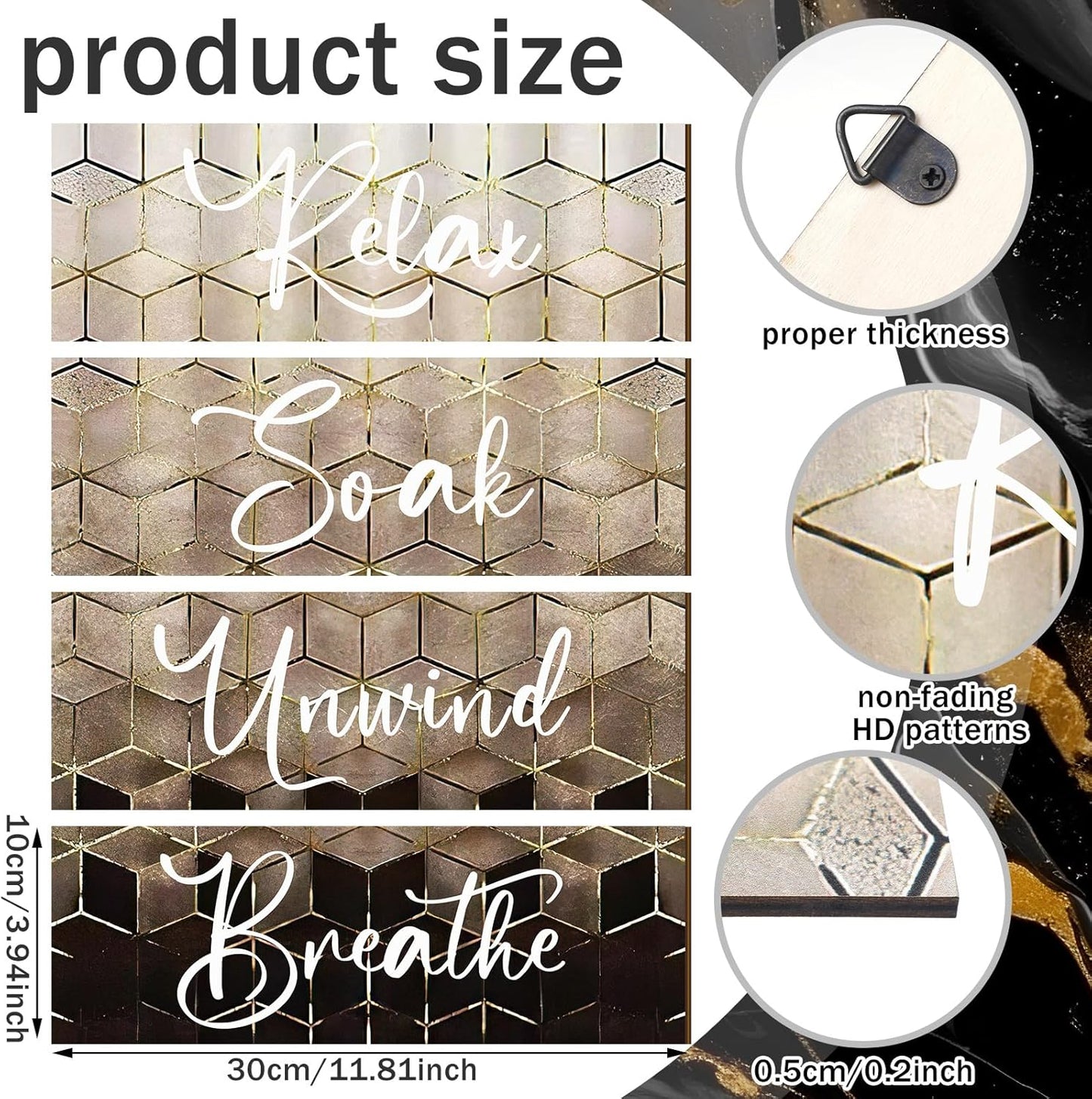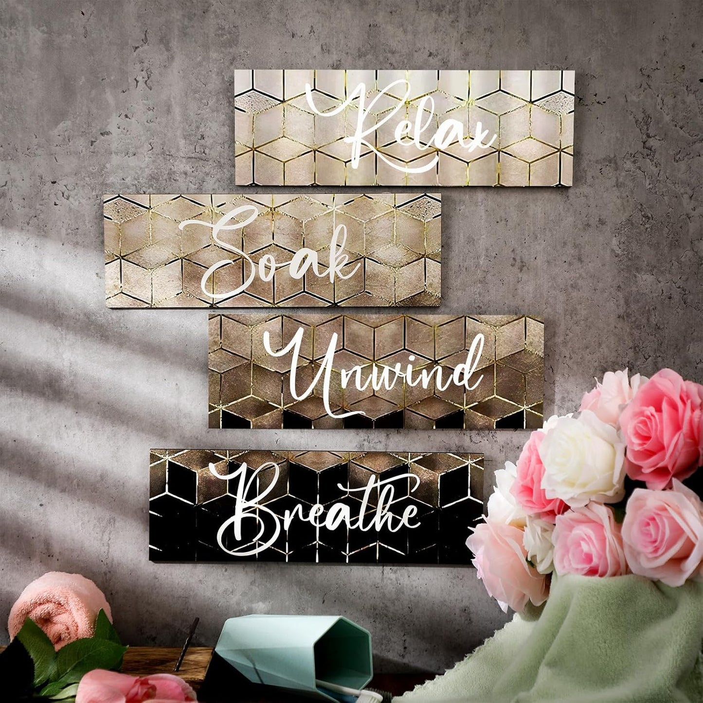 Huwena 4 Pcs Brown Bathroom Wall Decorations Modern Gradient Wood Wall Art Beige Bathroom Sign Relax Soak Unwind Breathe Geometric Golden Cubic Lines Hanging Sign for Home Living Room Toilet