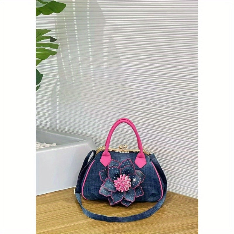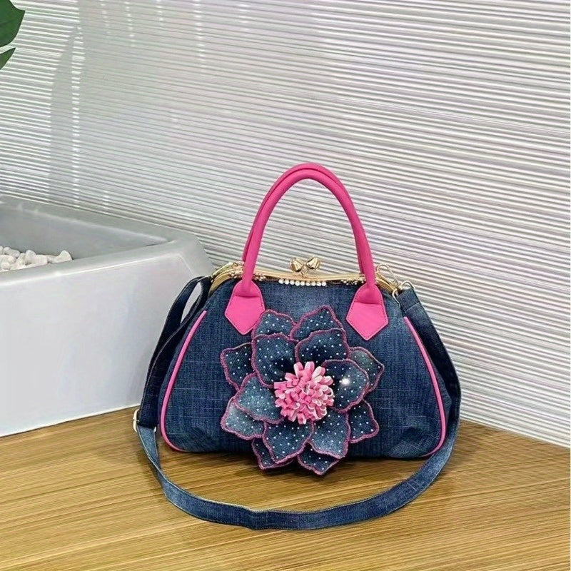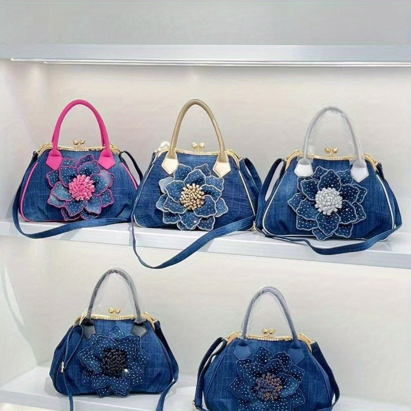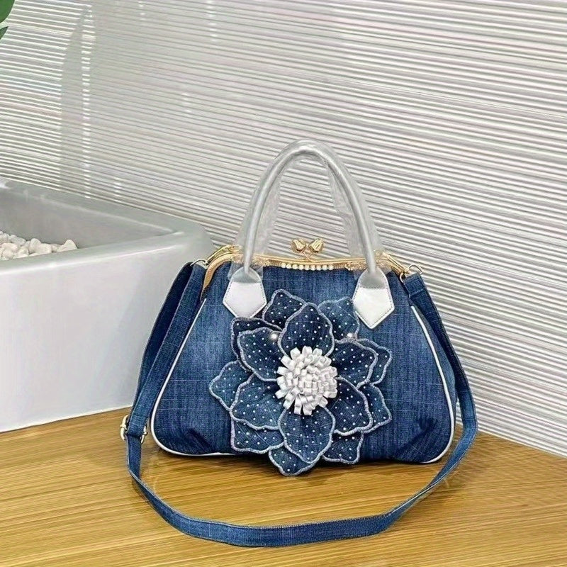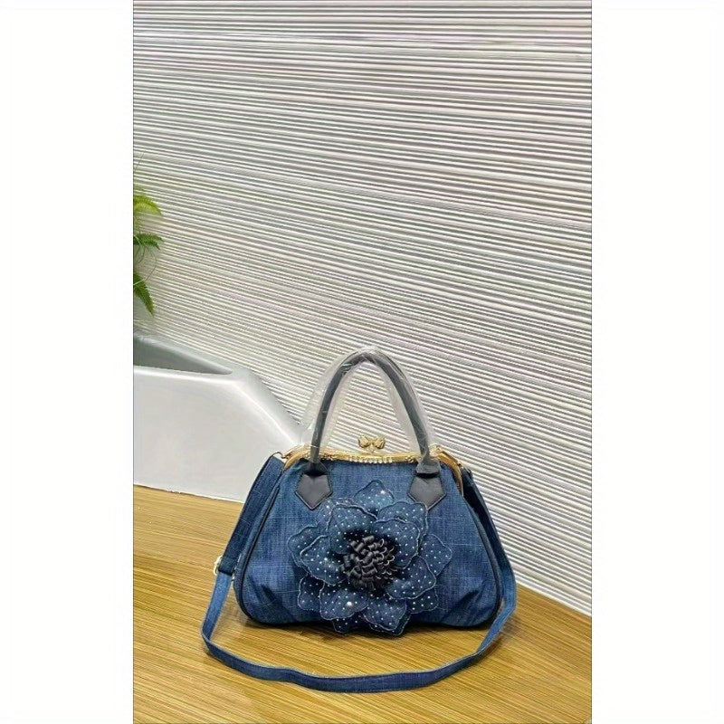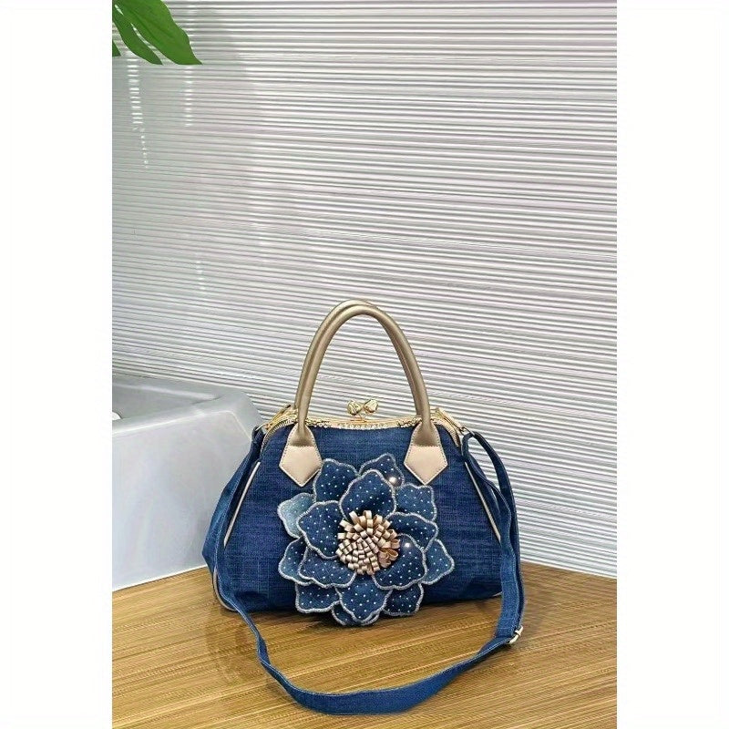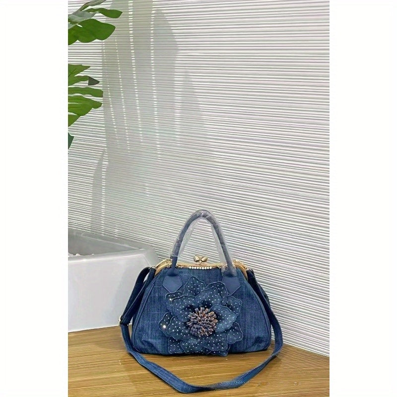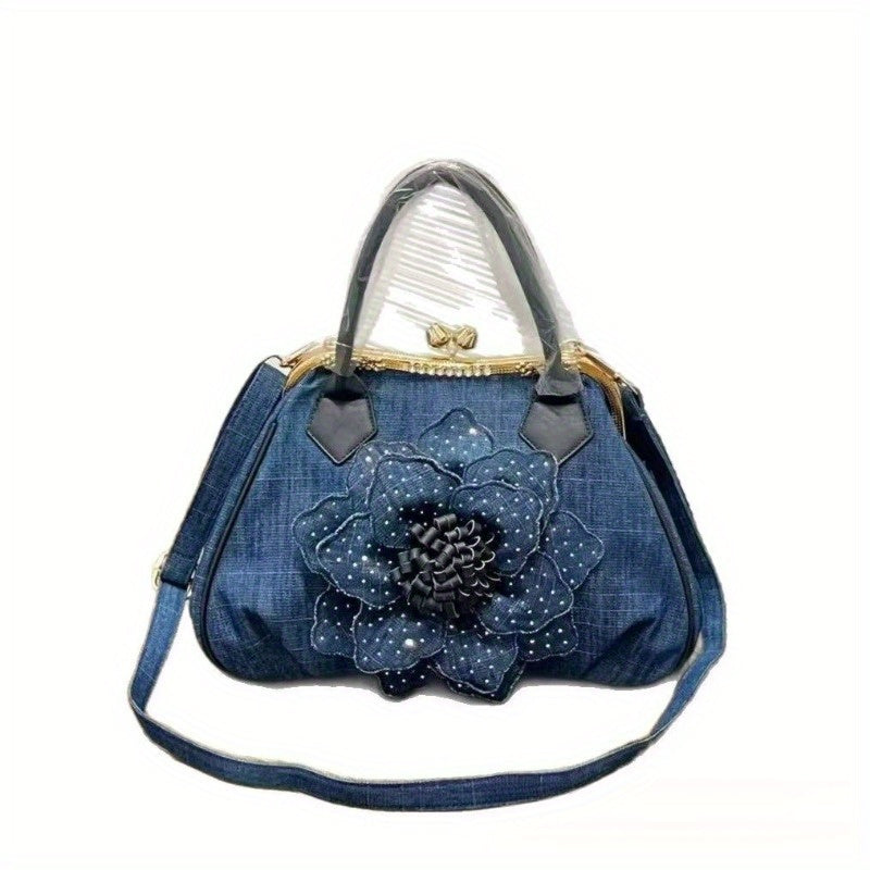 JCWFUNO Women'S Denim Crossbody Bag with Floral Embroidery - Blue Casual Shoulder Bag, Zipper Closure, Polyester Lining, European & American Style, Casual Shoulder Bag | Floral Embroidered Bag | Durable Zipper Closure, Small Crossbody Bag