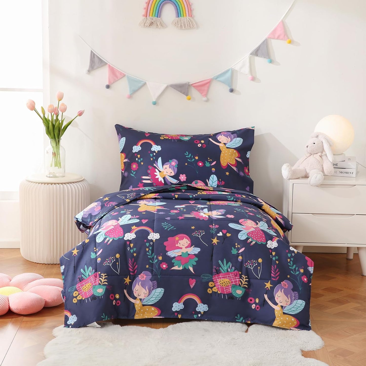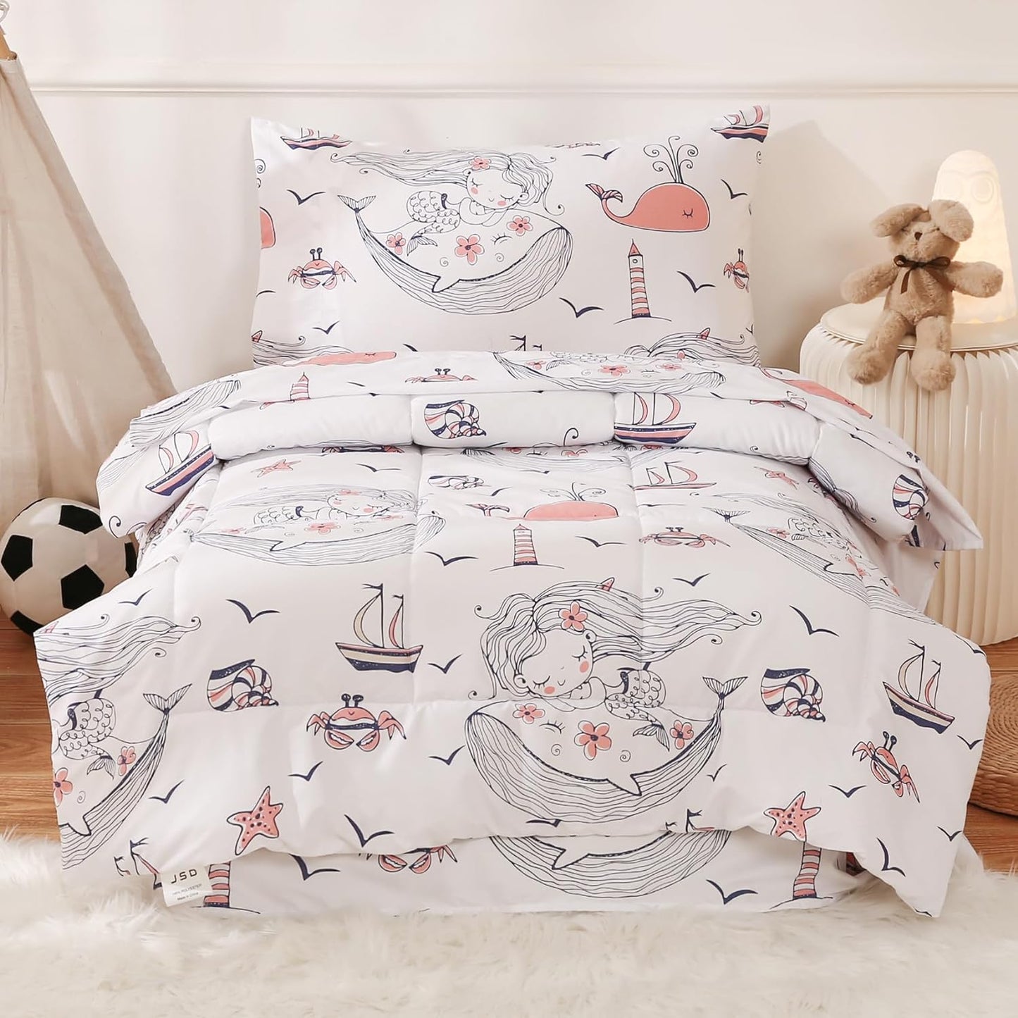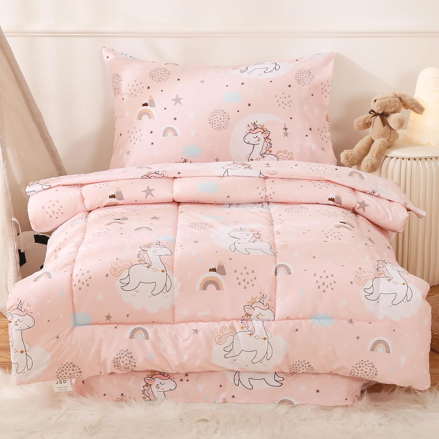 JSD Pink Unicorn Toddler Bedding Set, 4 Piece Bed-in-a-Bag Toddler Microfiber Comforter Sheet Set, All Season Machine Washable