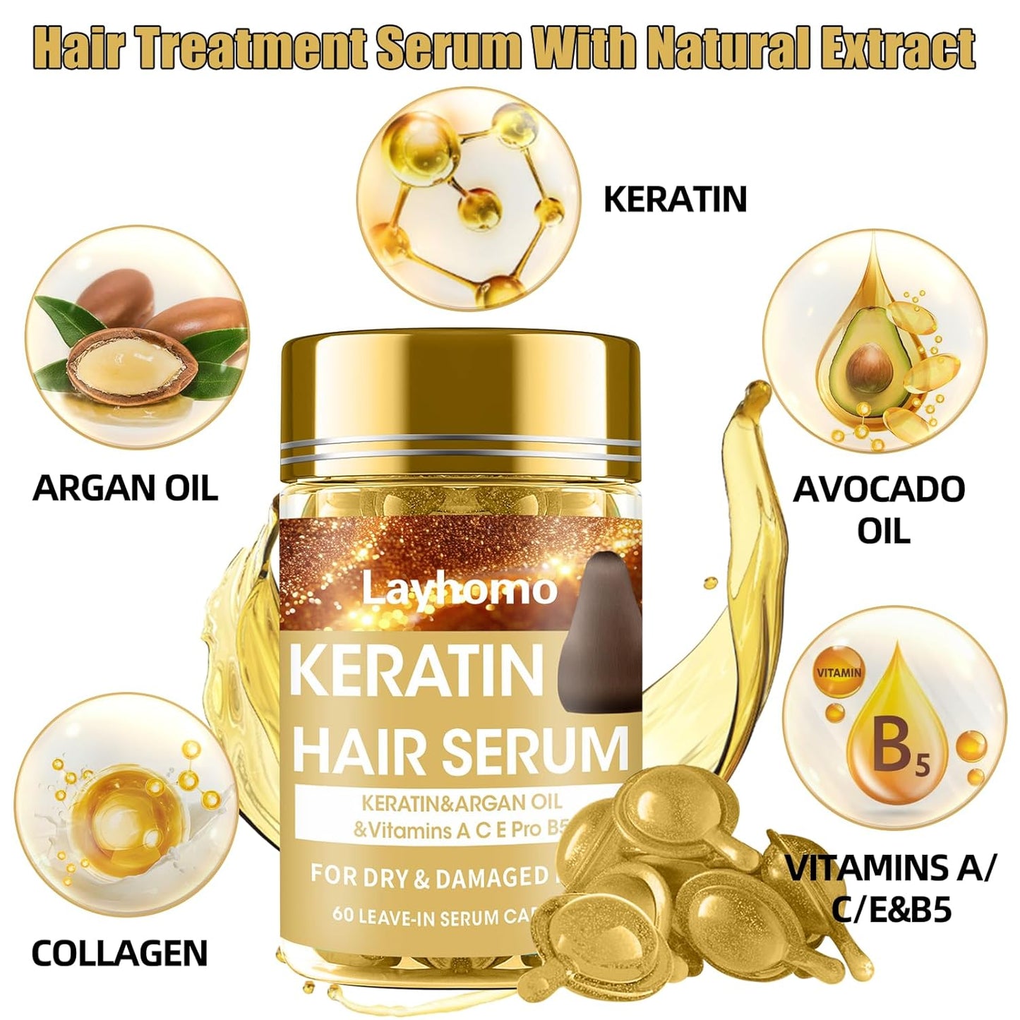 Keratin Hair Treatment Serum,60 Capsules Hair Treatment Oil for Dry Damaged Hair,Hair Oil with Keratin,Argan Oil-Leave-in Anti Frizz Conditioner with Vitamins A, C, E & B5- No Rinse for All Hair Types