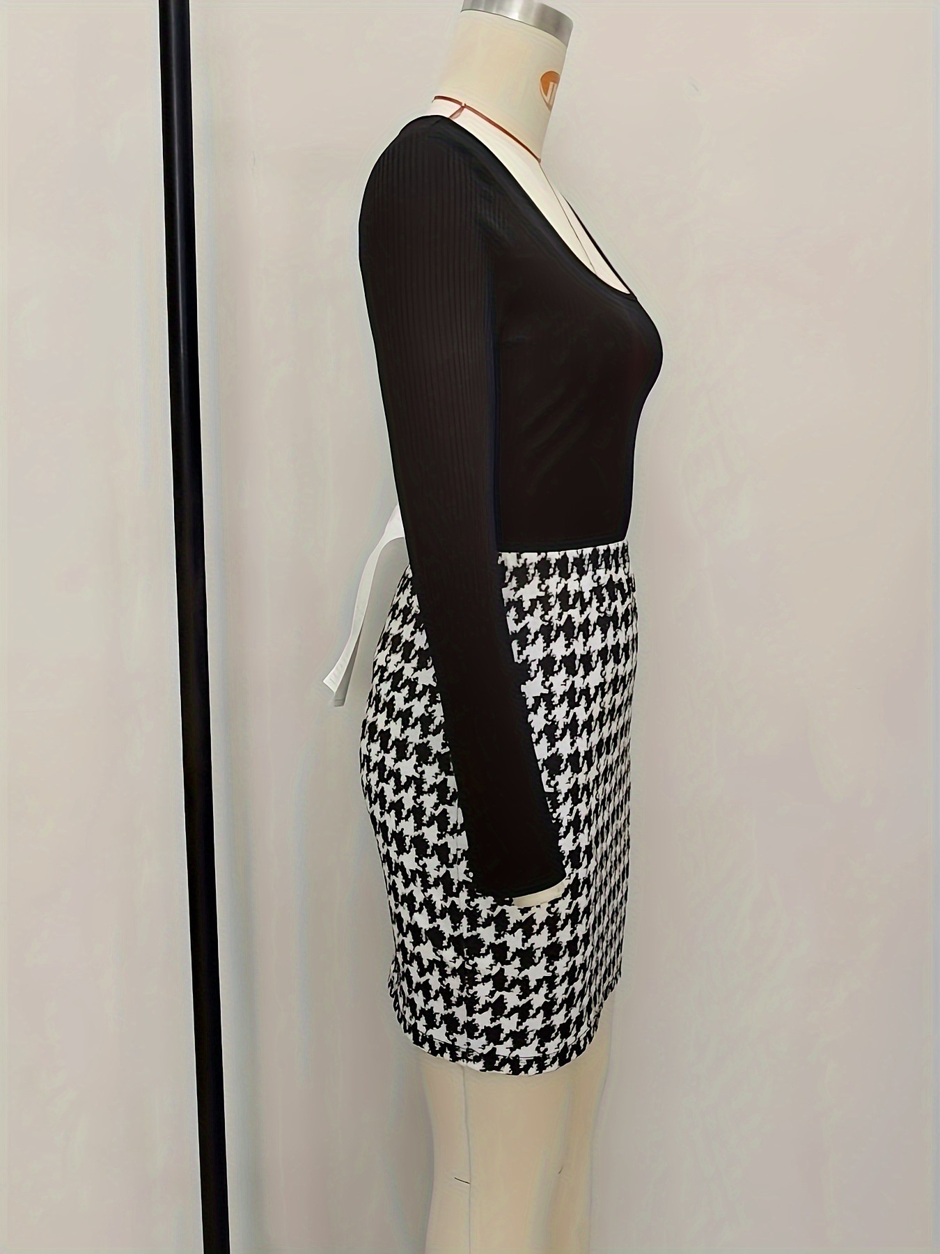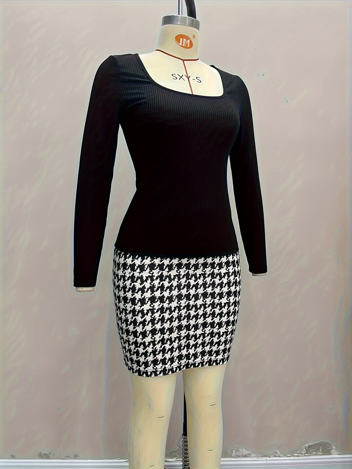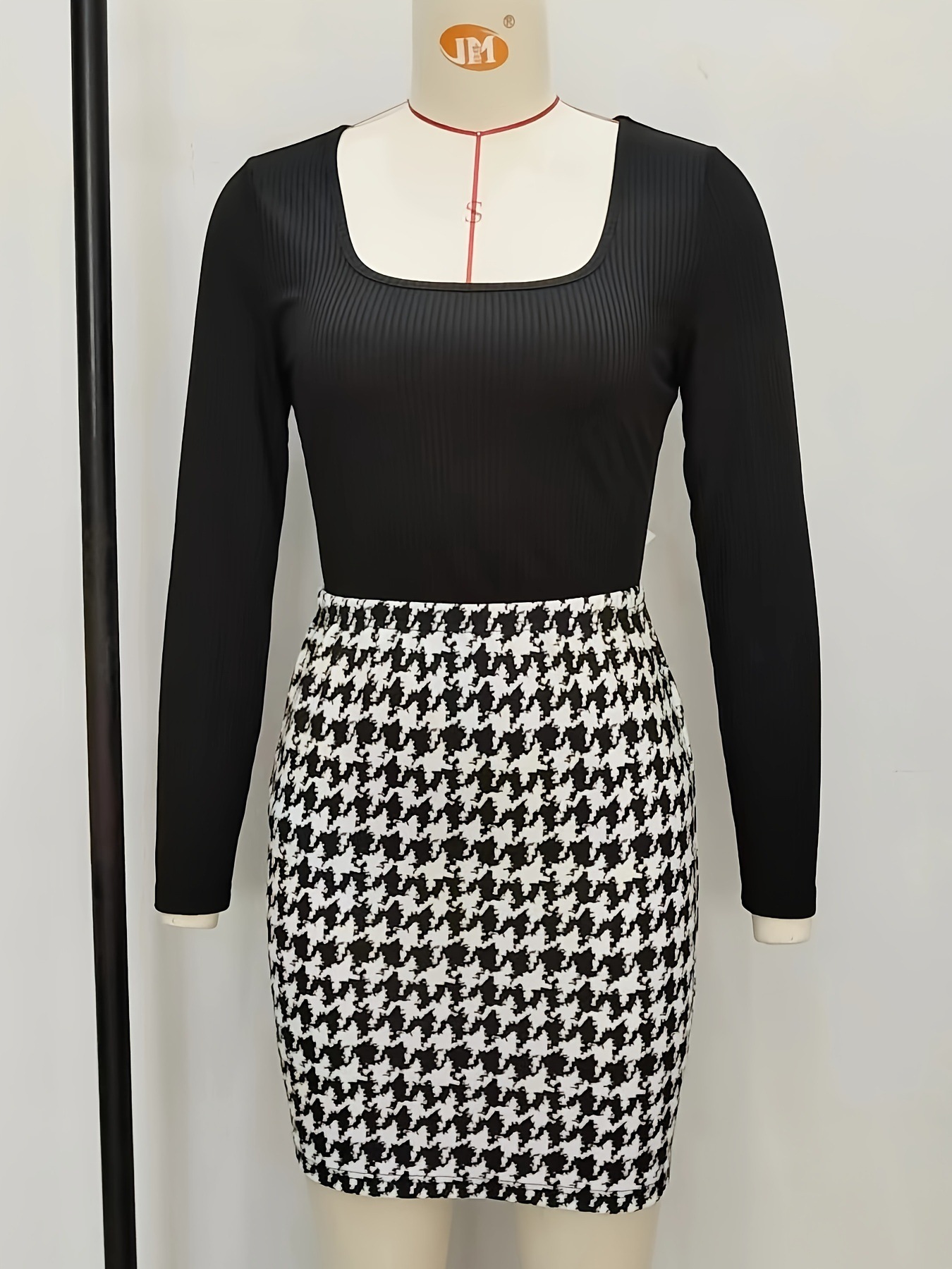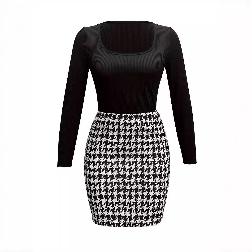 Knitted Long Sleeved Bottoming Shirt Printed Sheath Skirt Autumn Winter Stretch All Matching Two Piece Set Women