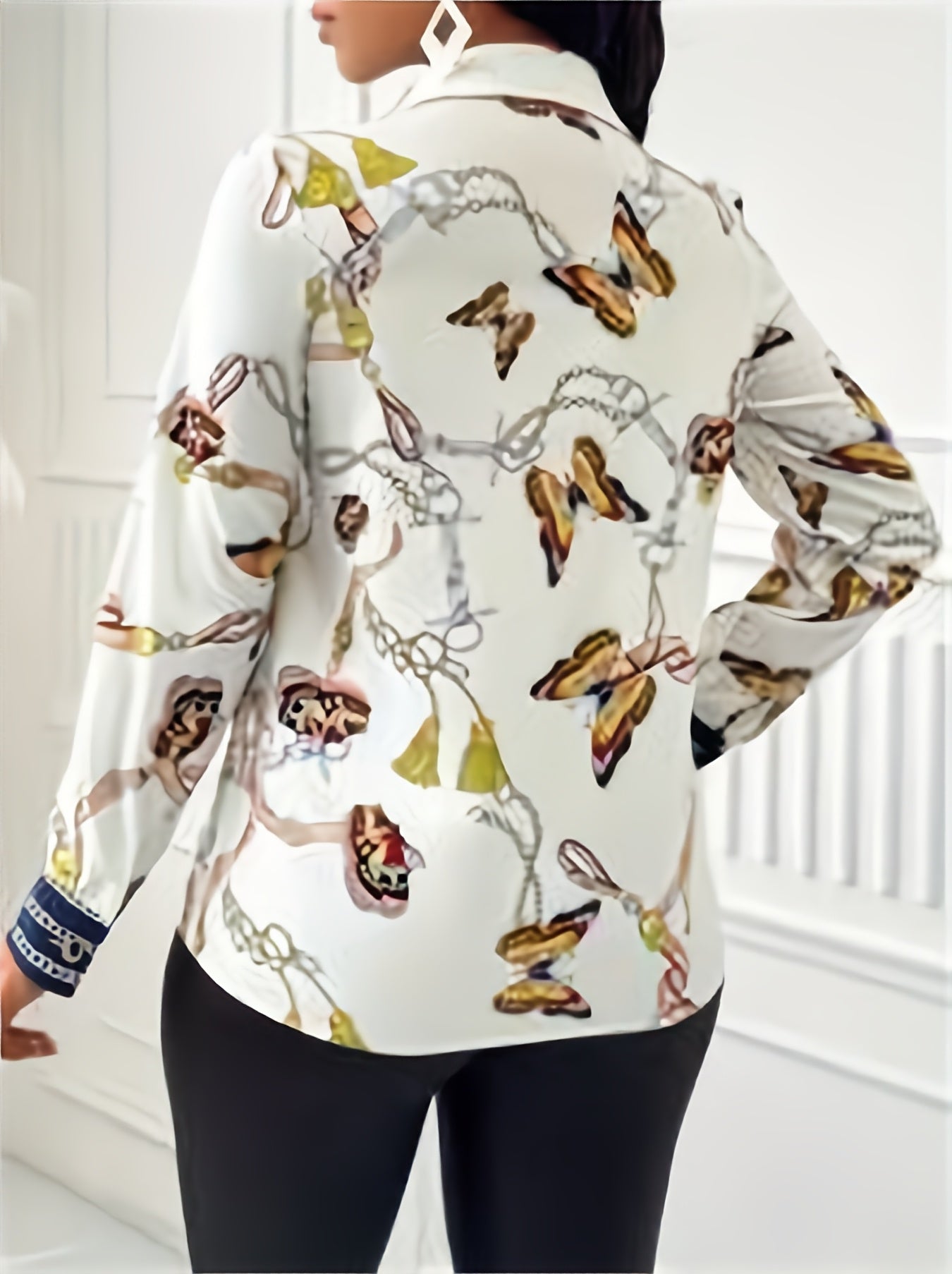Ladies Elegant Butterfly Print Single Breasted Lapel Long-sleeved Shirt, Spring And Summer Casual All-match Loose Comfortable Blouse, Polyester Fiber, Women'S Wear