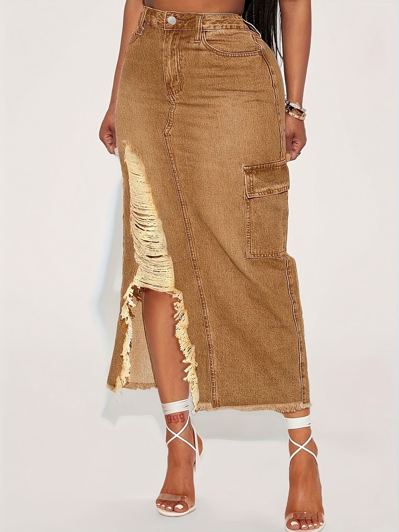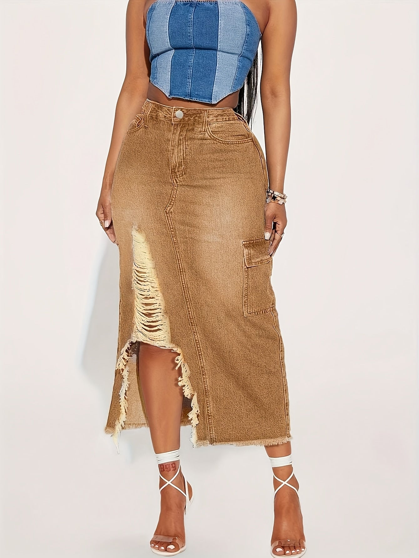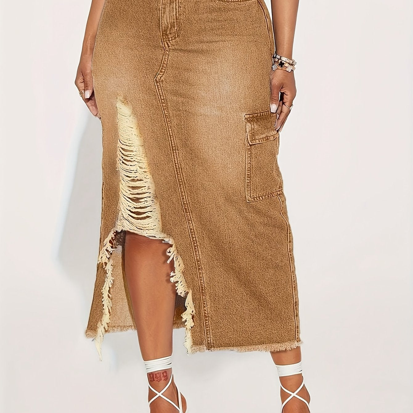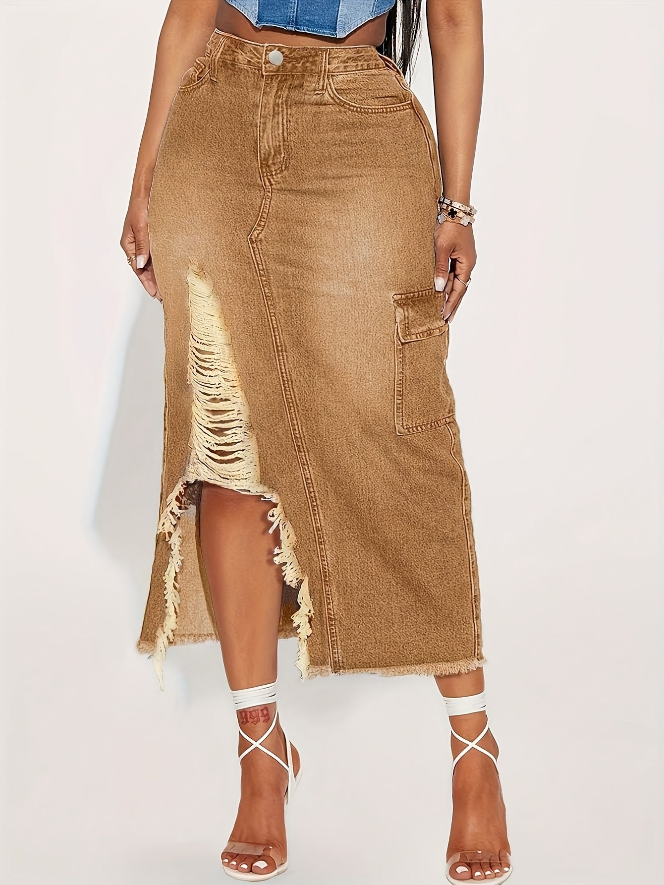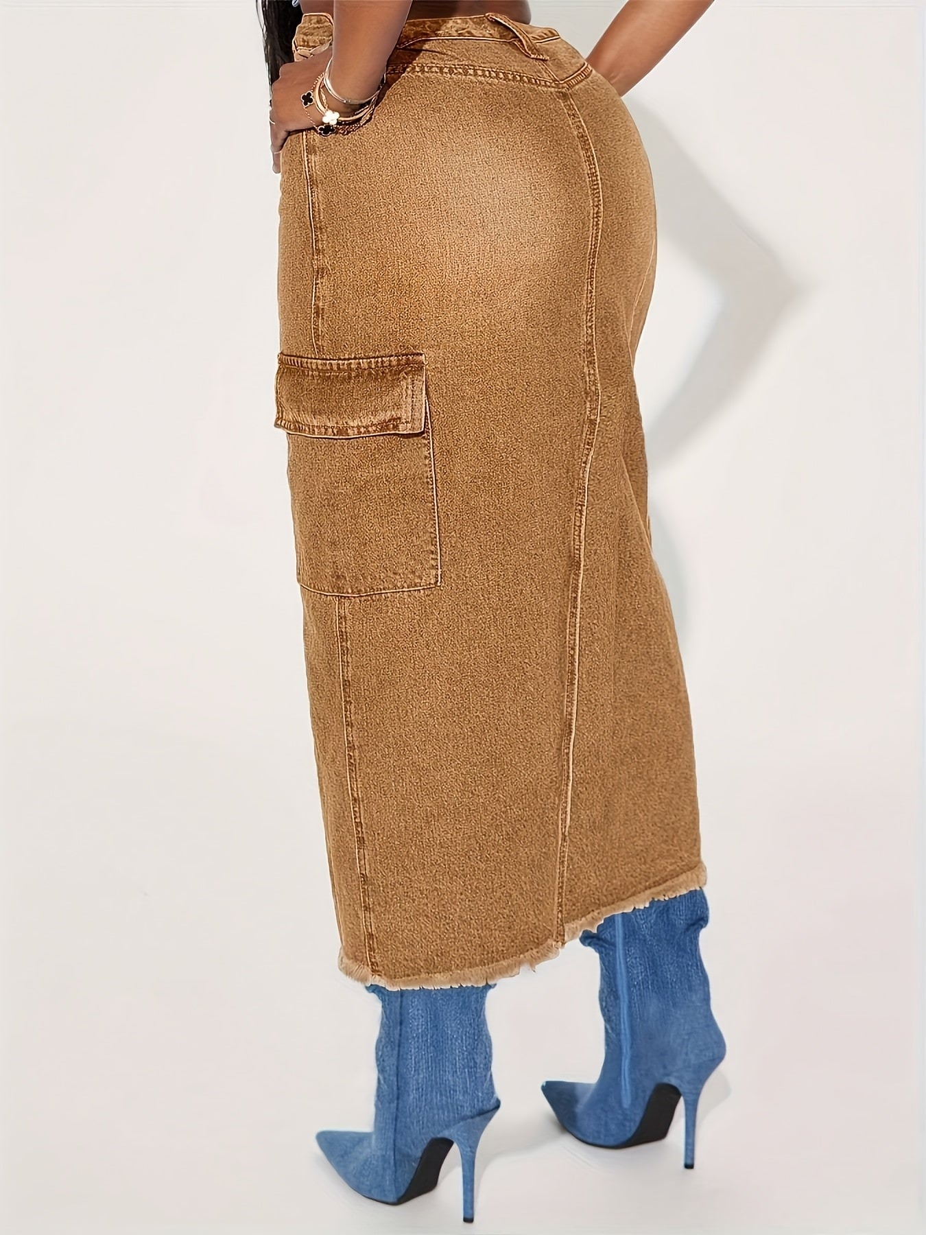 Ladies' Fashionable Fringed Denim Skirt, High Waisted Casual Loose Pencil Skirt, Practical Pocket, Machine Washable