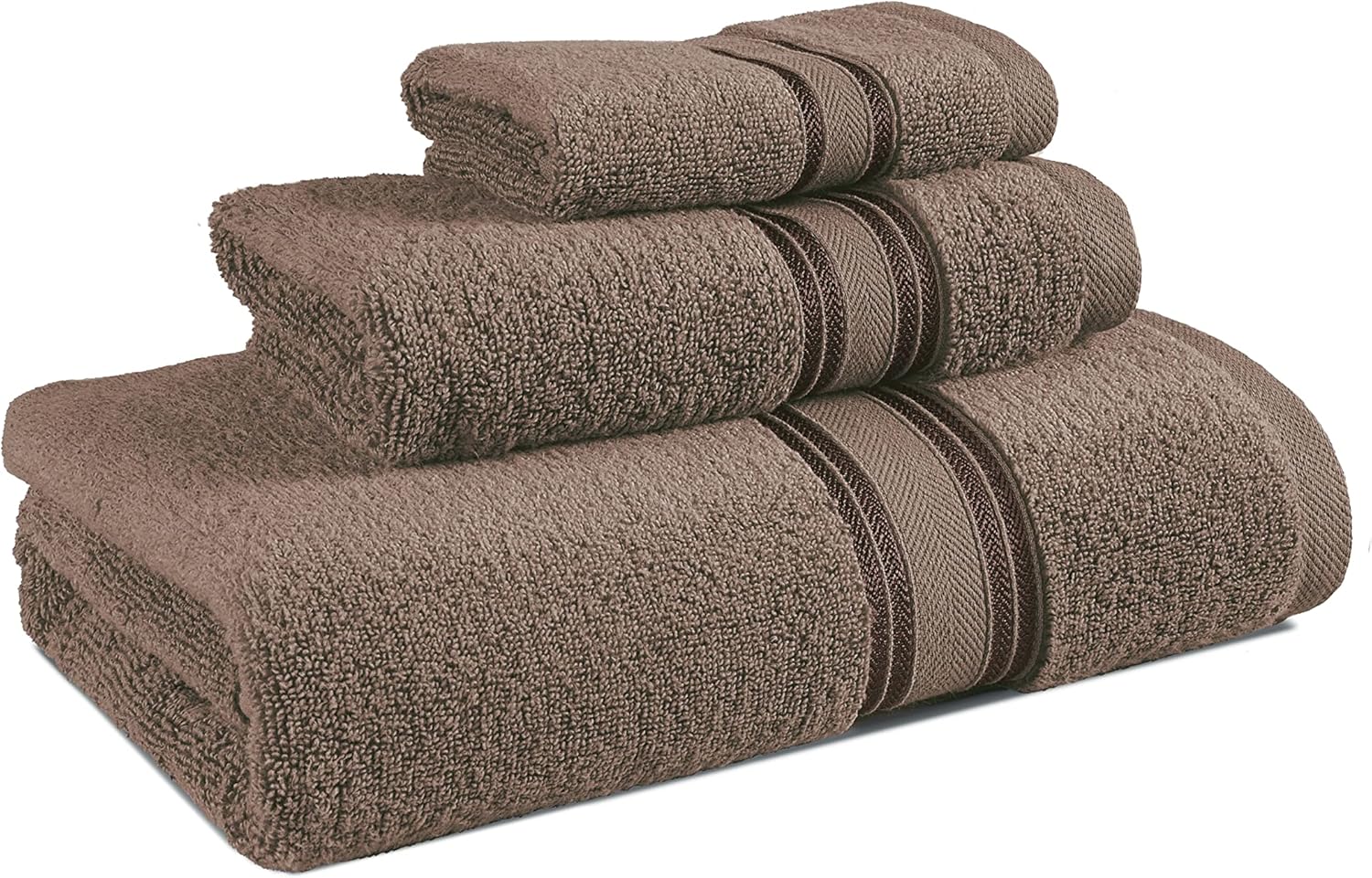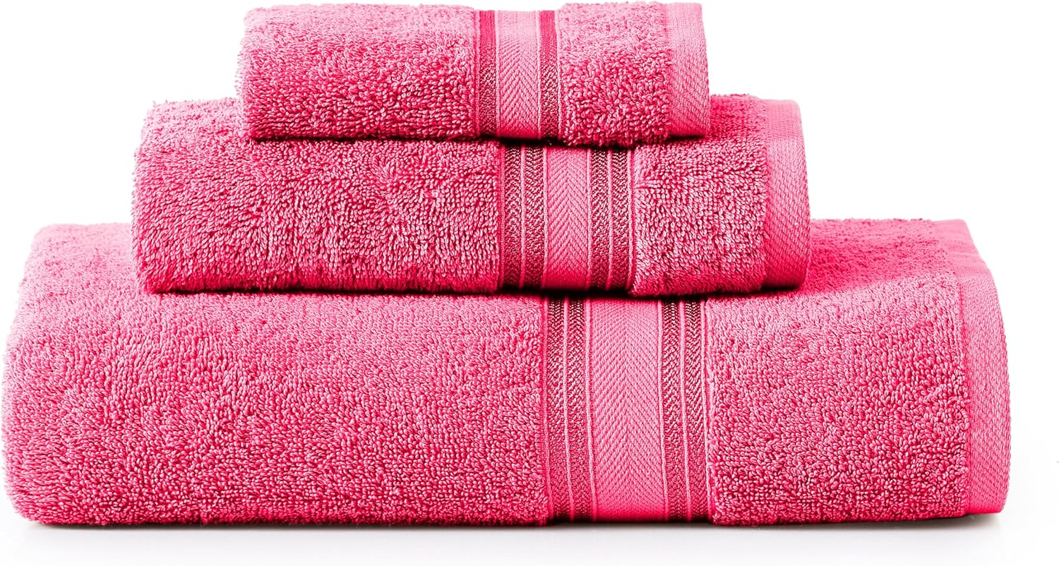 Each 3 Piece Towel Set includes : 1 Bath Towel - 28" x 54" , 1 Hand Towel - 16" x 28" and 1 Wash Cloth - 13" x 13". Crafted from premium Cotton, each bath towel, hand towel, and wash towel promises to be soft on your skin to keep you warm and dry after you step out of the shower.