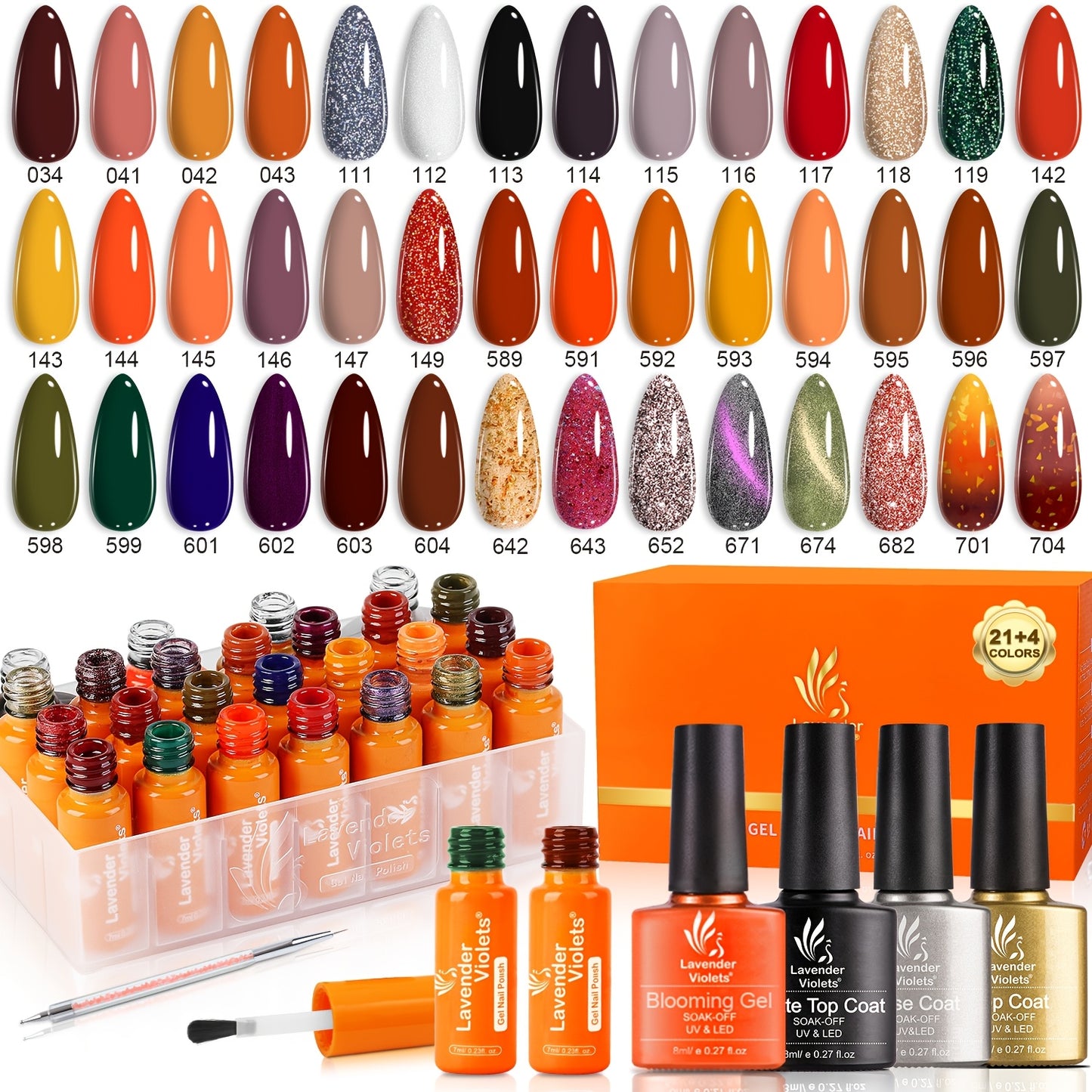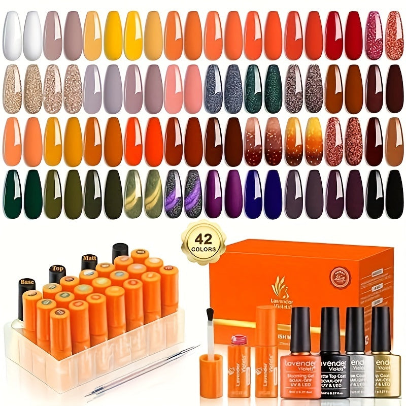 Lavender Violets 53 Pcs Gel Nail Polish Kit, 42 Colors Orange Red Pearl White Green Brown Cat Eye LED Nail Polish Set with Blooming Glossy Matte Top Coat and Gel Liner Brush