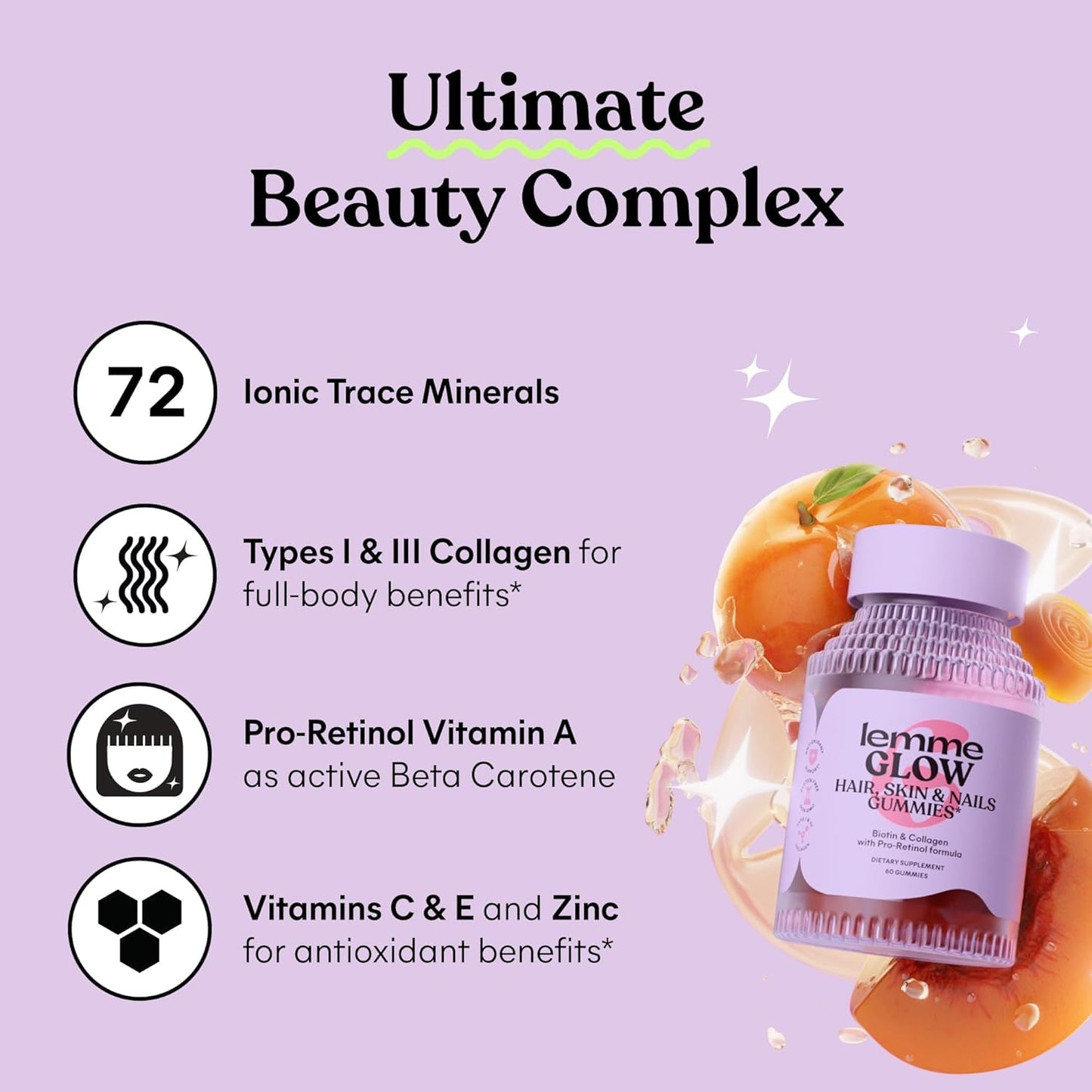Lemme Glow Collagen Gummies for Thick Hair, Strong Nails & Healthy Skin with Multi-Collagen Peptides, Biotin, Trace Minerals, Zinc, Vitamins A, C & E, Dairy & Gluten Free, Peach Flavor, 60 ct.