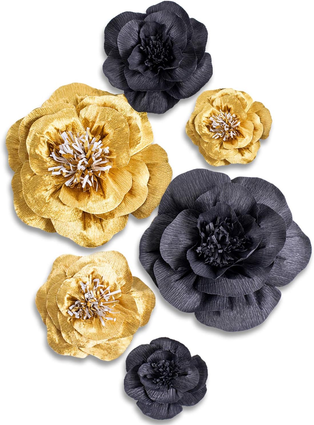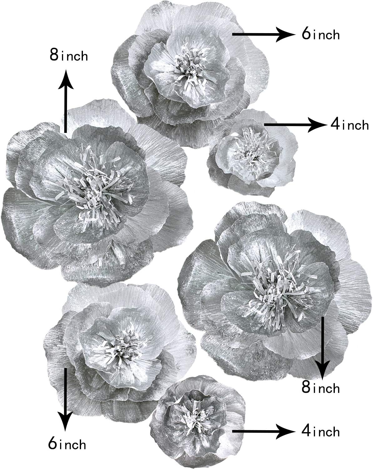 These flowers are hand made, size may differ slightly. Flowers are pack folded, you only need to open it as far as possible. Package include 2 flower 8" diameter / 2 flower 6" diameter / 2 flower 4" diameter.