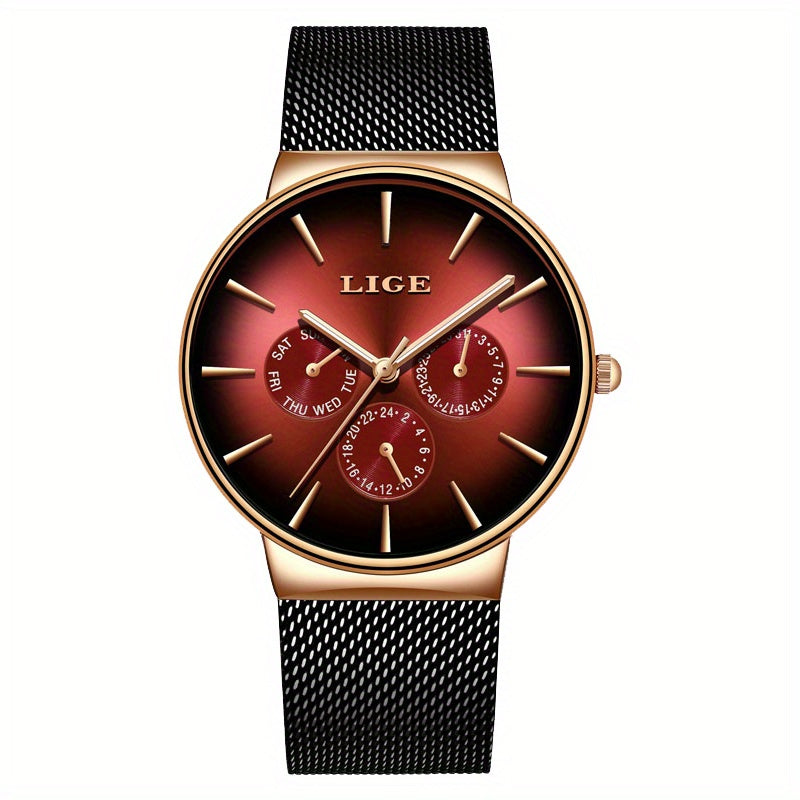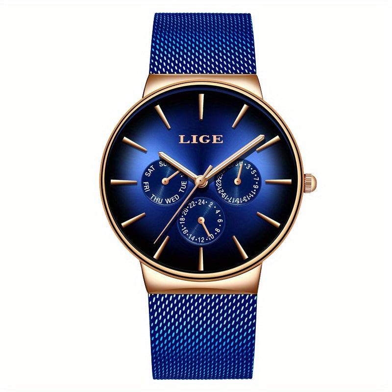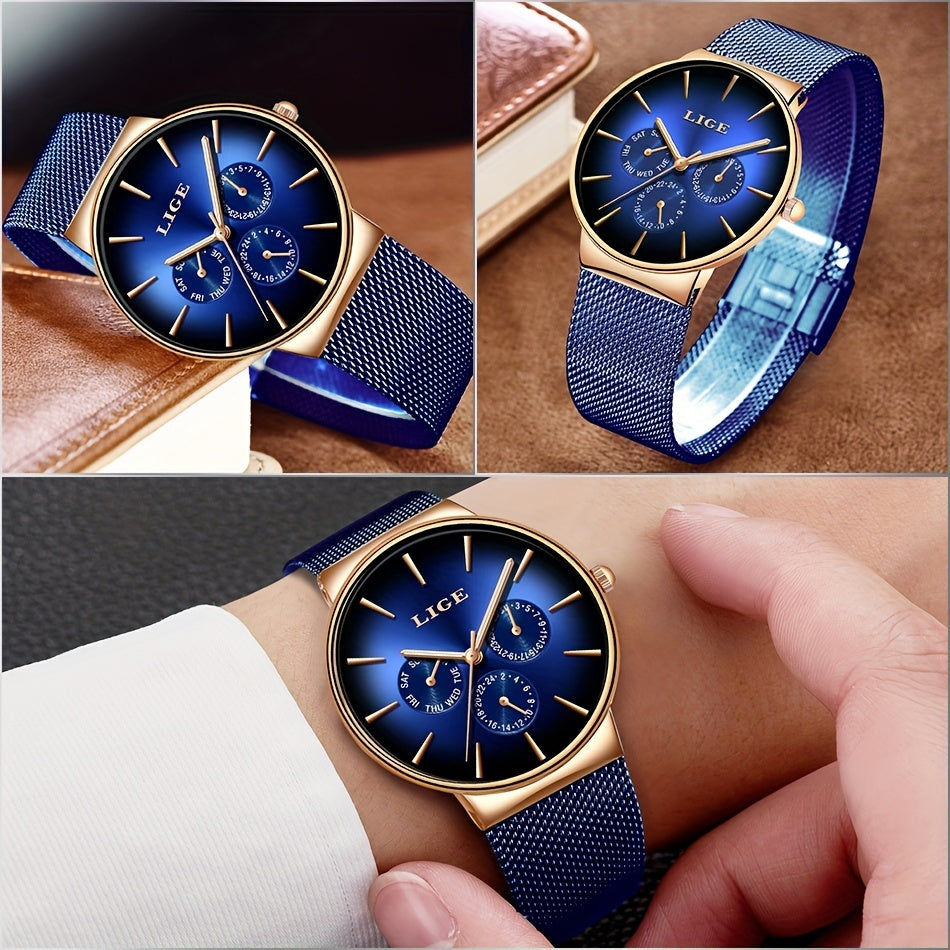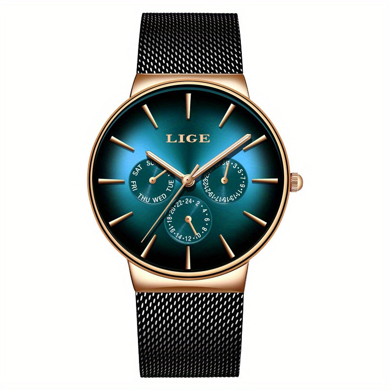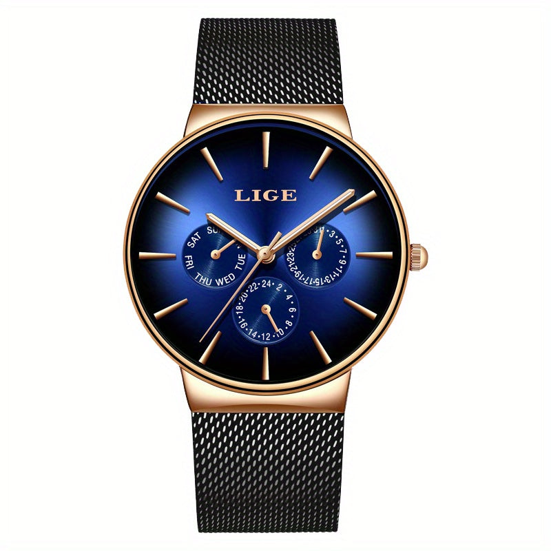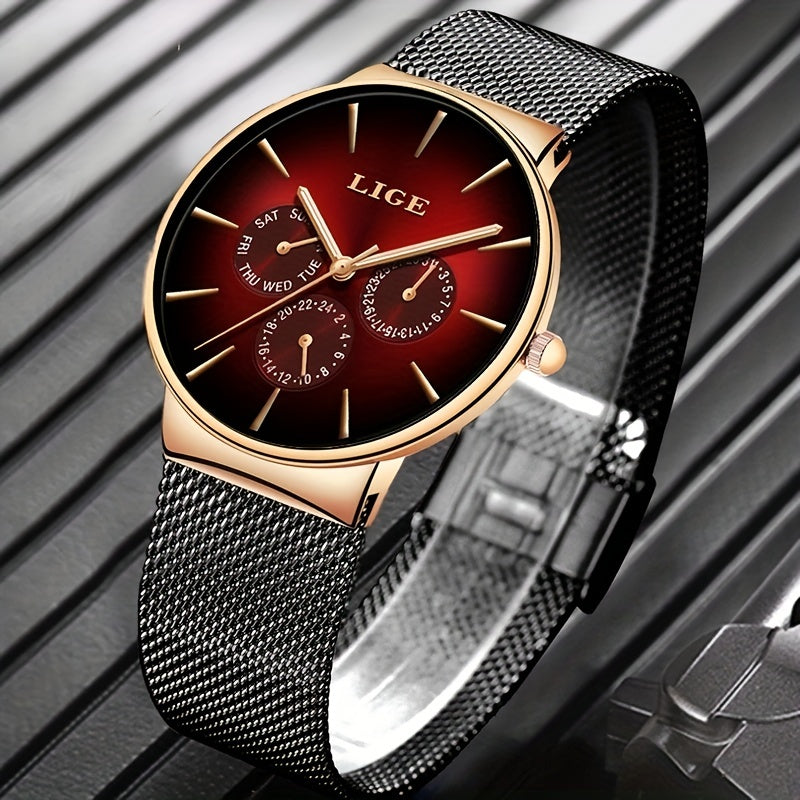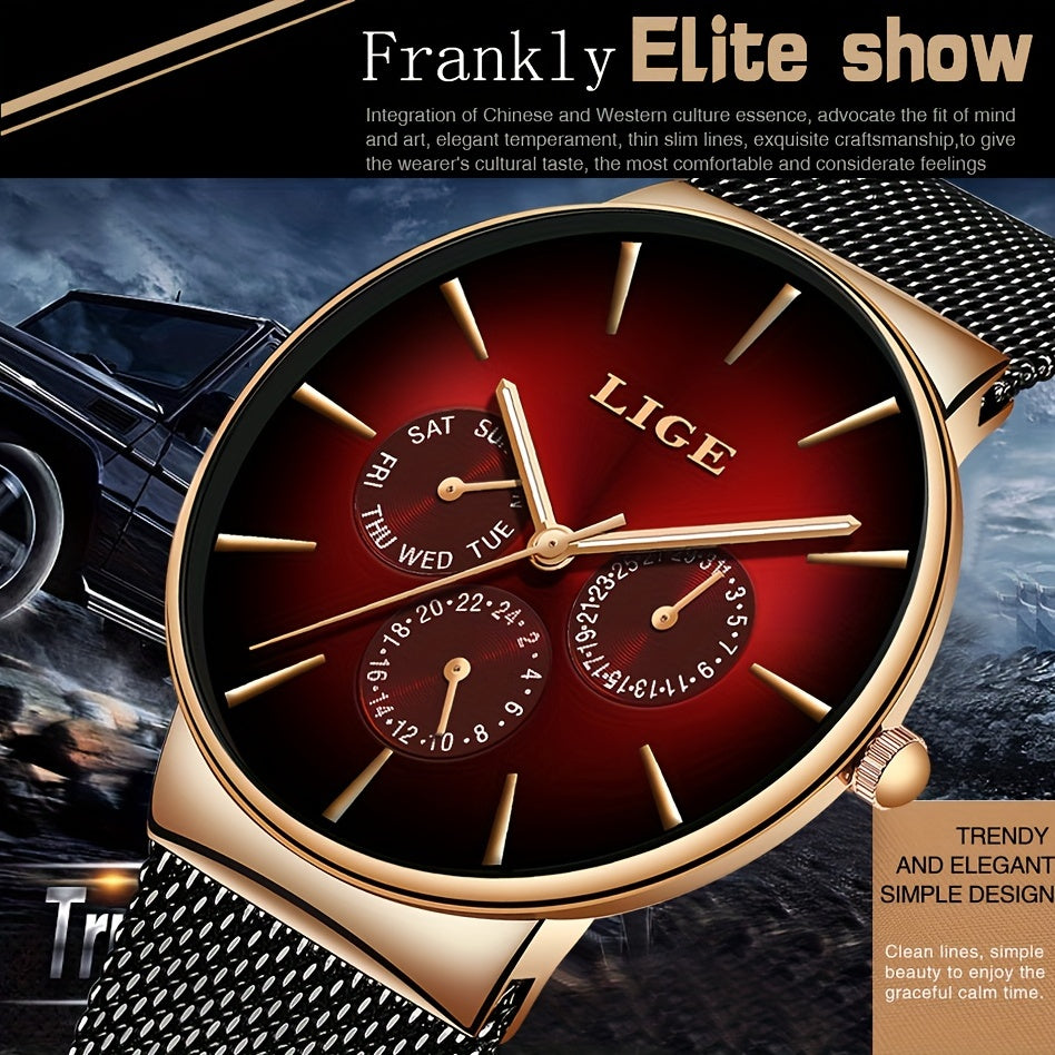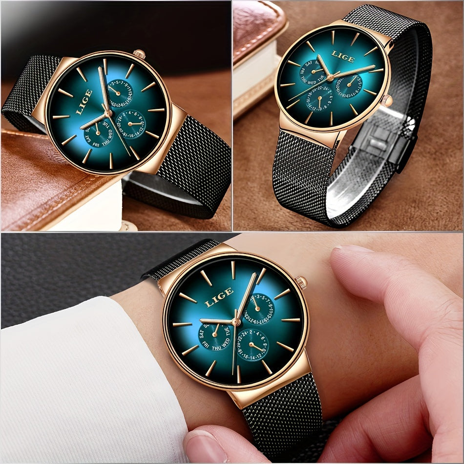 LIGE Fashion Men's Watch Top Brand Luxury Quartz Watch, Men's Mesh Steel Ultra-thin Men's Sports Watch Multi-Functional Movement Visual Calendar Week 24 Hours, Ideal choice for Gifts