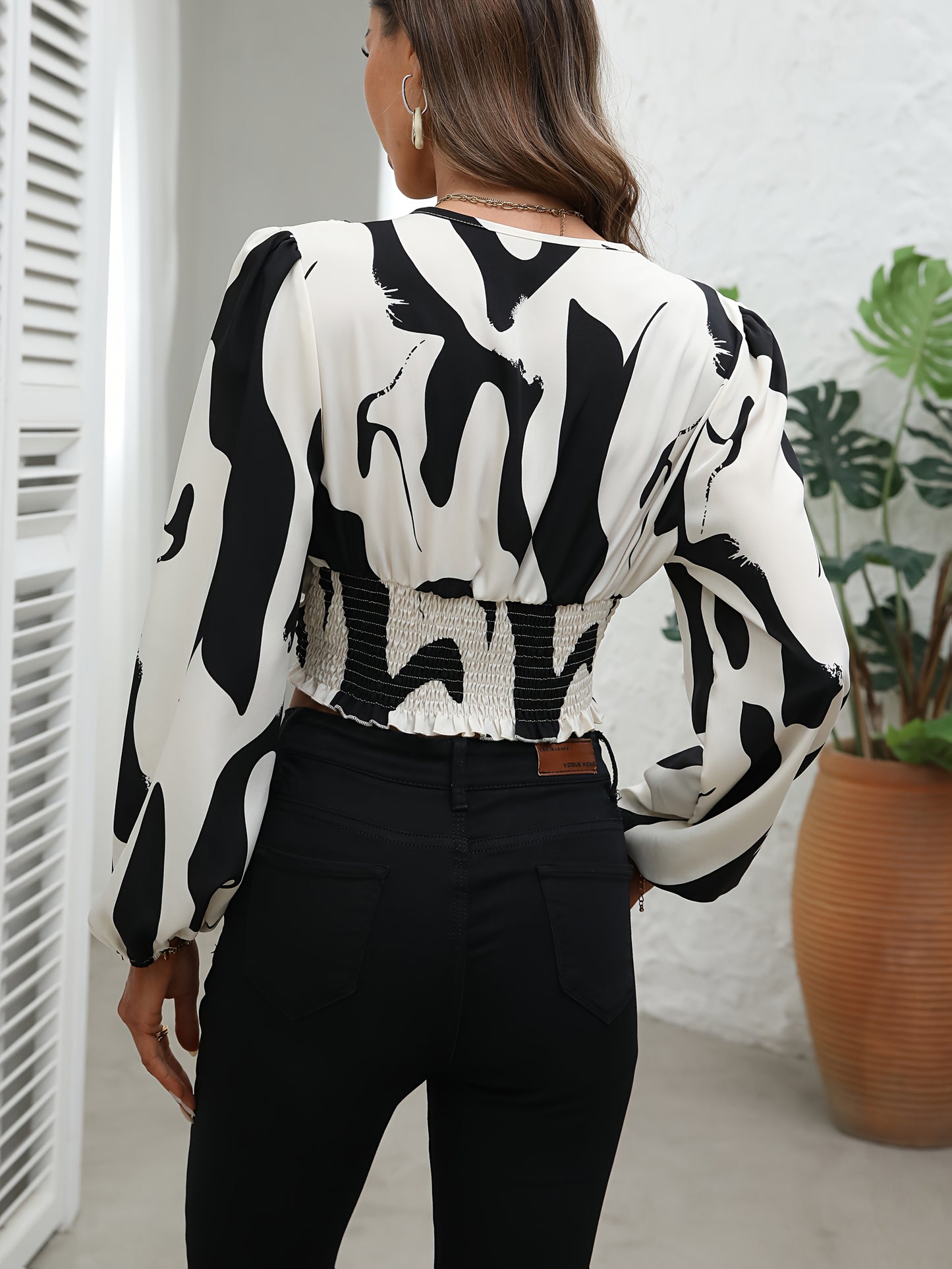 Lightweight Design] Women's Elegant Geometric Print V-Neck Blouse with Lantern Sleeves and Ruched Waist - Polyester, Machine Washable, Perfect for Spring/Fall Fashion