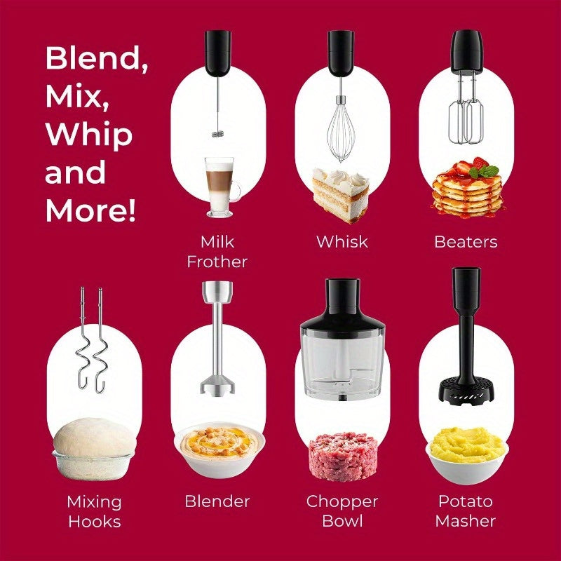 Living Immersion Hand Blender Full Set - Cordless-like operation, 8-Speed Immersion Blender with 7 Attachments (Whisk, Frother, Beater, Masher, Chopper, Mixing Hooks), Stainless Steel Blade & Turbo Mode for Soup, Batter, Mashed Potatoes, Smoothies - Light