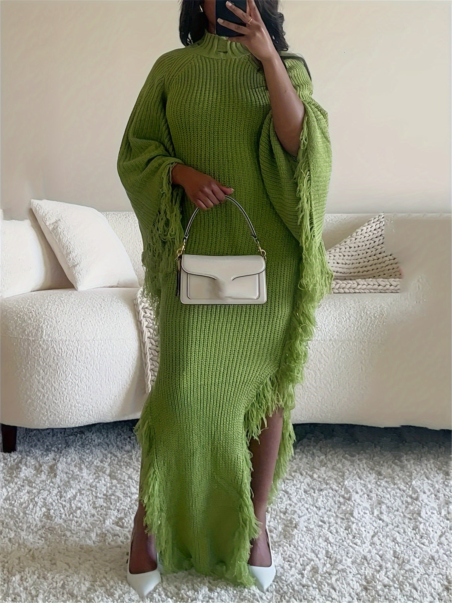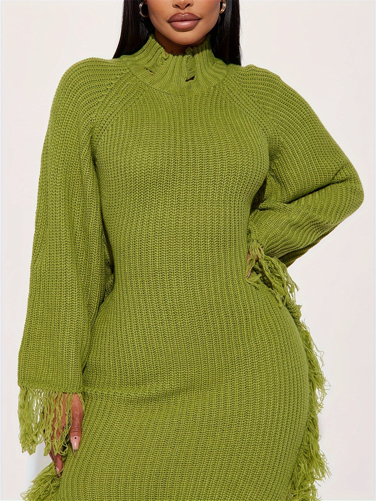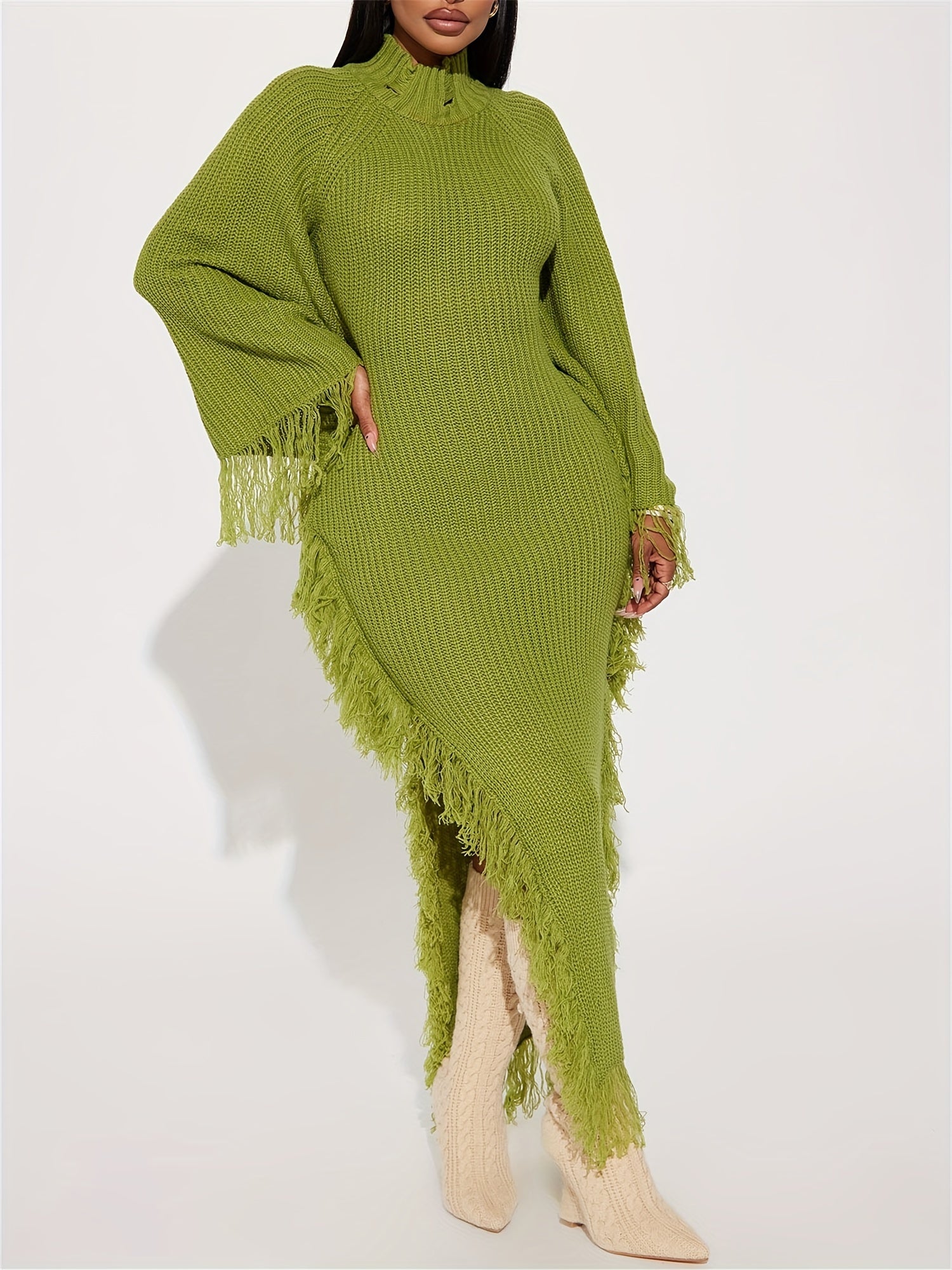Long Sleeve Batwing Fringe Trim Sweater Dress For Women, High Neck Maxi With Asymmetrical Hem, Sexy And Chic Style, For Fall Winter 2024