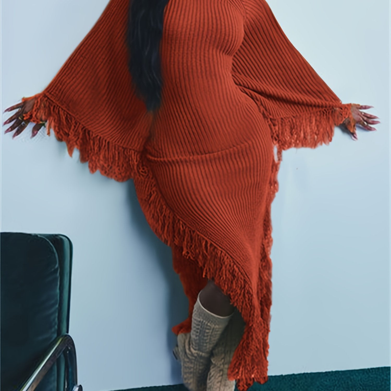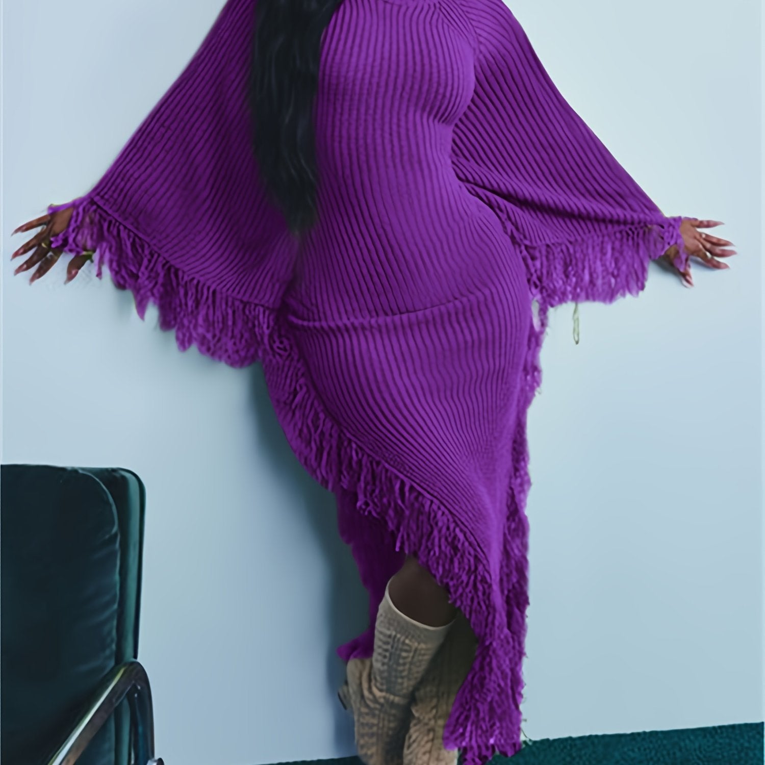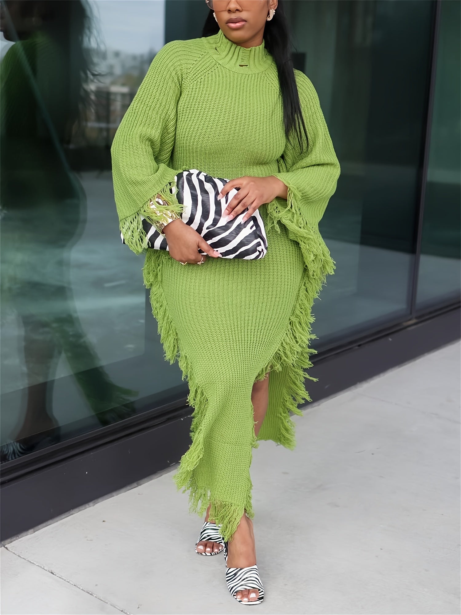 Long Sleeve Batwing Fringe Trim Sweater Dress For Women, High Neck Maxi With Asymmetrical Hem, Sexy And Chic Style, For Fall Winter 2024
